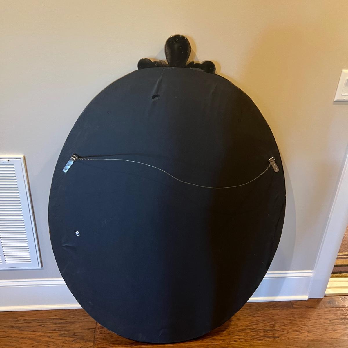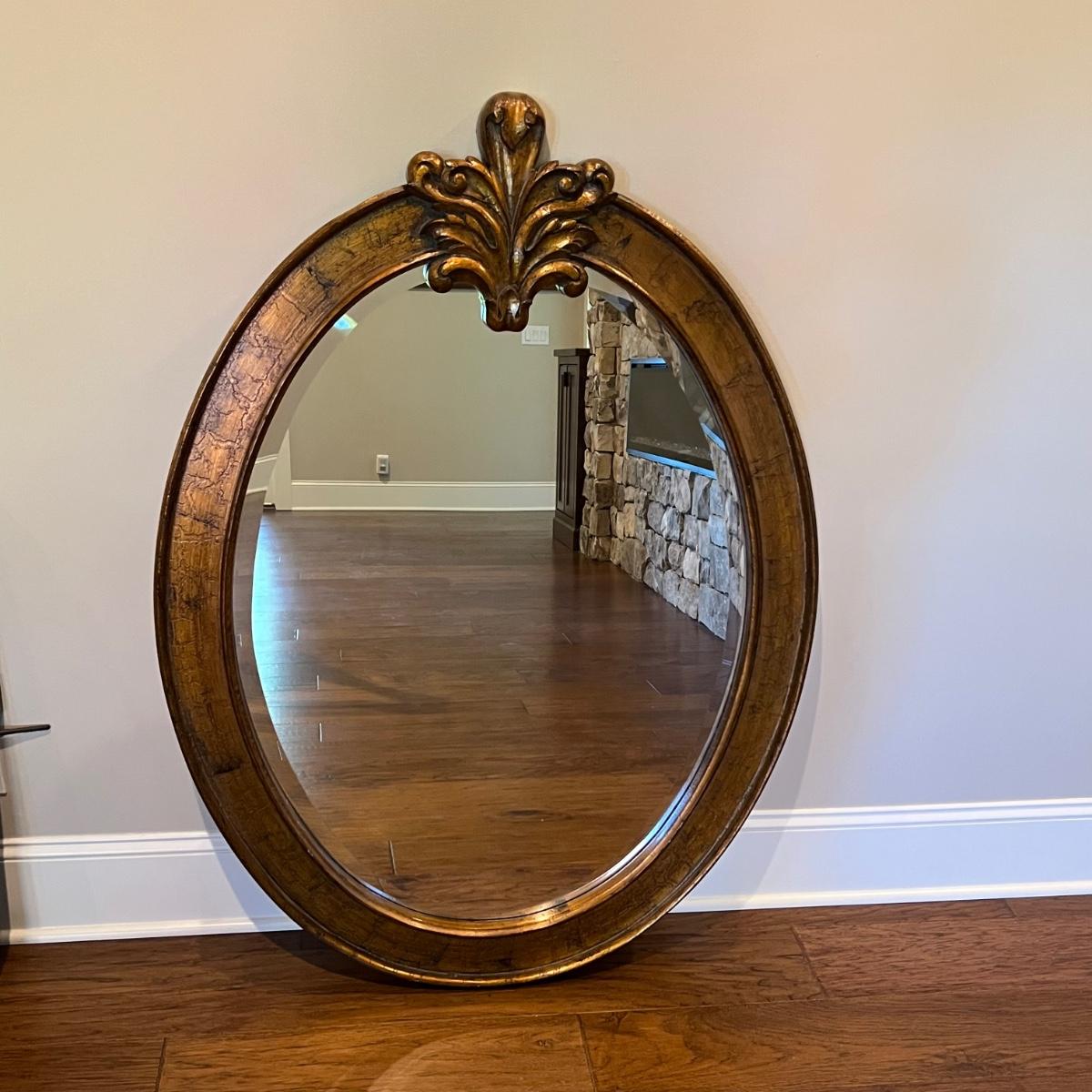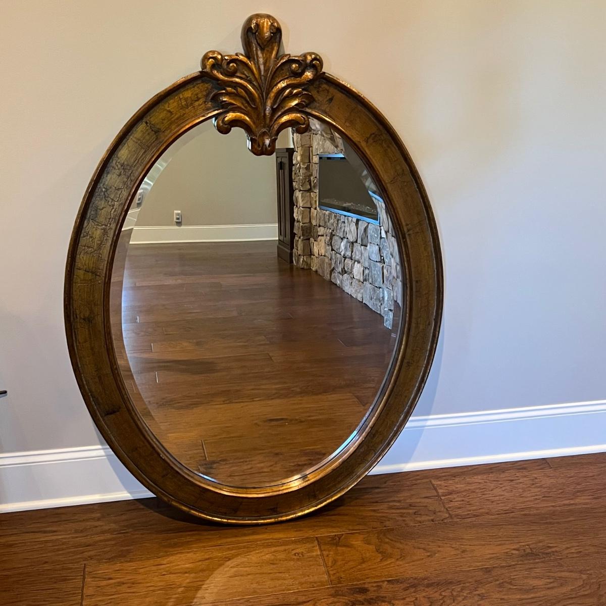 This large attractive mirror has an oval shaped frame that appears to be wood with a copper colored finish. Glass is beveled and durable hanging hardware is in place to hang this heavy mirror.
