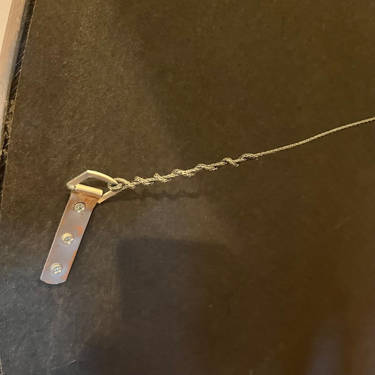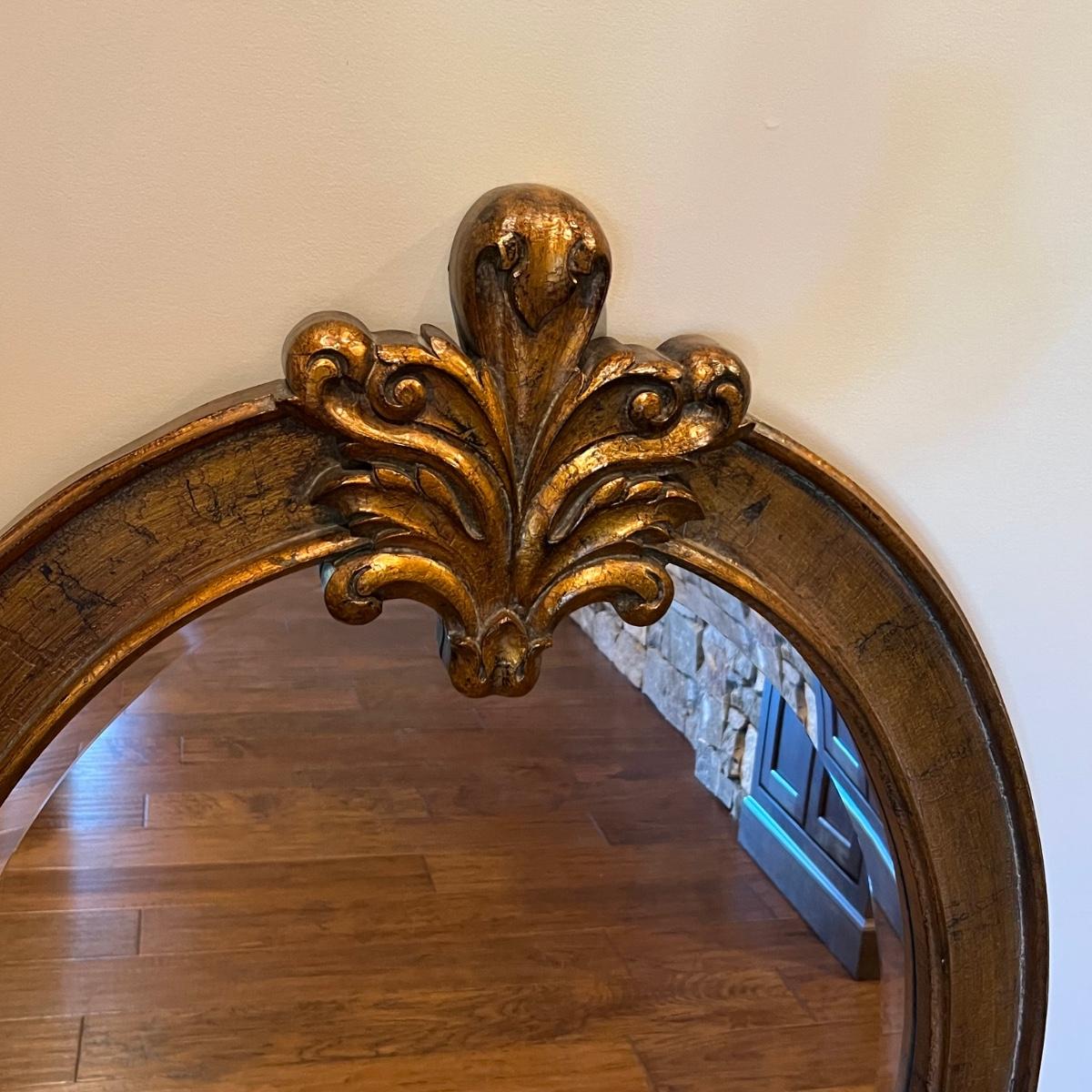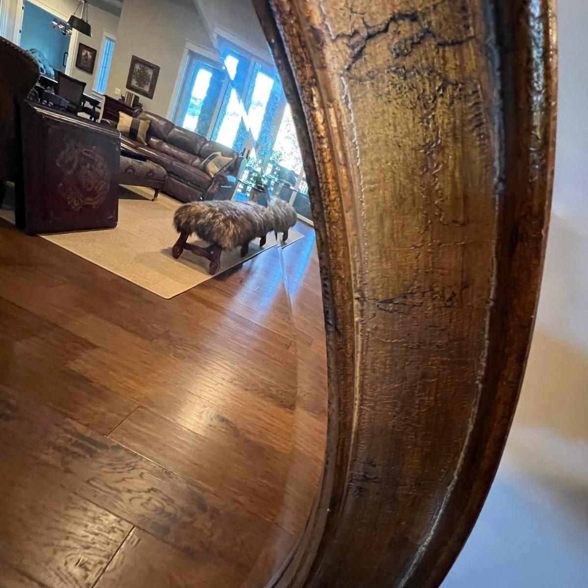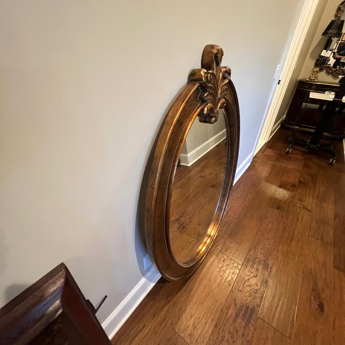 This large attractive mirror has an oval shaped frame that appears to be wood with a copper colored finish. Glass is beveled and durable hanging hardware is in place to hang this heavy mirror.