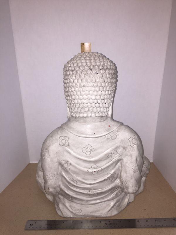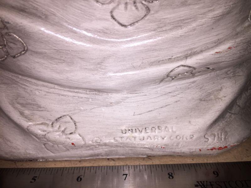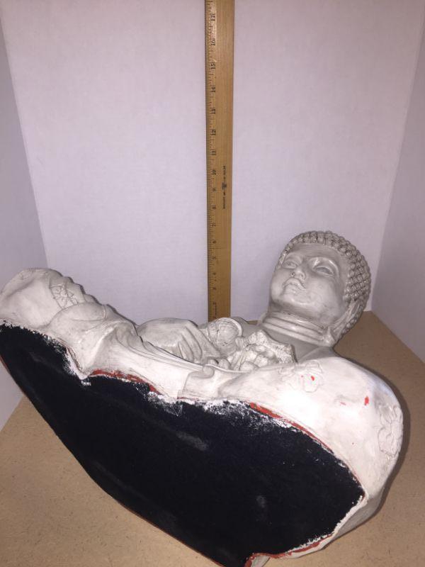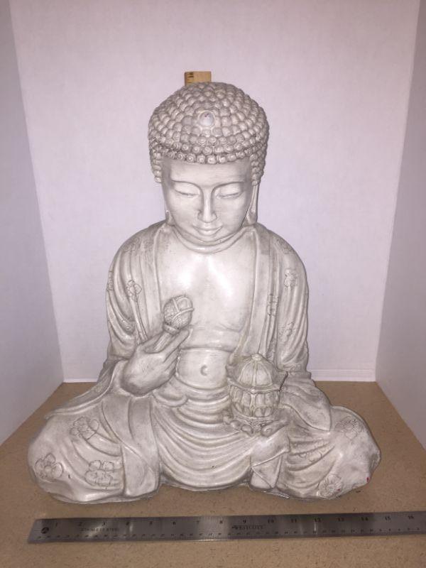 Vintage C. 1962 Universal Statuary Corp #5742. This buddha was originally a crimson color and has been painted gray with attention to shading giving it the look of concrete/stone. Measures 16"w x 9"d x 17"t. Very handsome in person!