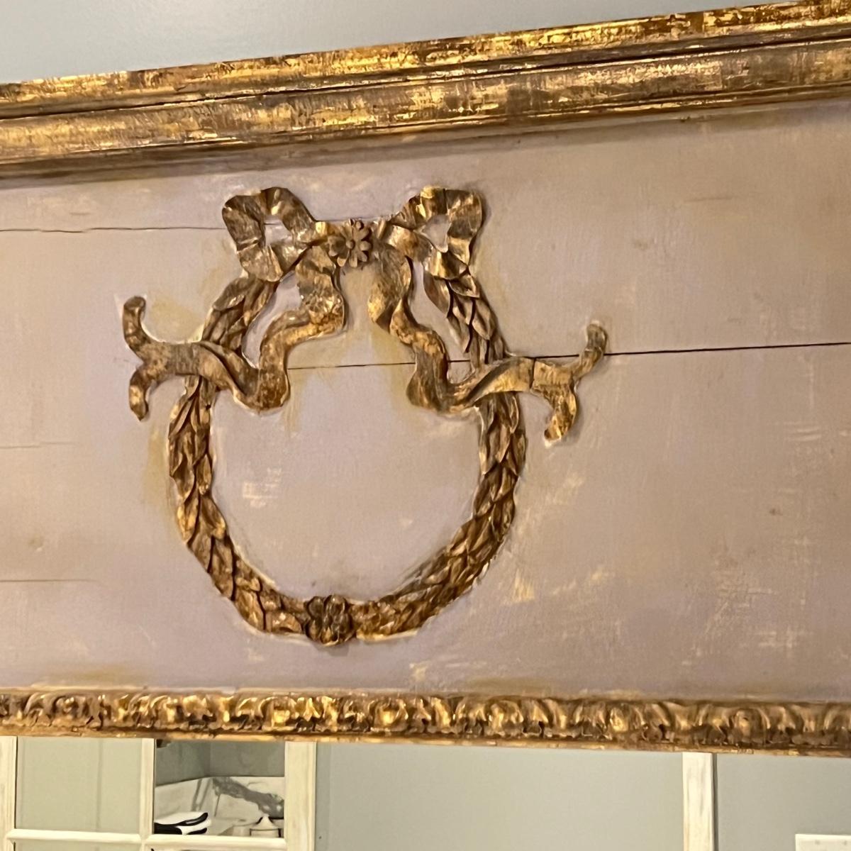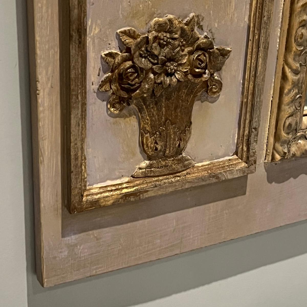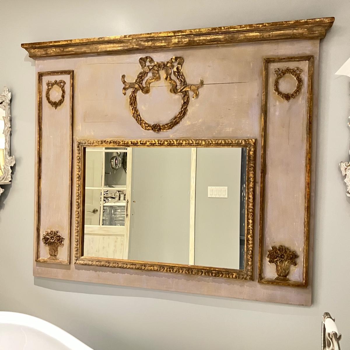 This lovely large mirror is painted wood with gold painted frame. It measures 54” x 48”H and is 3” deep at the top of the frame. Note that there are a few light cracks in the wood, see images.