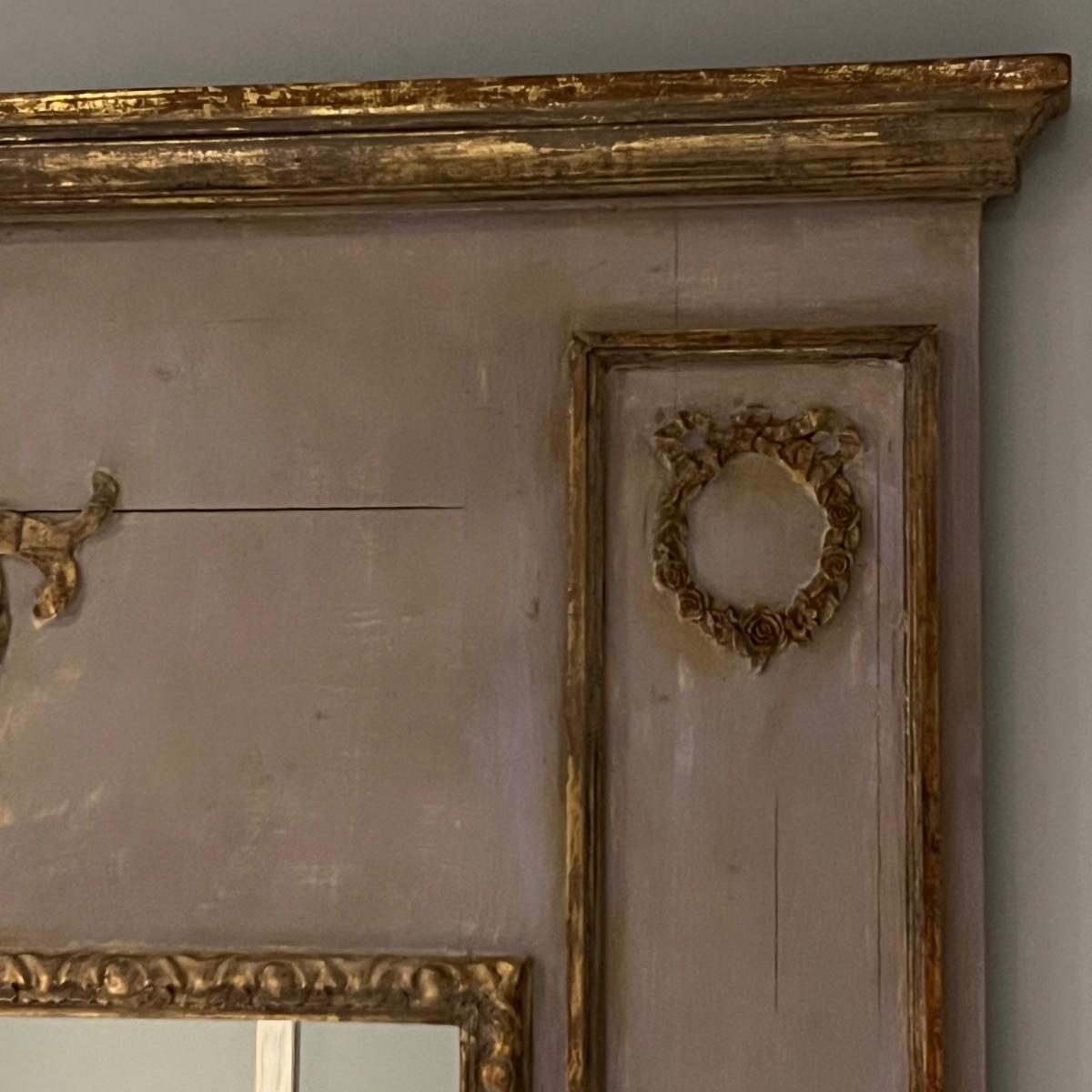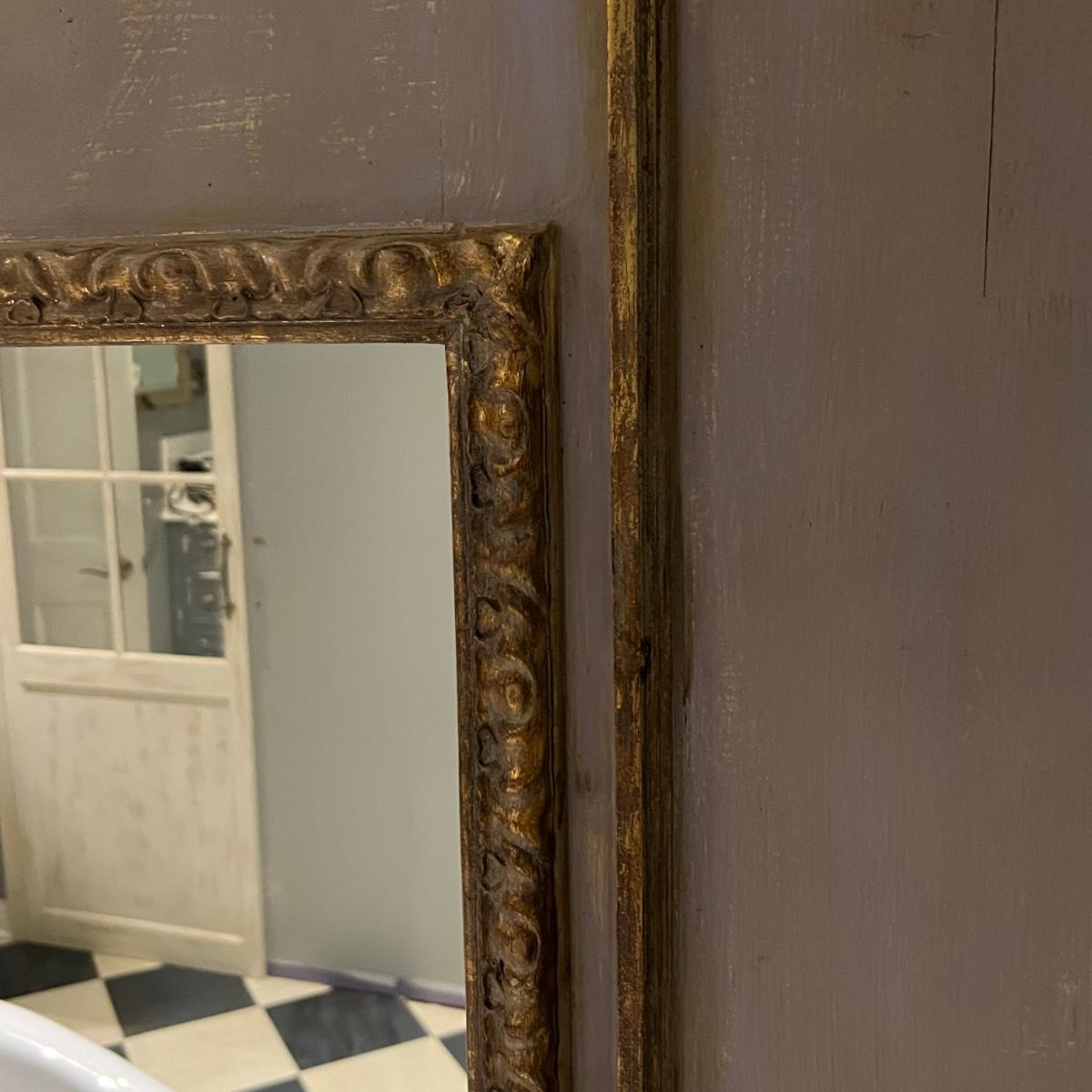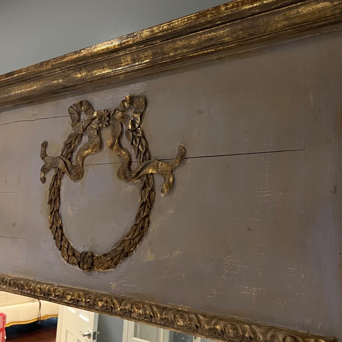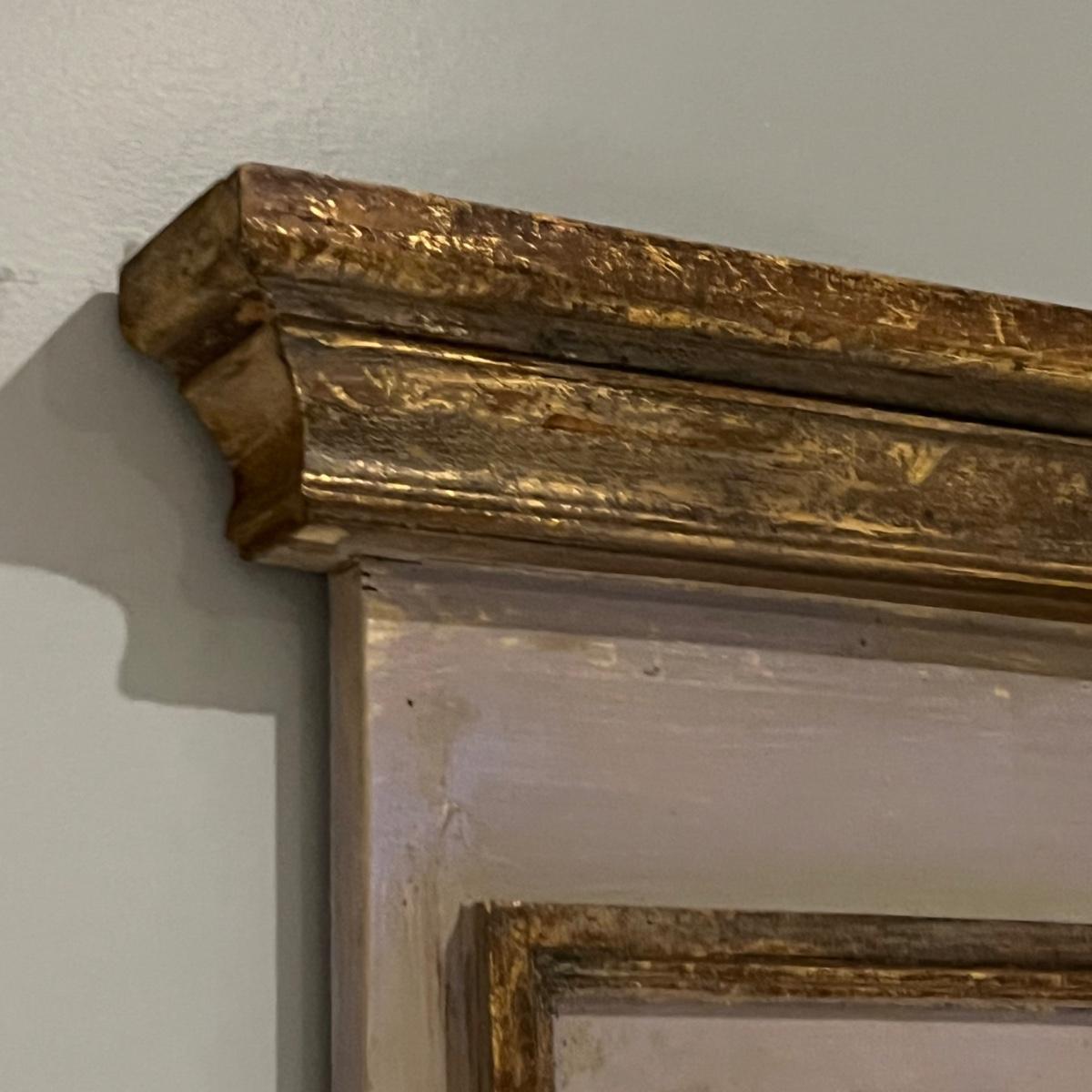 This lovely large mirror is painted wood with gold painted frame. It measures 54” x 48”H and is 3” deep at the top of the frame. Note that there are a few light cracks in the wood, see images.