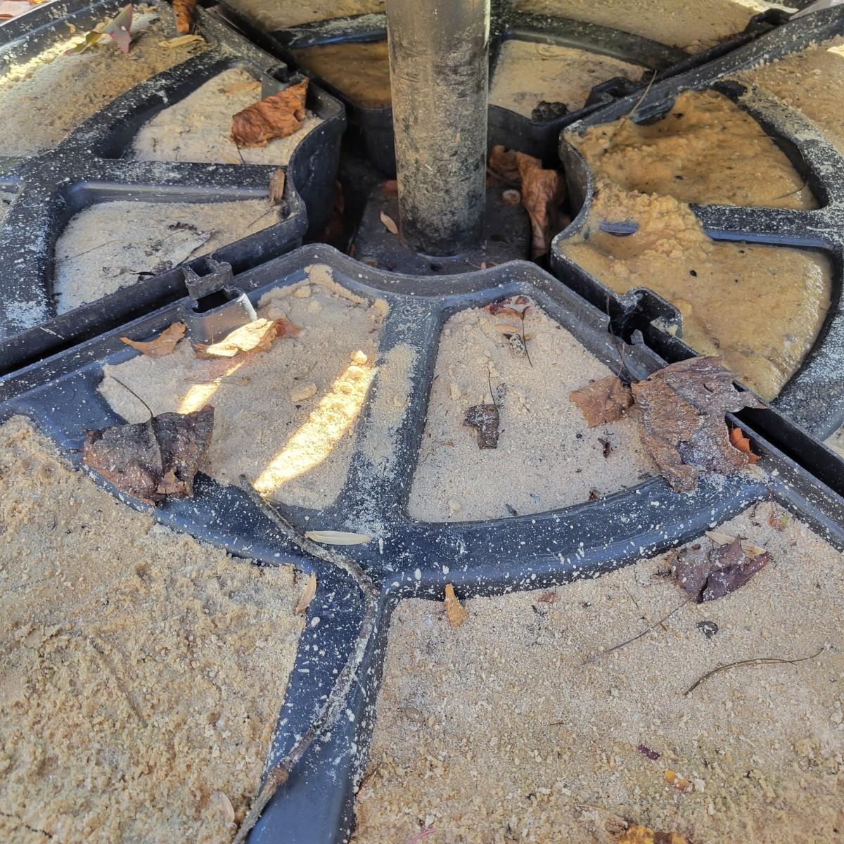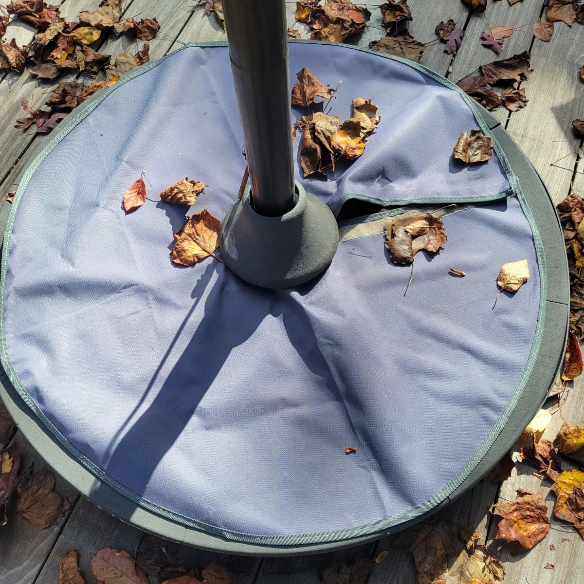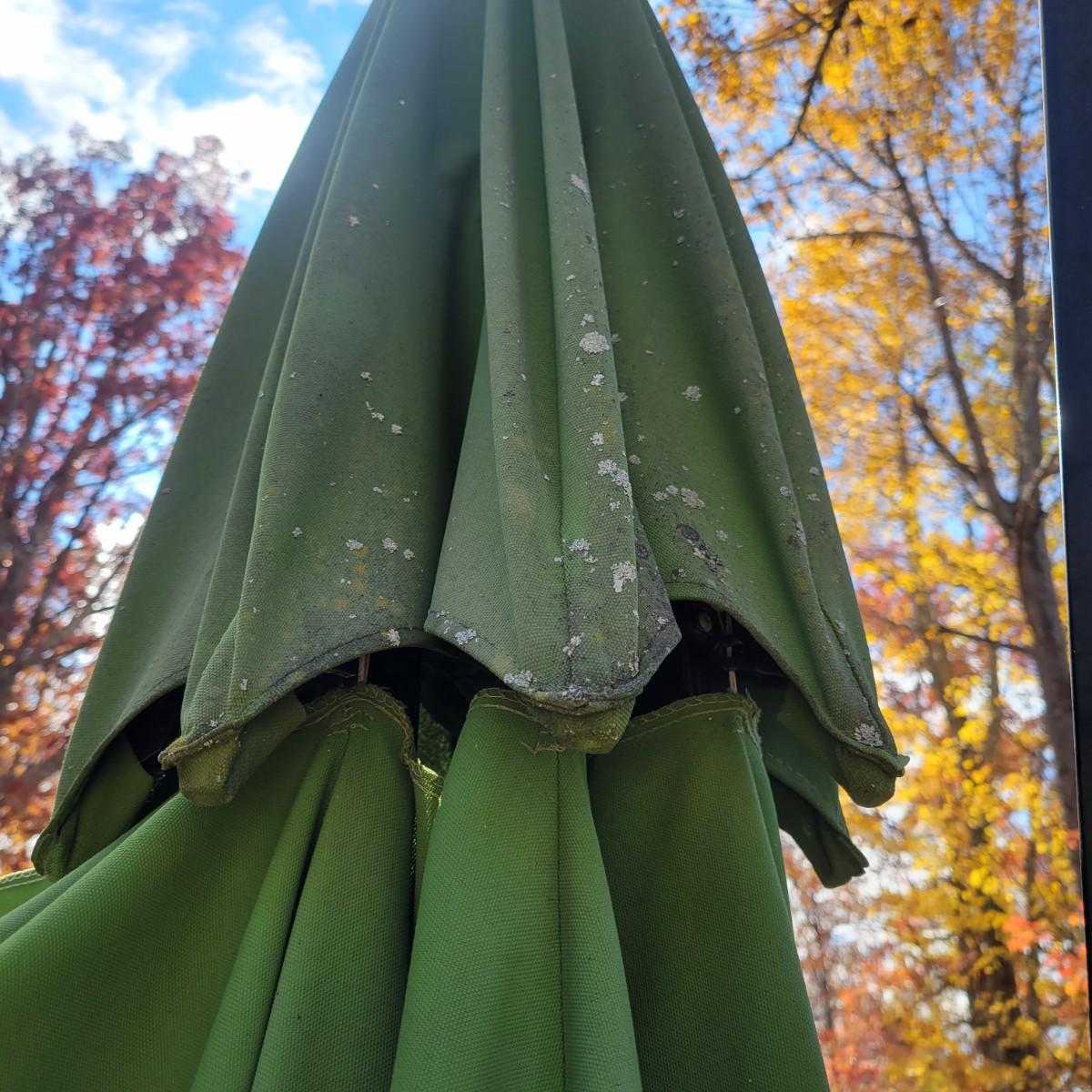 A large offset patio umbrella in good condition with some minor blemishes. It is a fabric umbrella that has a multitude of holes in its vertical pole for a variety of heights and a large base weighted with sand. Umbrella diameter is approximately 124" and the base is 36" in diameter. Measures approximately 36" x 100" when closed. Local pickup only. Winning bidder will need to bring assistance to move and load this due to its weight.