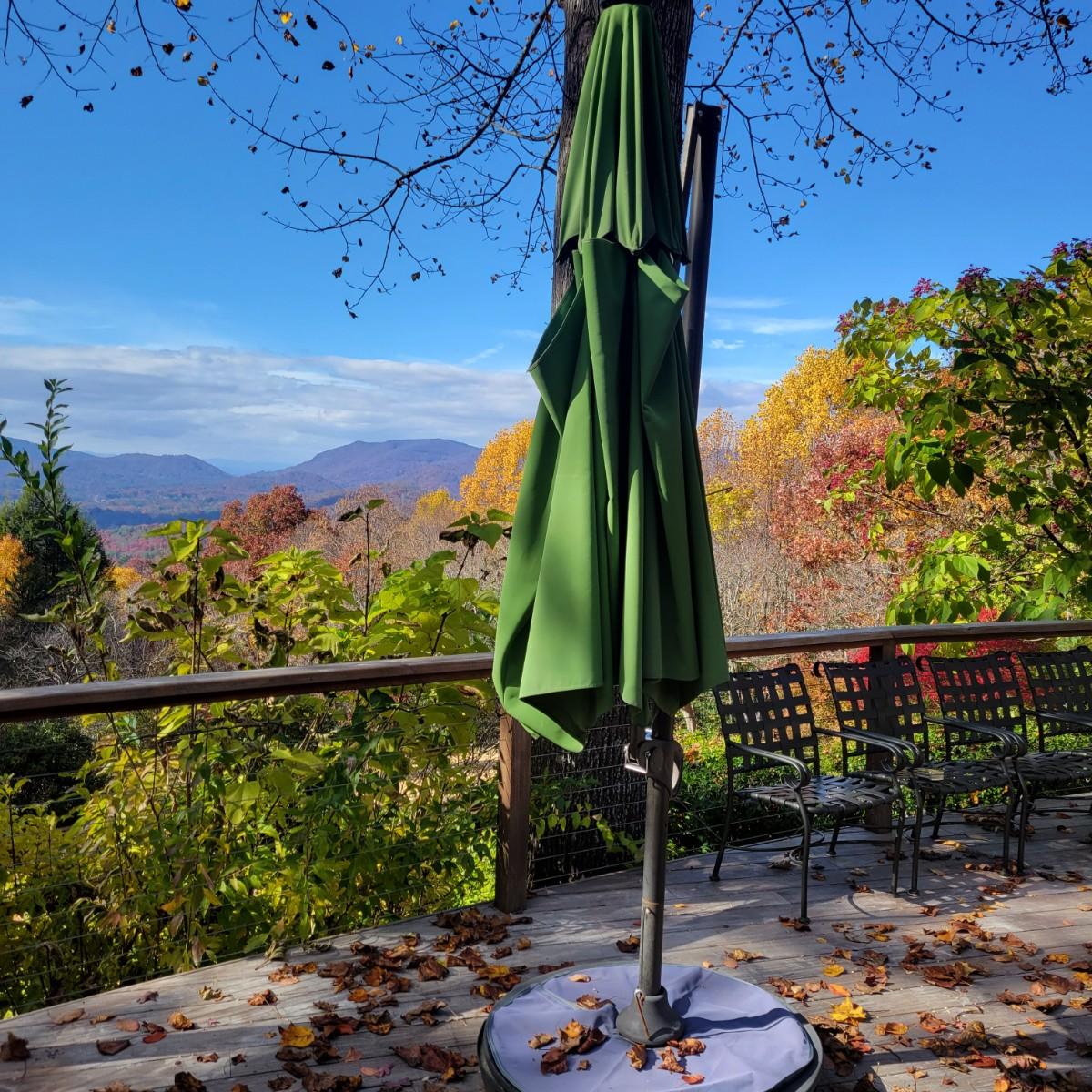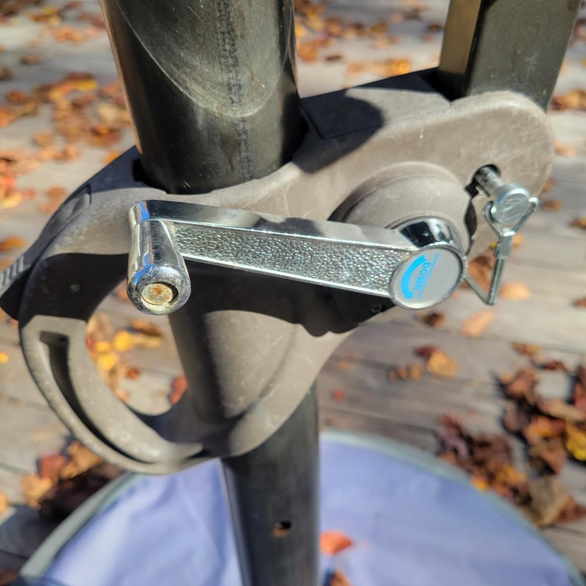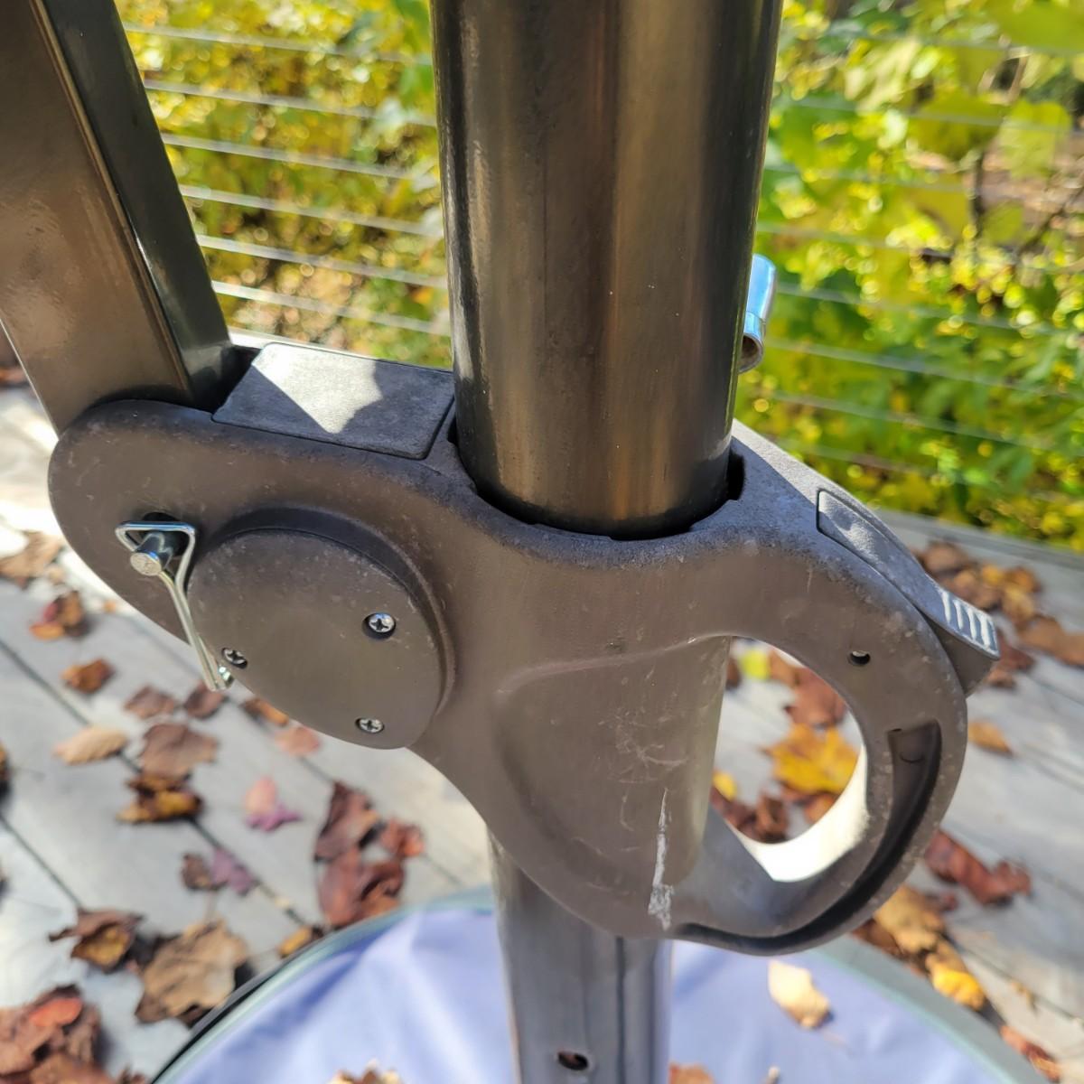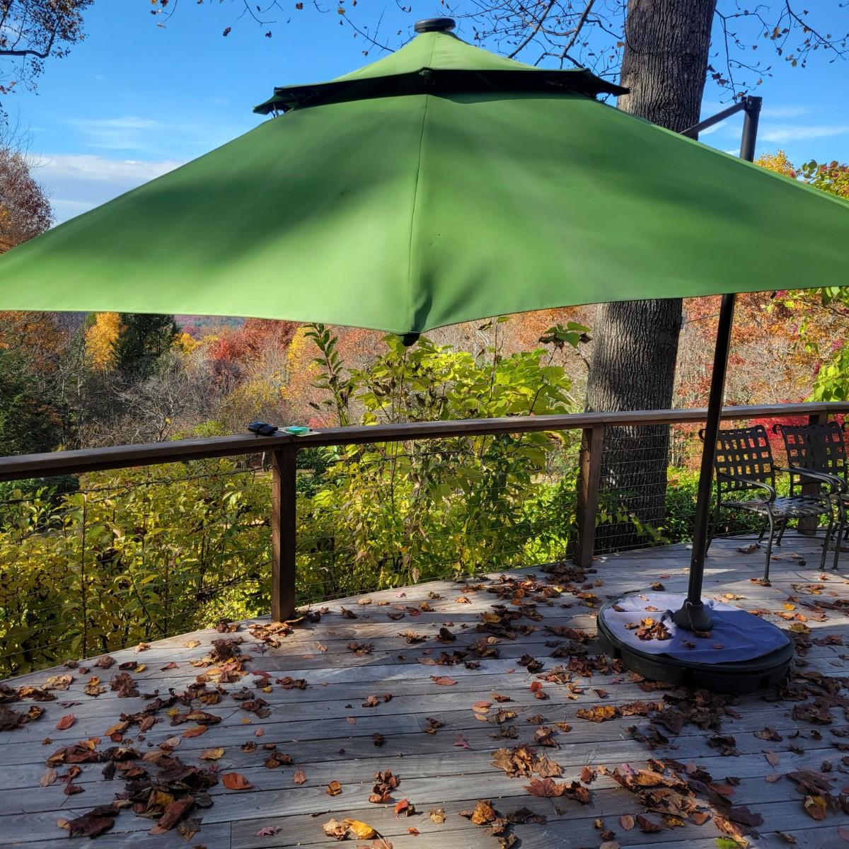 A large offset patio umbrella in good condition with some minor blemishes. It is a fabric umbrella that has a multitude of holes in its vertical pole for a variety of heights and a large base weighted with sand. Umbrella diameter is approximately 124" and the base is 36" in diameter. Measures approximately 36" x 100" when closed. Local pickup only. Winning bidder will need to bring assistance to move and load this due to its weight.