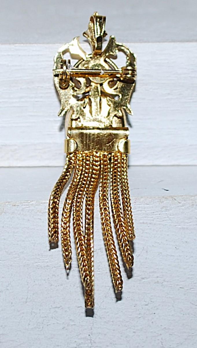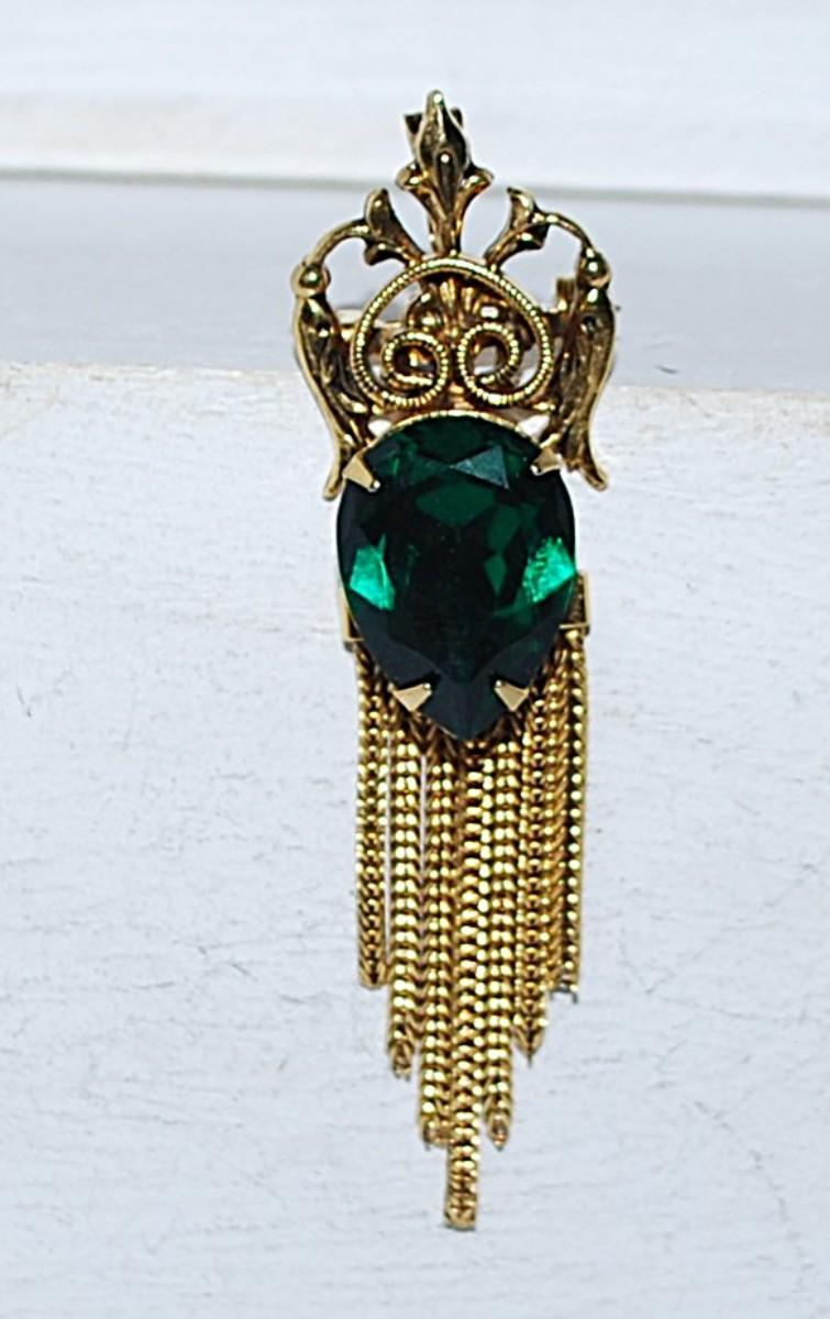 Large Pear Shape Emerald Colored Stone BROOCH (2½" x ¾") with Vintage Style Top Design and Rope Braid Dangles on a Gold Tone Setting