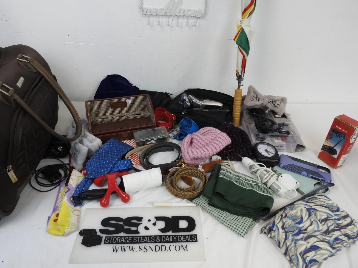 Large Personal Care Lot: Brown Bag with Umbrella, Beanie Hat, Tie, Belts, Shaver