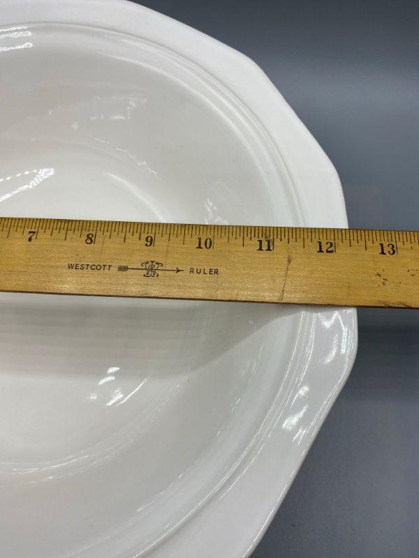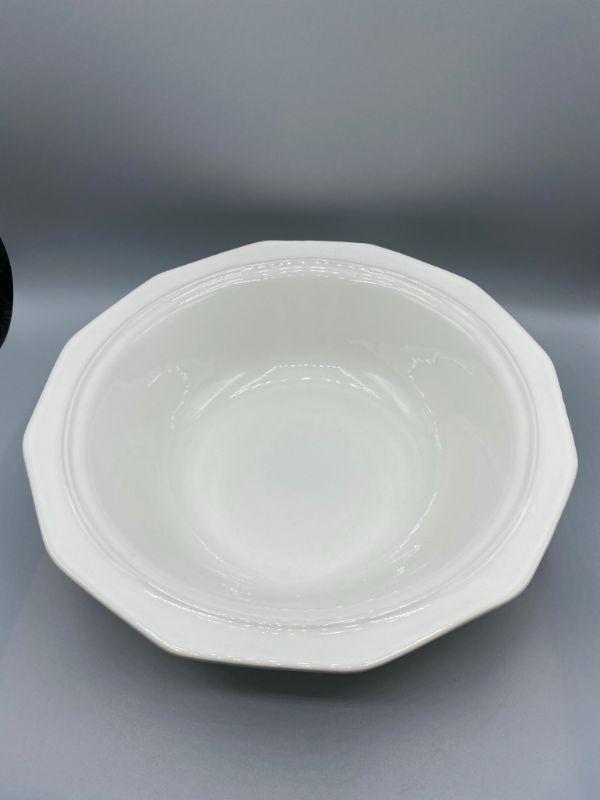 Large vintage Pflatzgraff bowl. Thick white ceramic. Stamped on the bottom. About 12" across and 3.5" tall. Good condition.