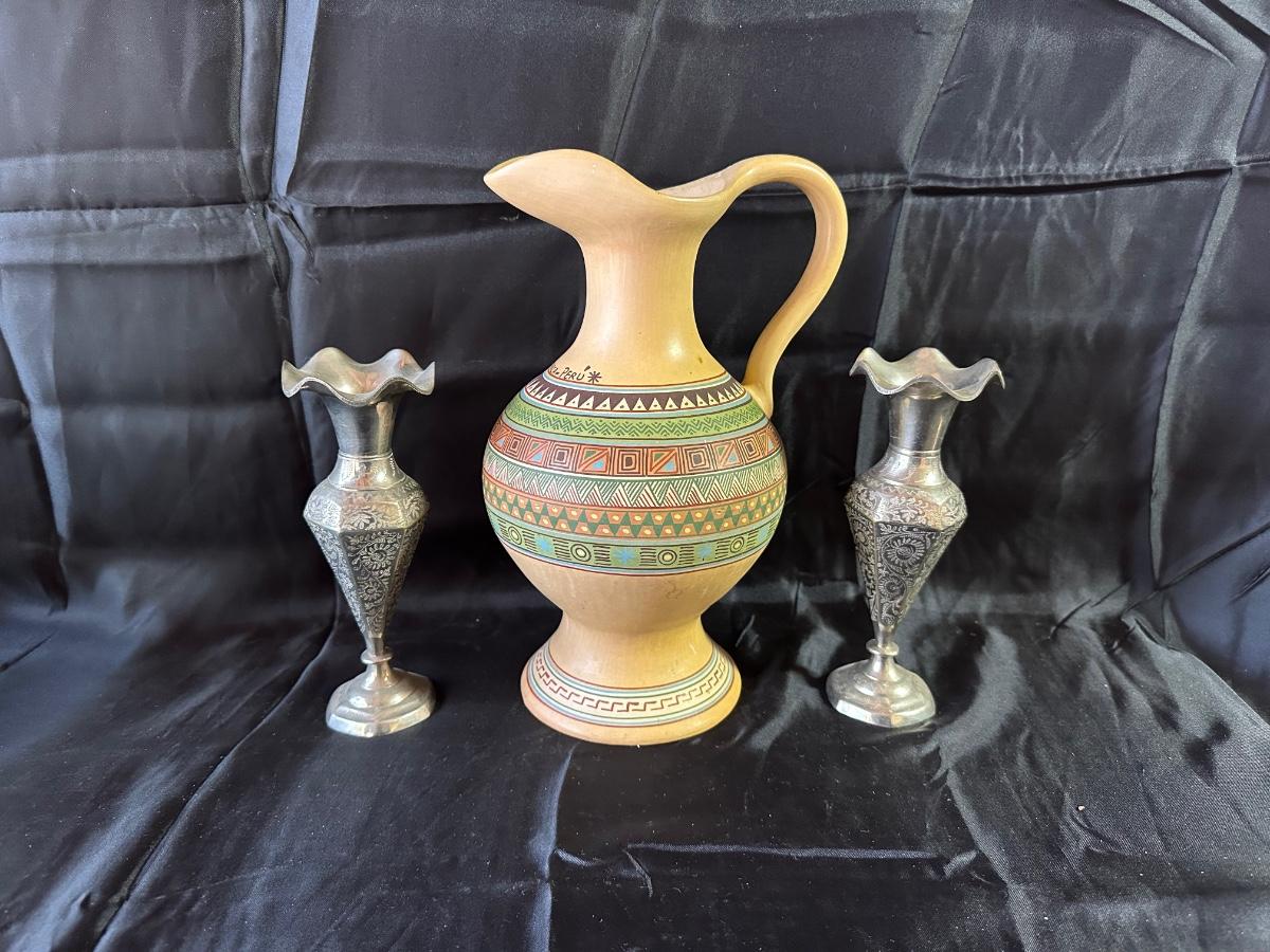 LARGE PITCHER FROM PERU AND 2 METAL VASES
