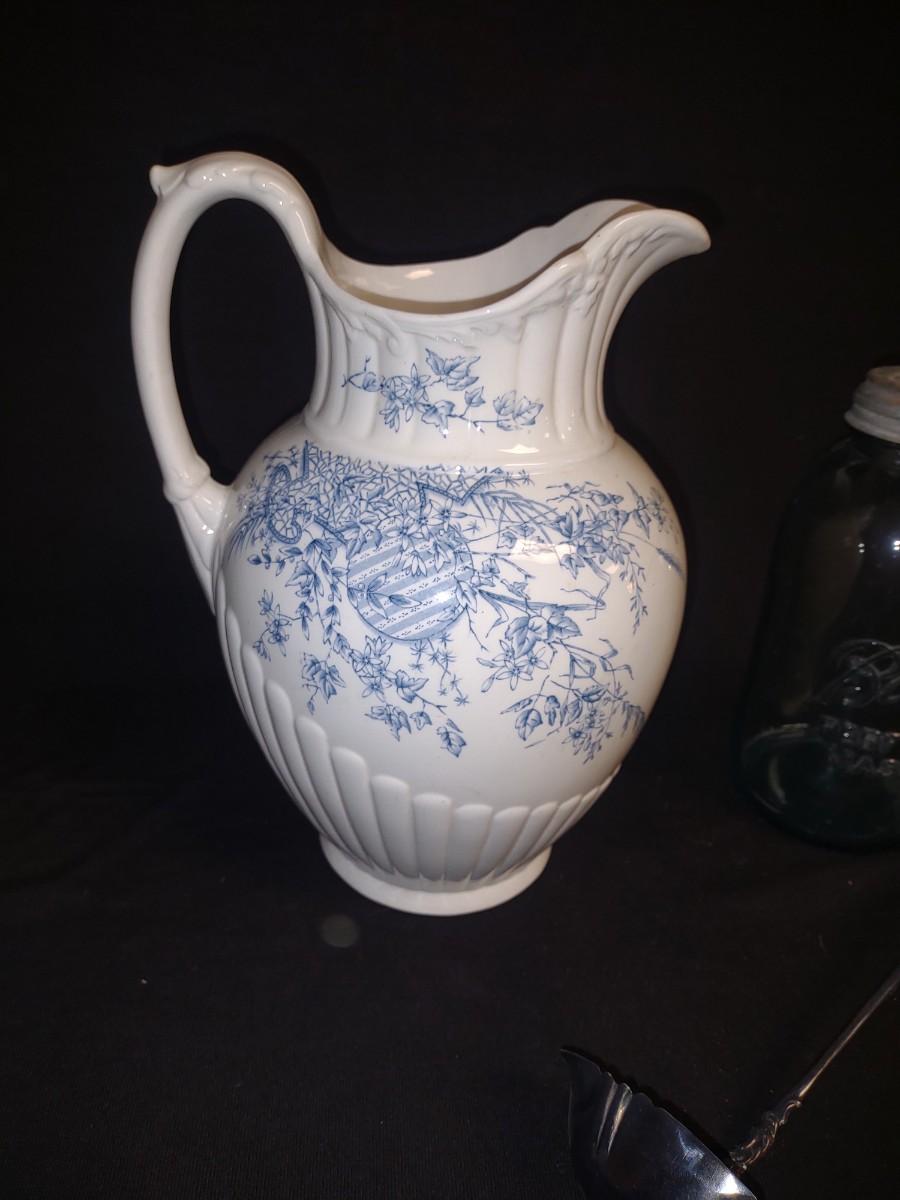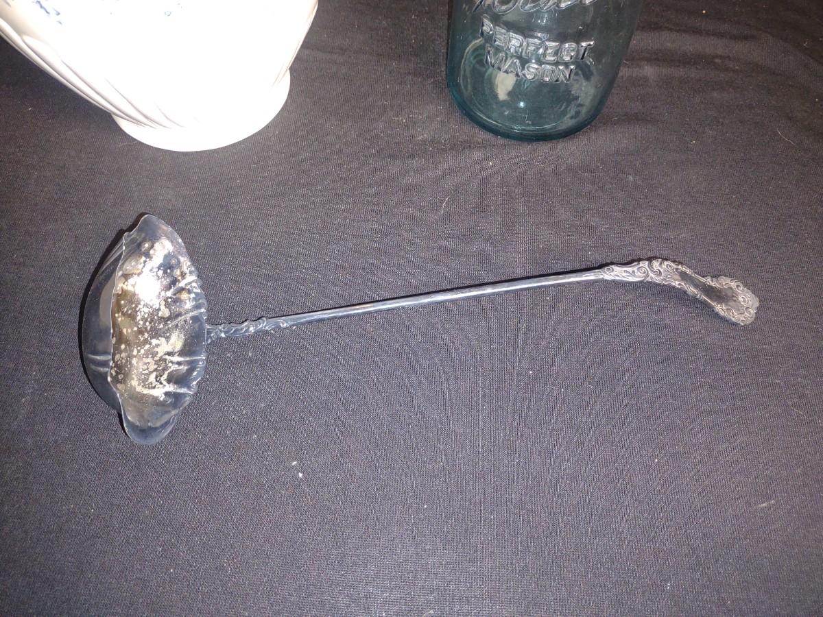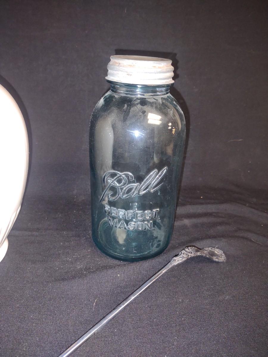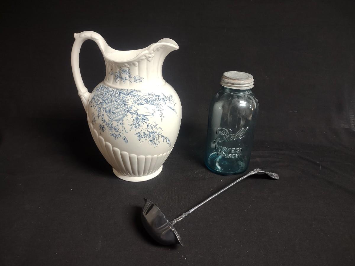 LARGE PITCHER, GREEN BALL CANNING JAR AND A SILVER PLATED LADLE