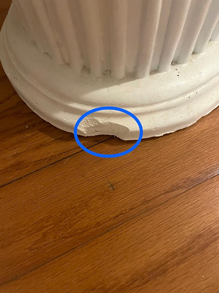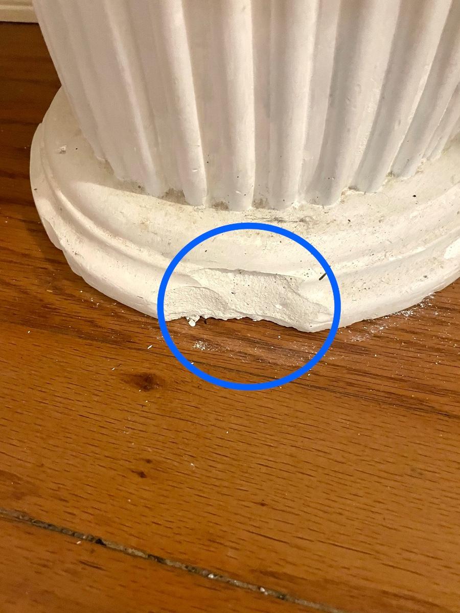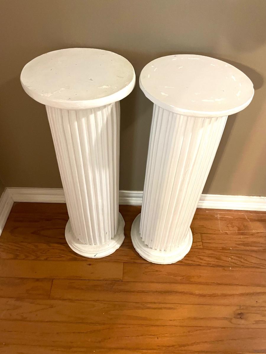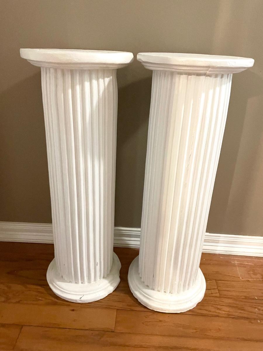 Pair of Large Plaster Column Pedestal measures 30 inches tall and 12 inches round. Both have chips on the back, bottom pedestal.