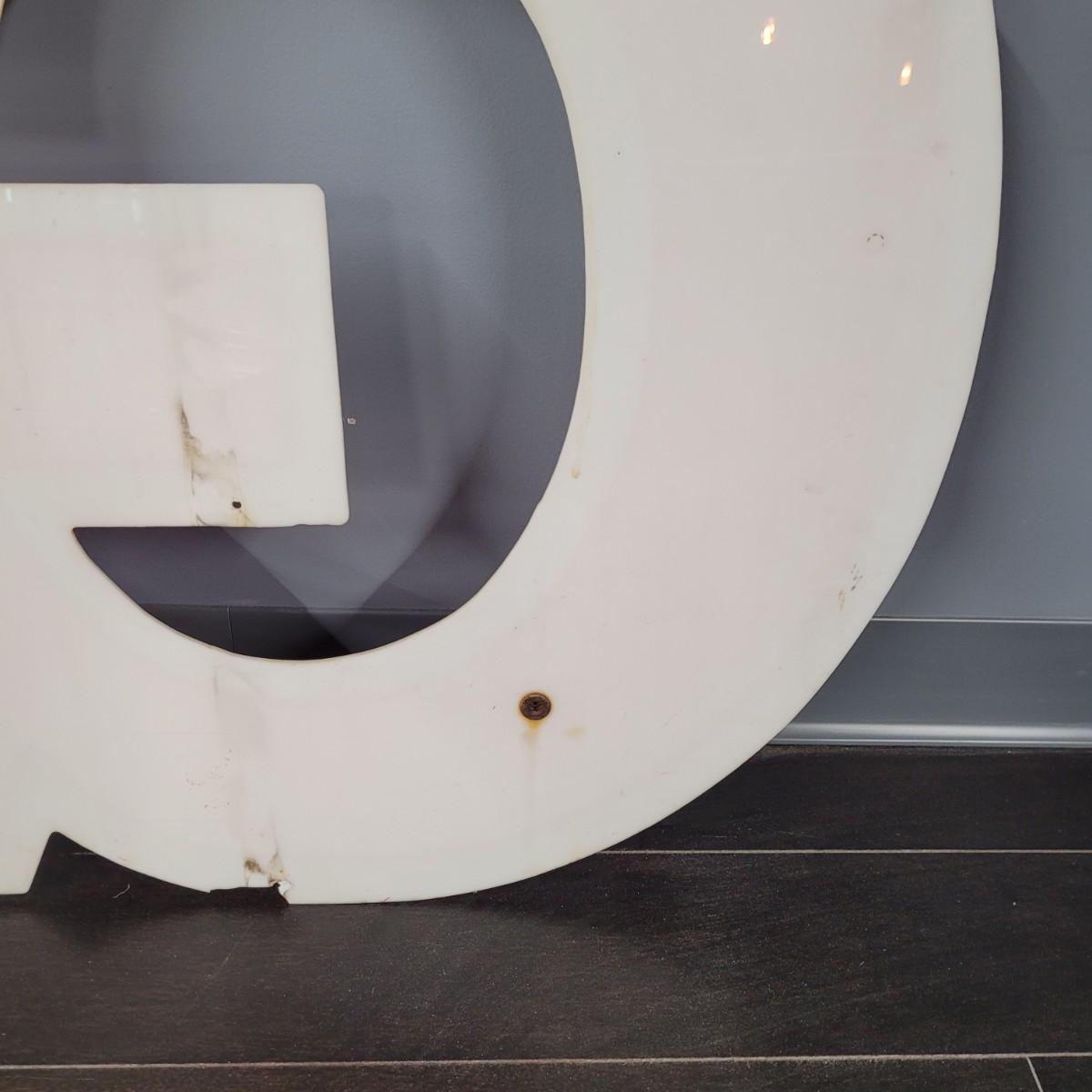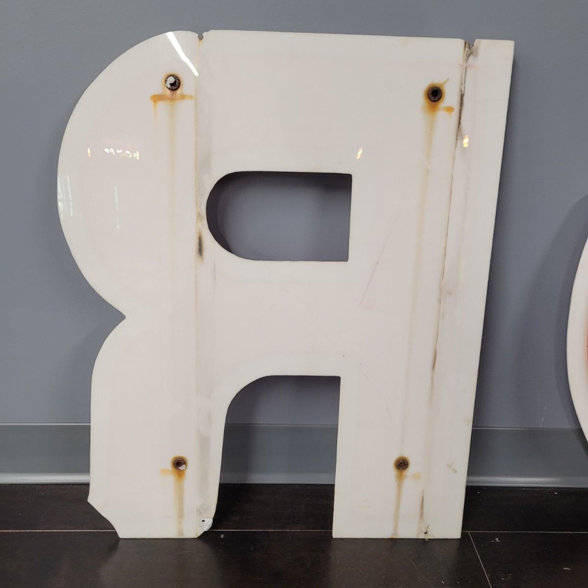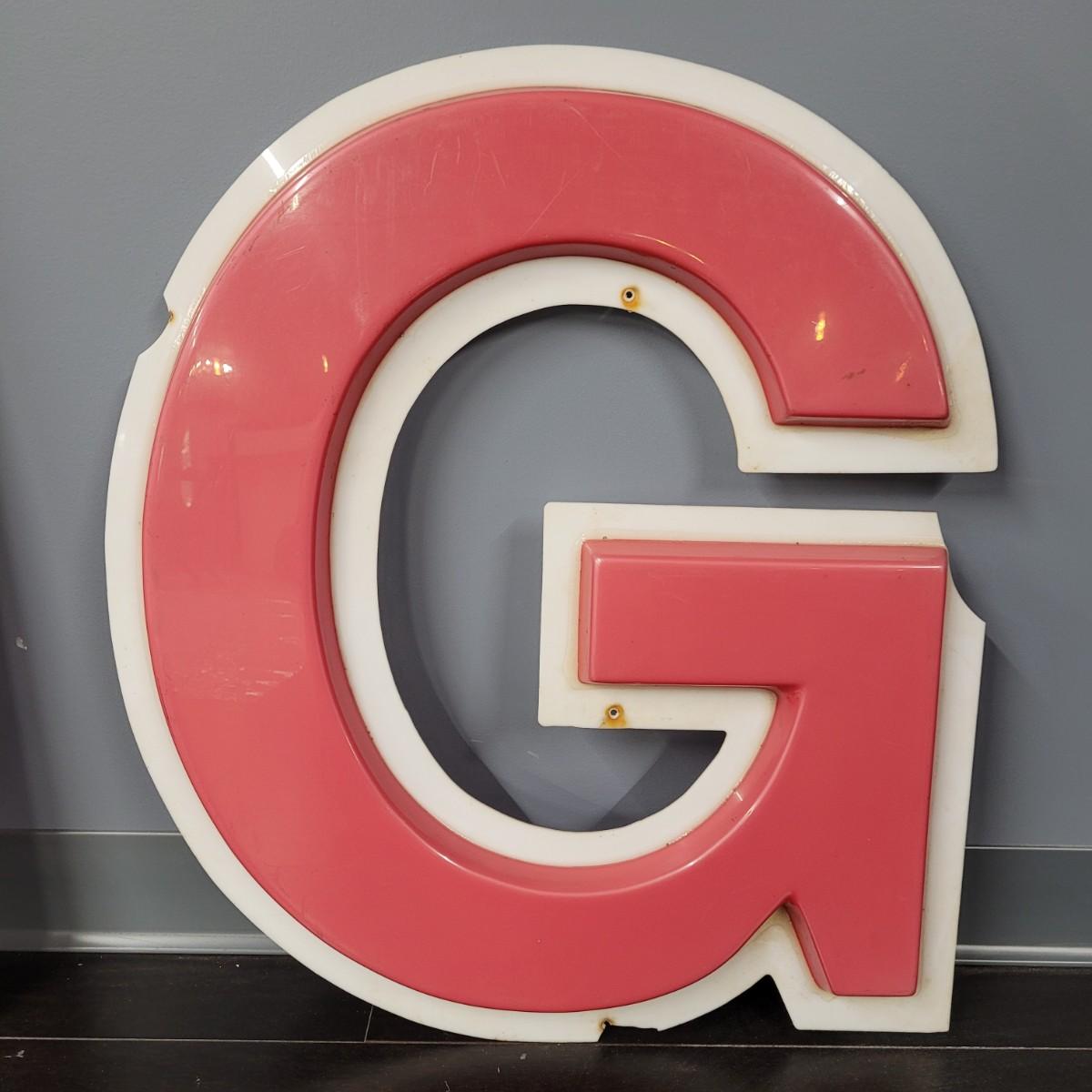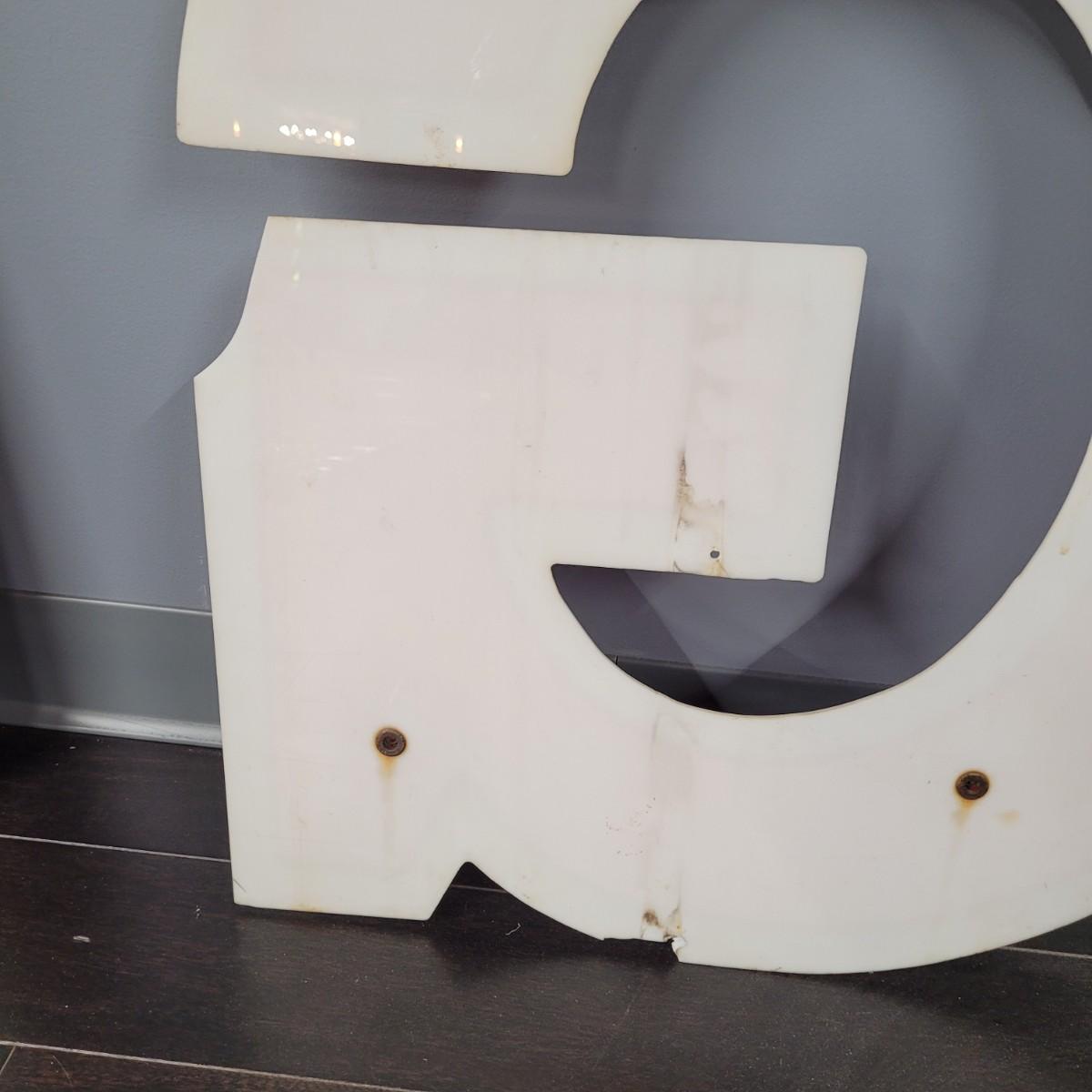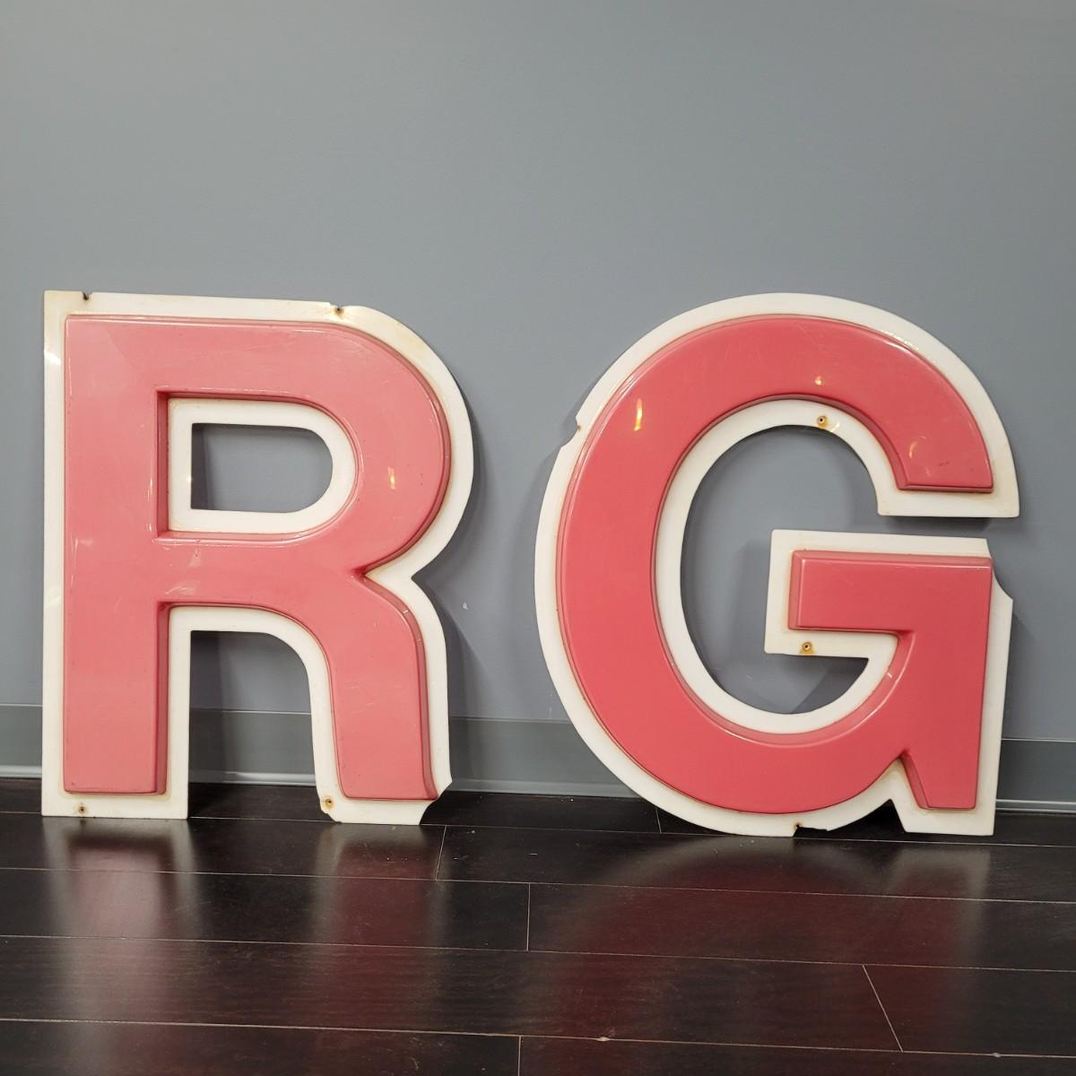 Large plastic hanging "R" and "G" letters. Significant chipping around edges and large crack on upper left part of "R" (see pictures). "R" measures approximately 21.5" x25.6" and "G" measures approximately 24" x27.5". Shipping available.