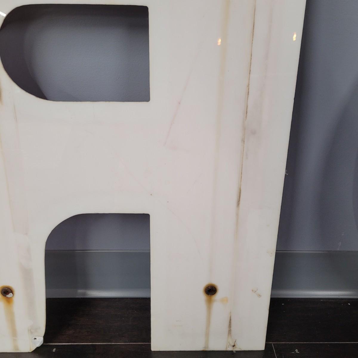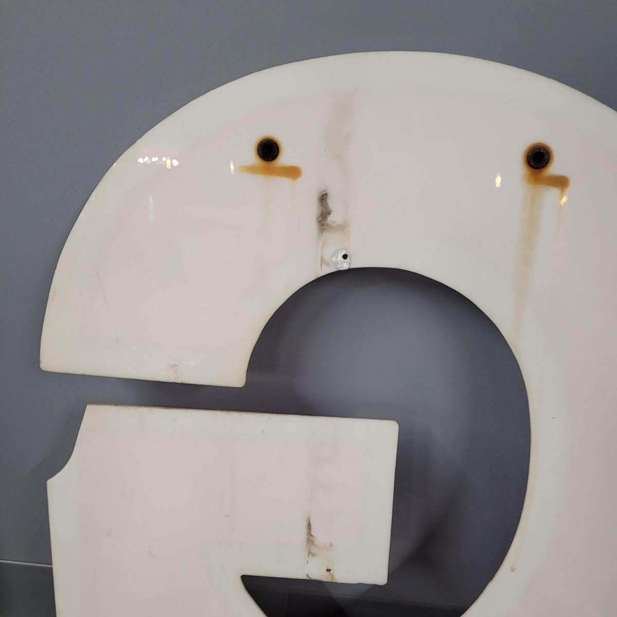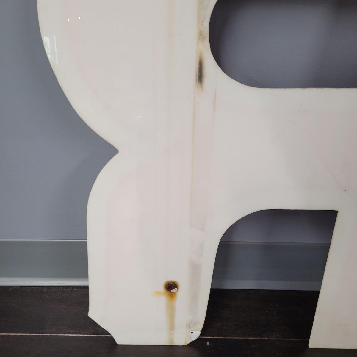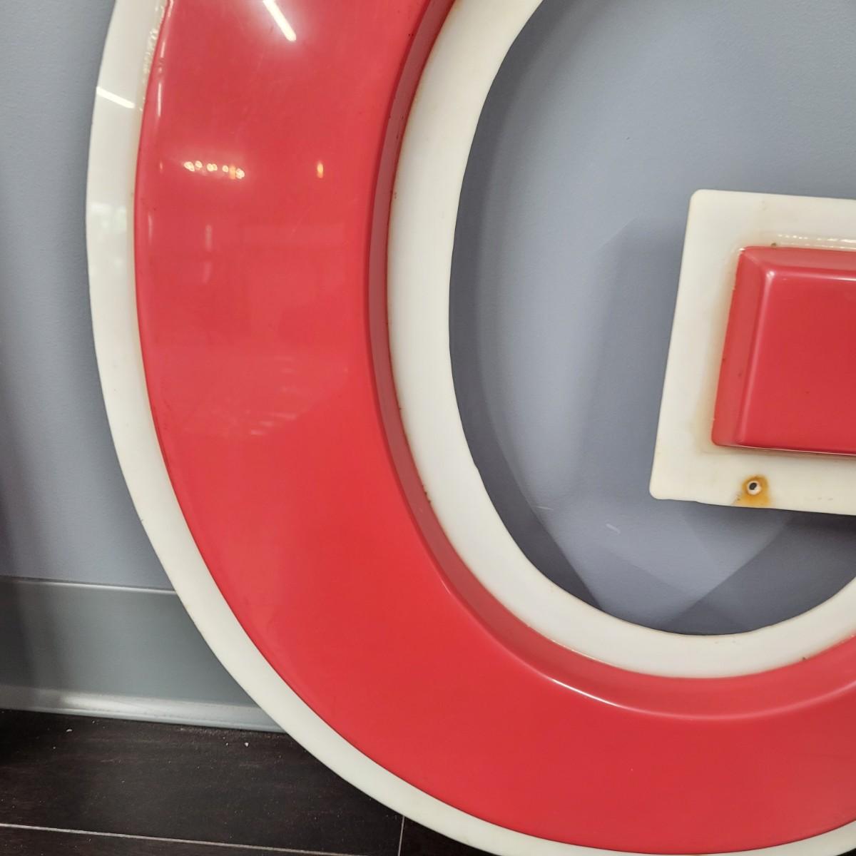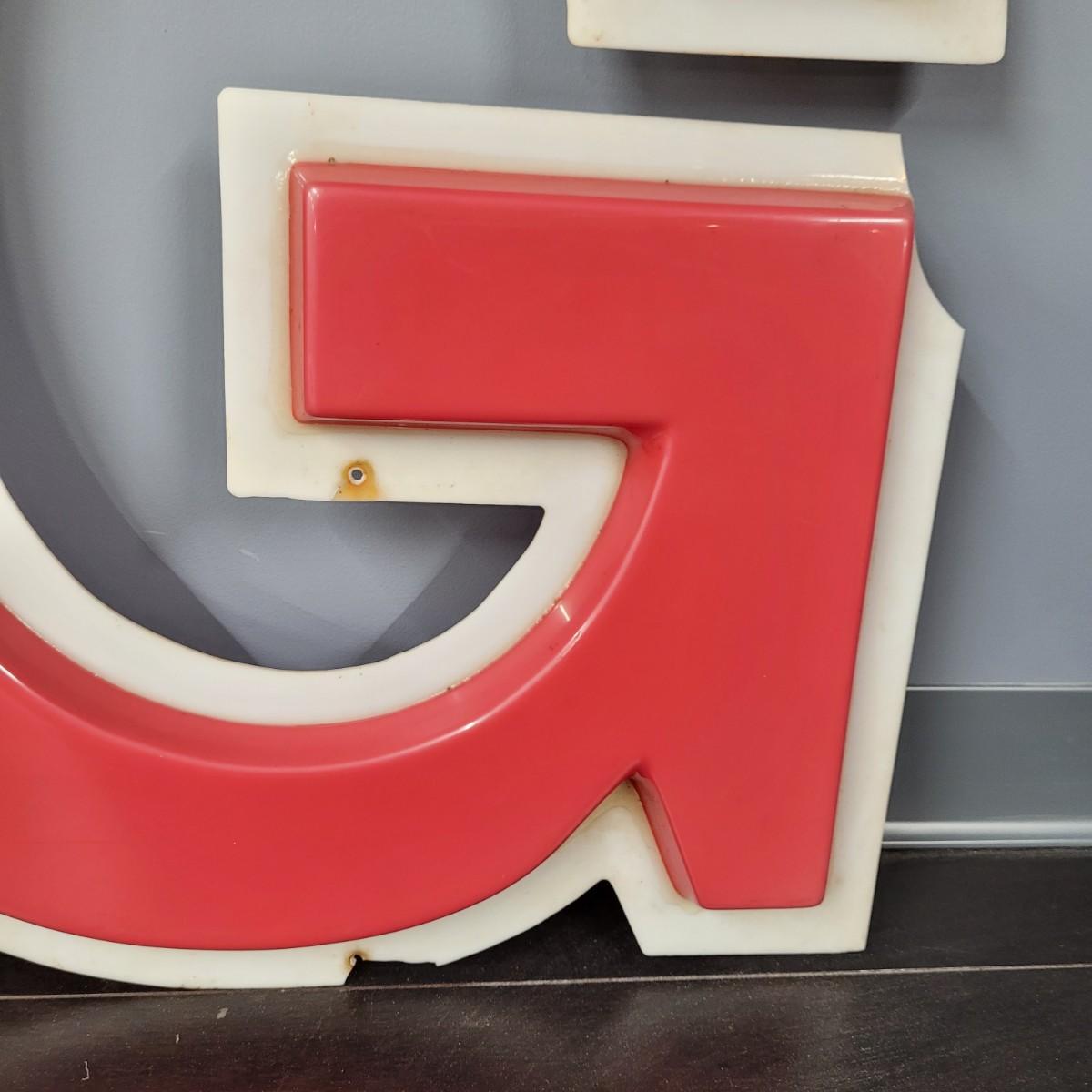 Large plastic hanging "R" and "G" letters. Significant chipping around edges and large crack on upper left part of "R" (see pictures). "R" measures approximately 21.5" x25.6" and "G" measures approximately 24" x27.5". Shipping available.