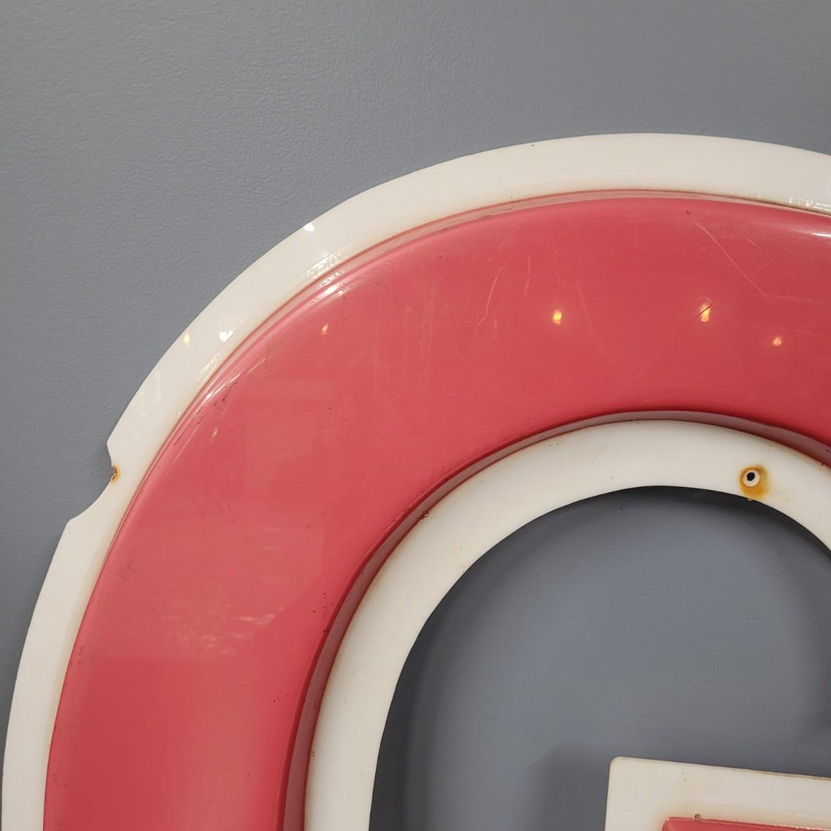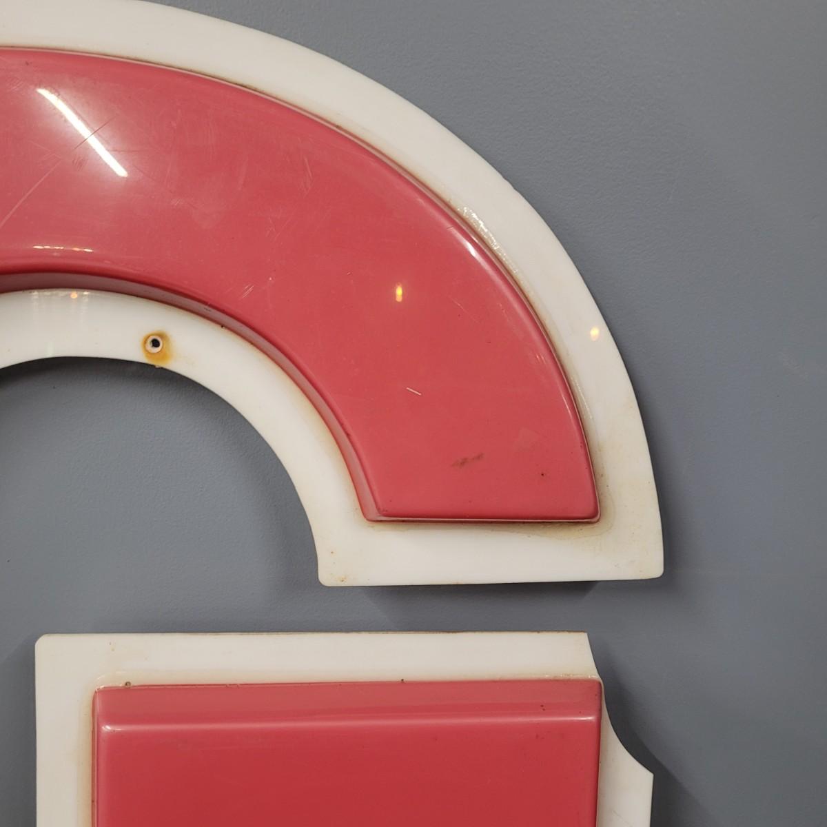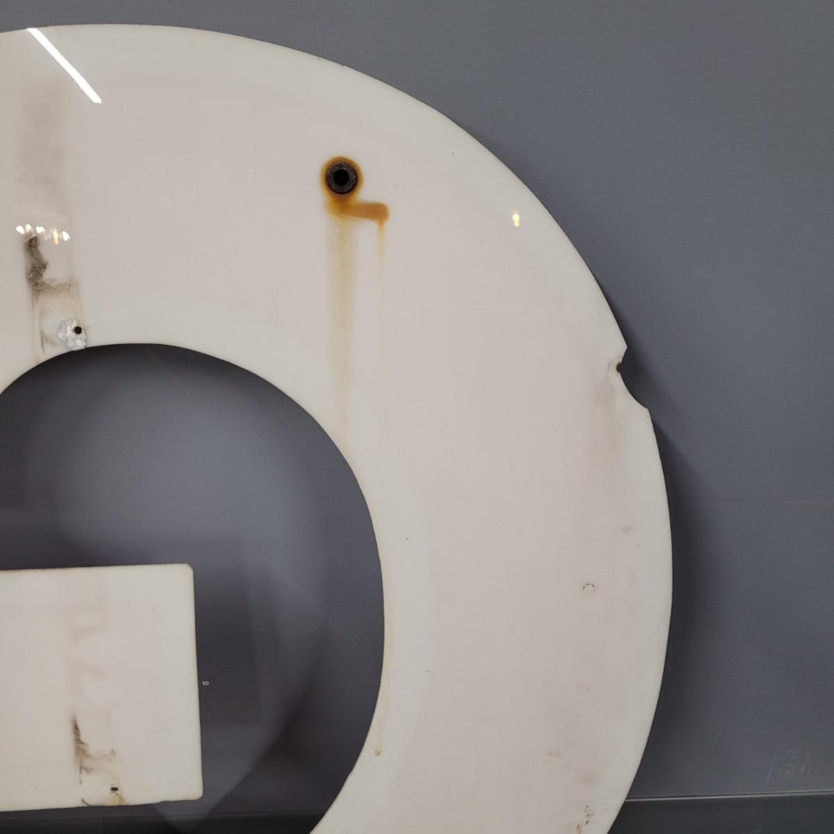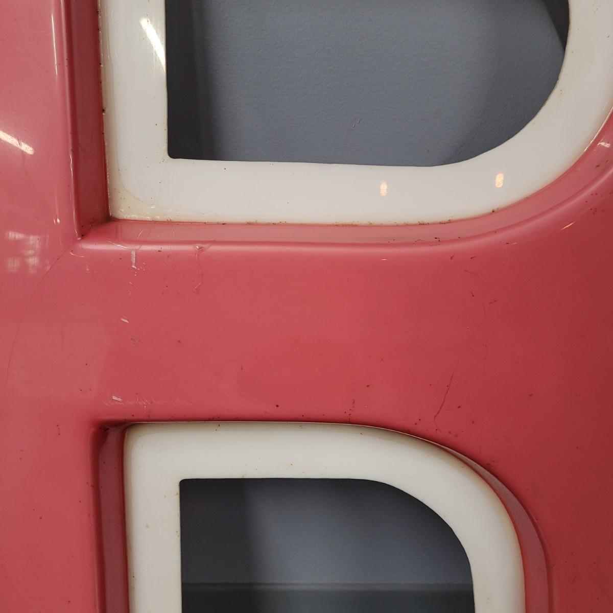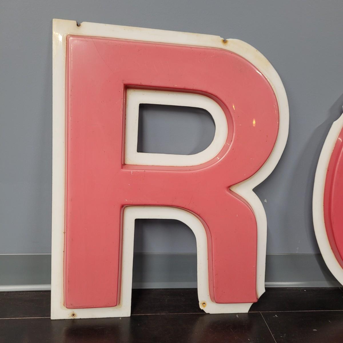 Large plastic hanging "R" and "G" letters. Significant chipping around edges and large crack on upper left part of "R" (see pictures). "R" measures approximately 21.5" x25.6" and "G" measures approximately 24" x27.5". Shipping available.