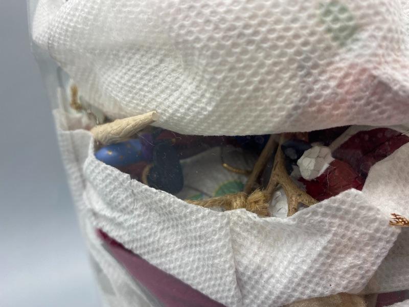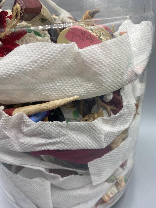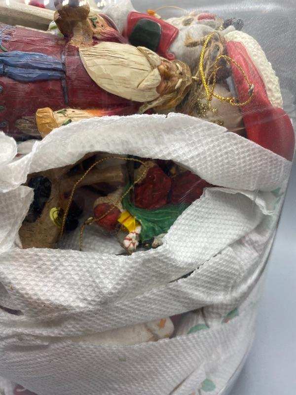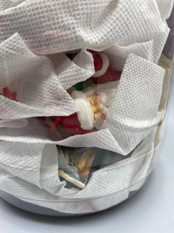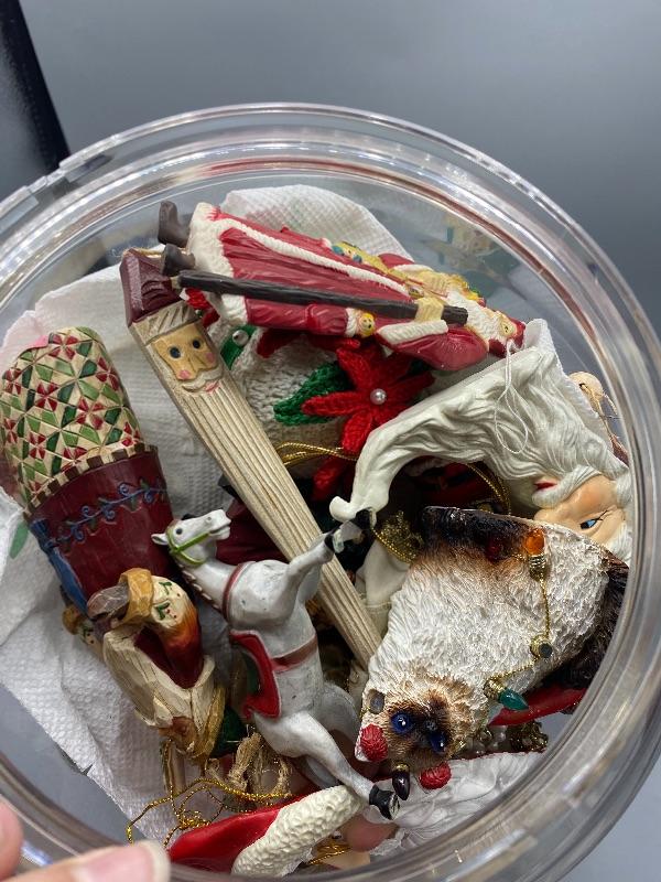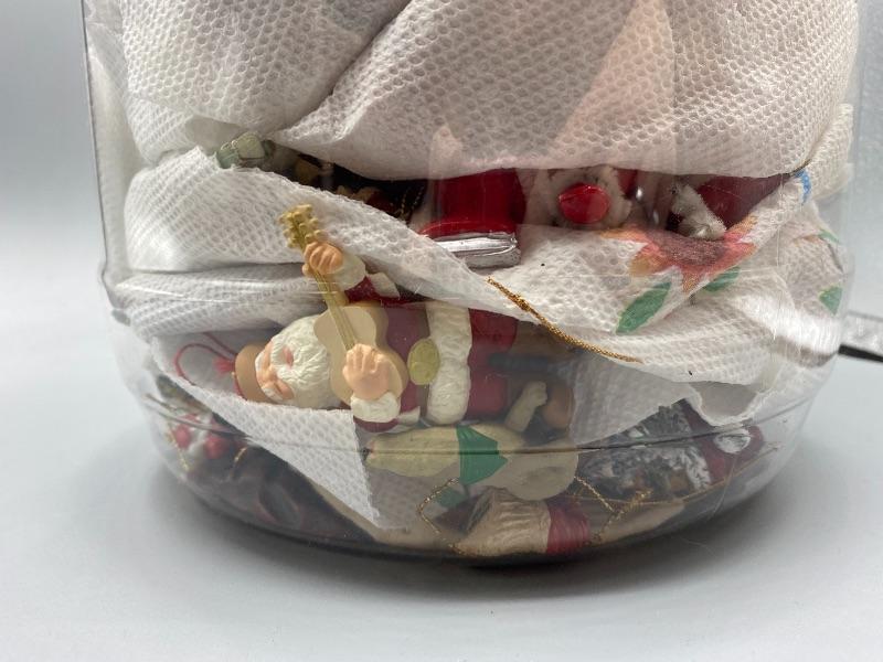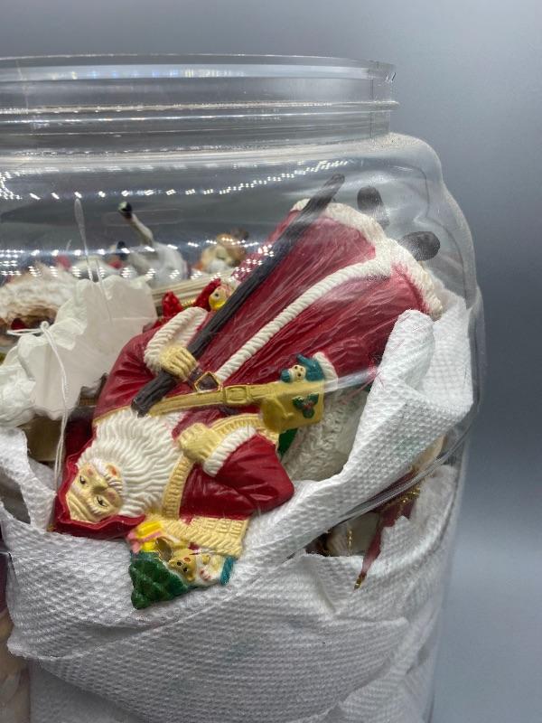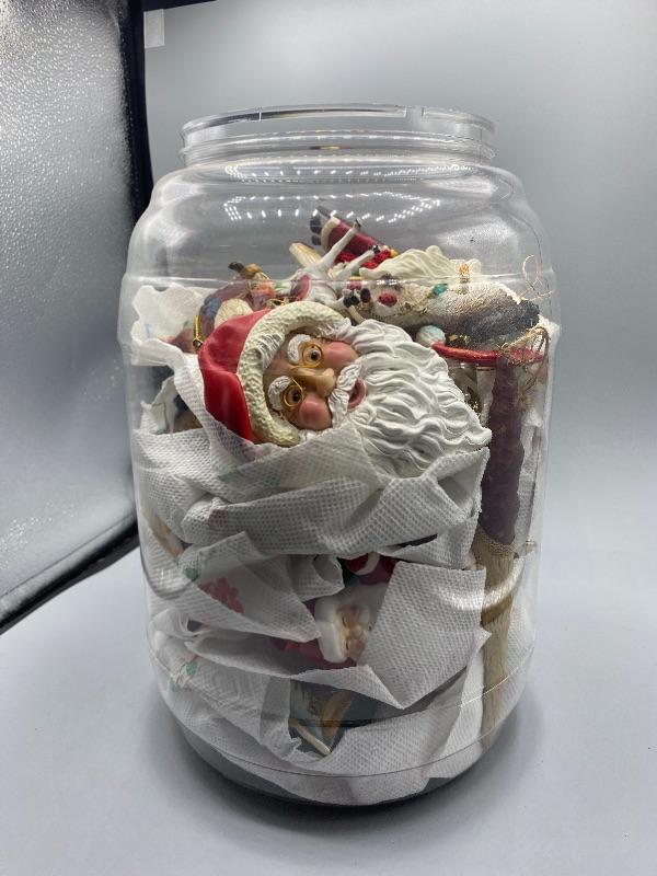 Large plastic jar filled with Christmas tree ornaments. Looks like a lot of Santa Claus ornaments. Previous owner put paper towels in between the layers to protect the ornaments. Sold as is, do not know how many ornaments are in it, it is kinda heavy though. Jar is plastic, about 13" tall, unfortunately no lid.