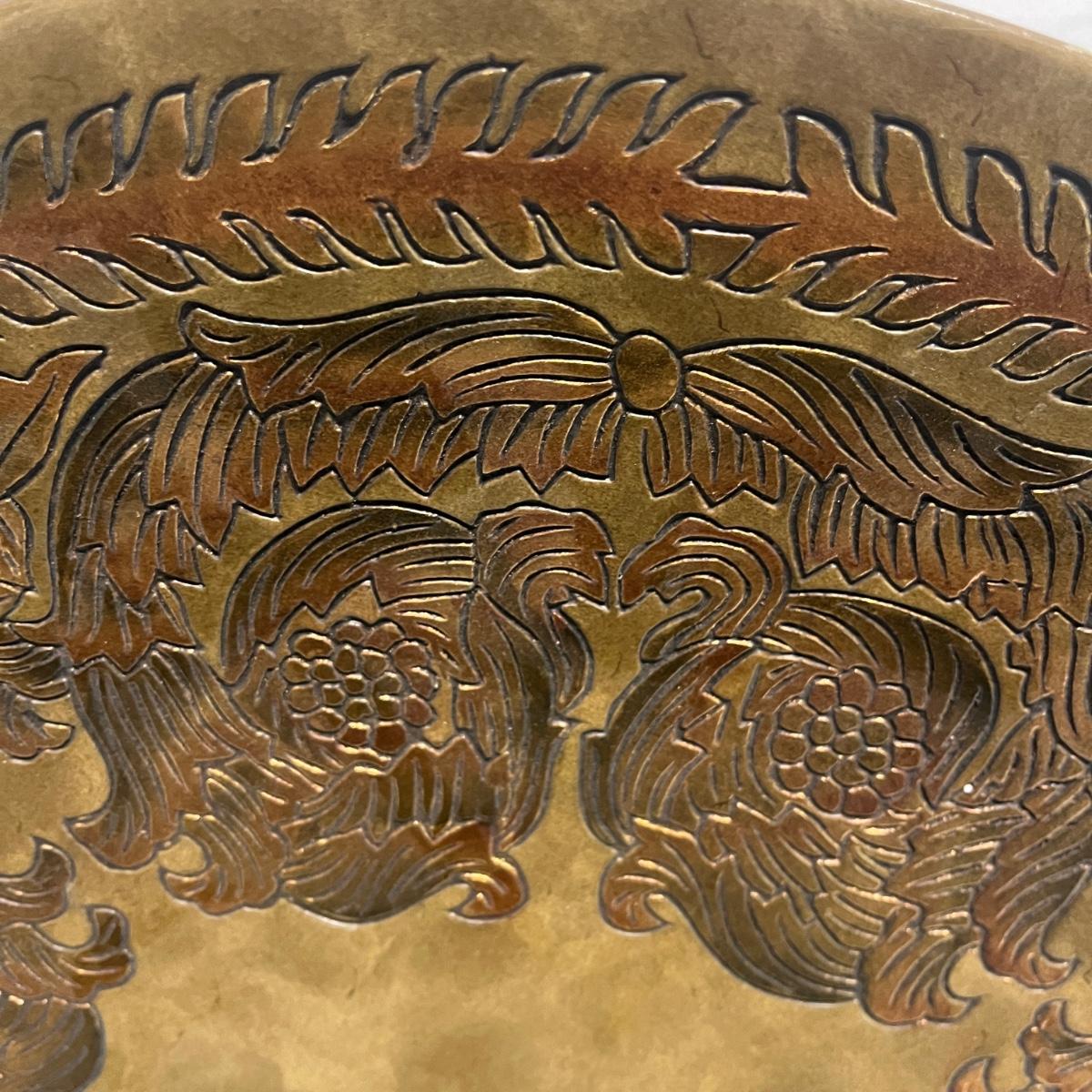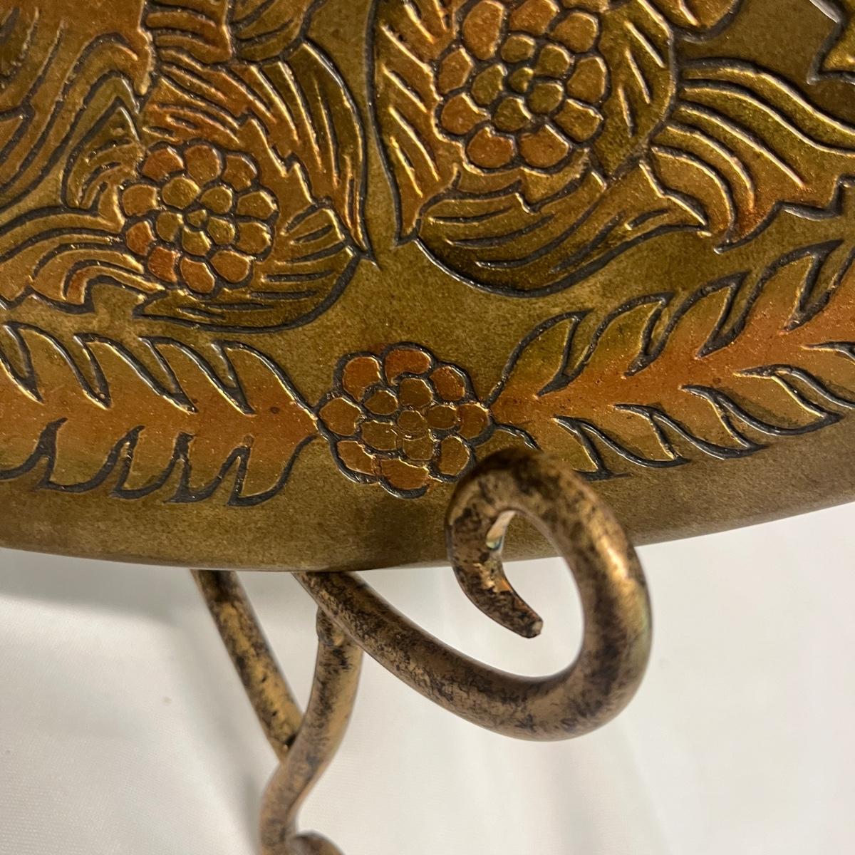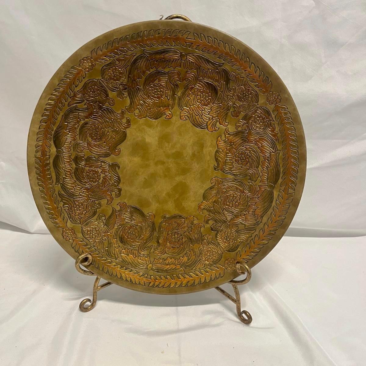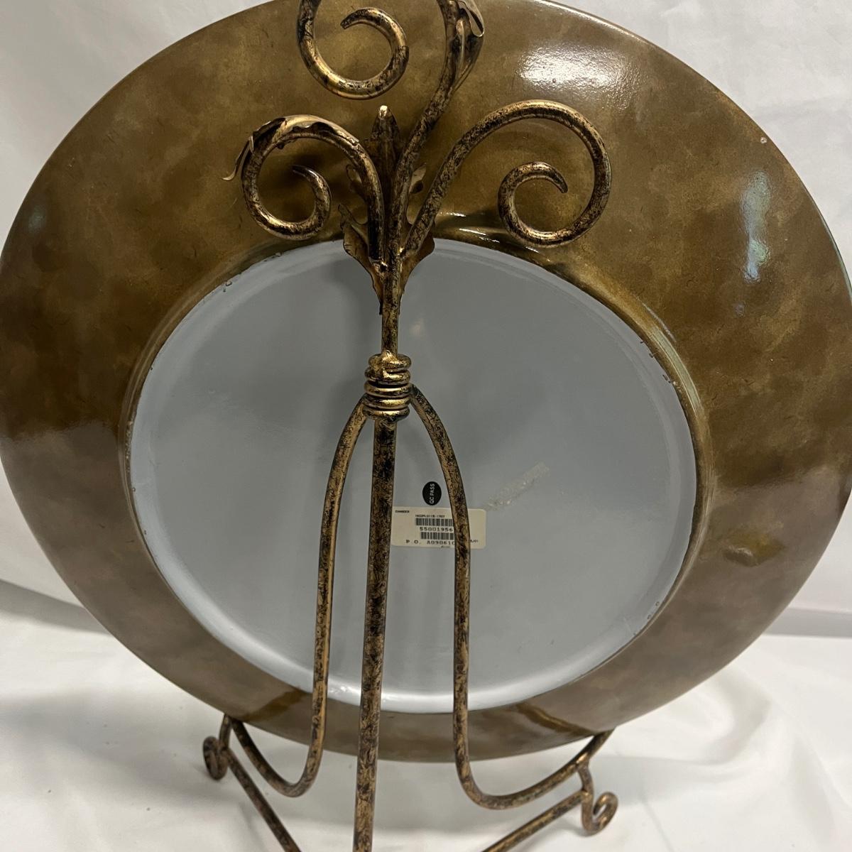 This ceramic plate has a metallic copper and gold finish that reflects the light for a unique look. Also includes the metal stand. Plate measures 18.5”D x 2”.
