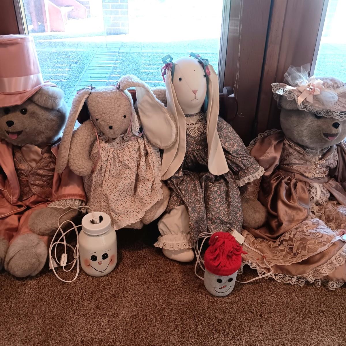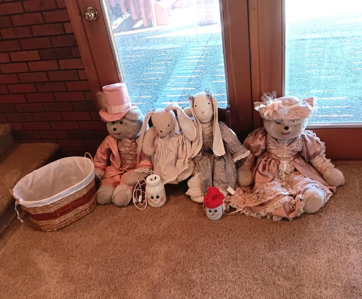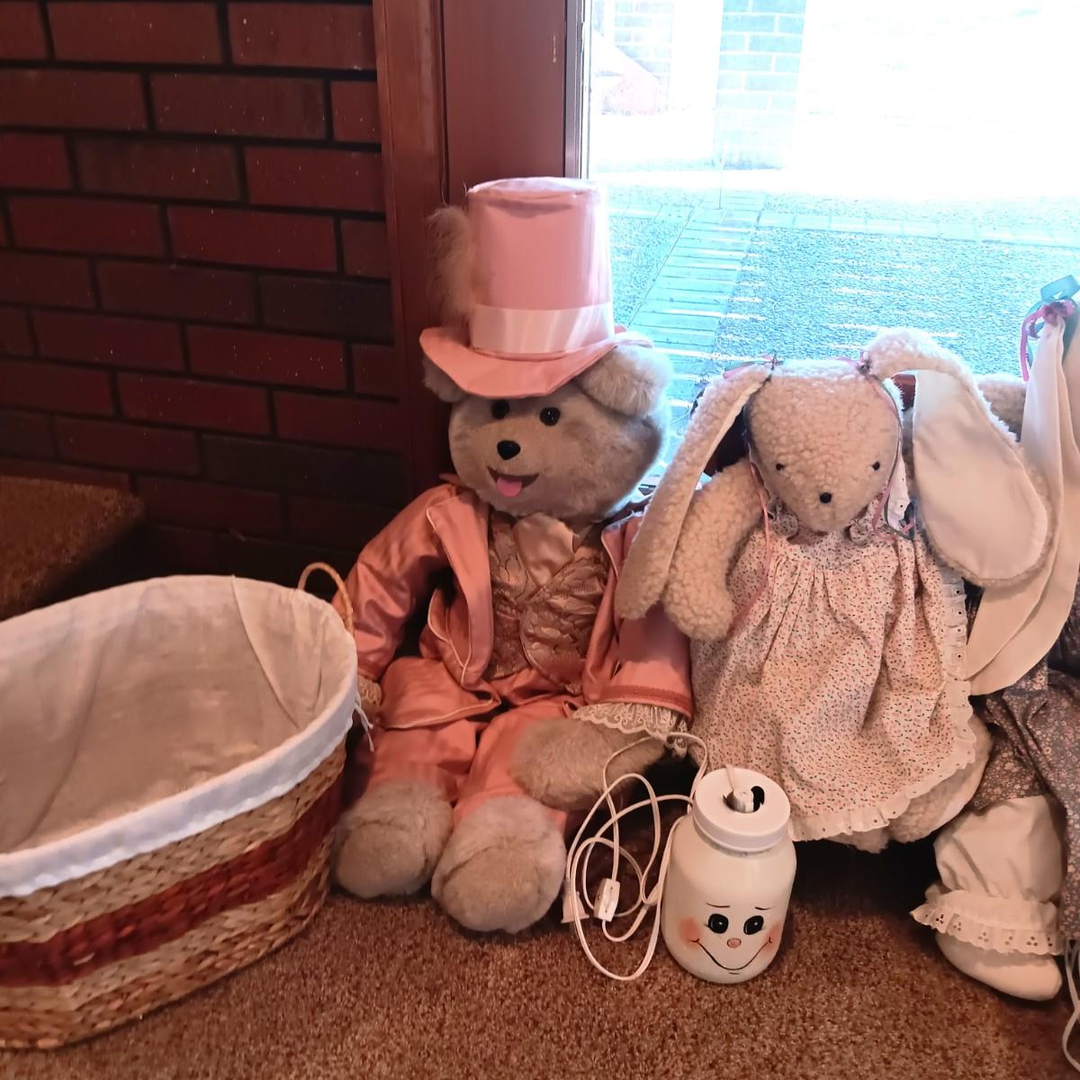 LARGE PLUSH MR & MRS BEARS, PAIR OF SILLY RABBITS, WOOD BENCH AND MORE
