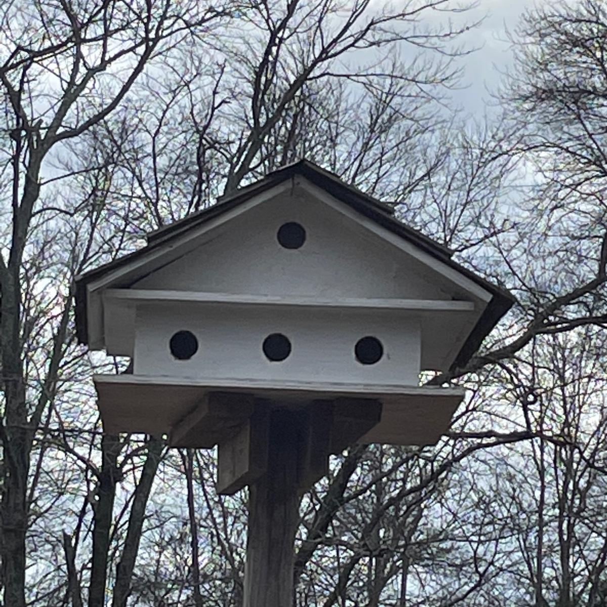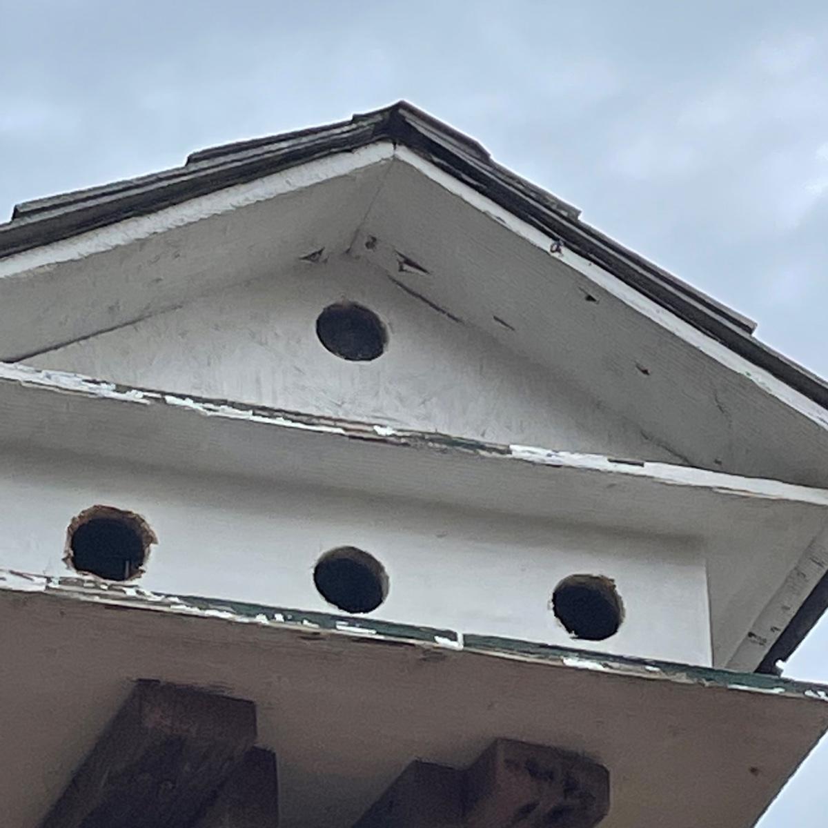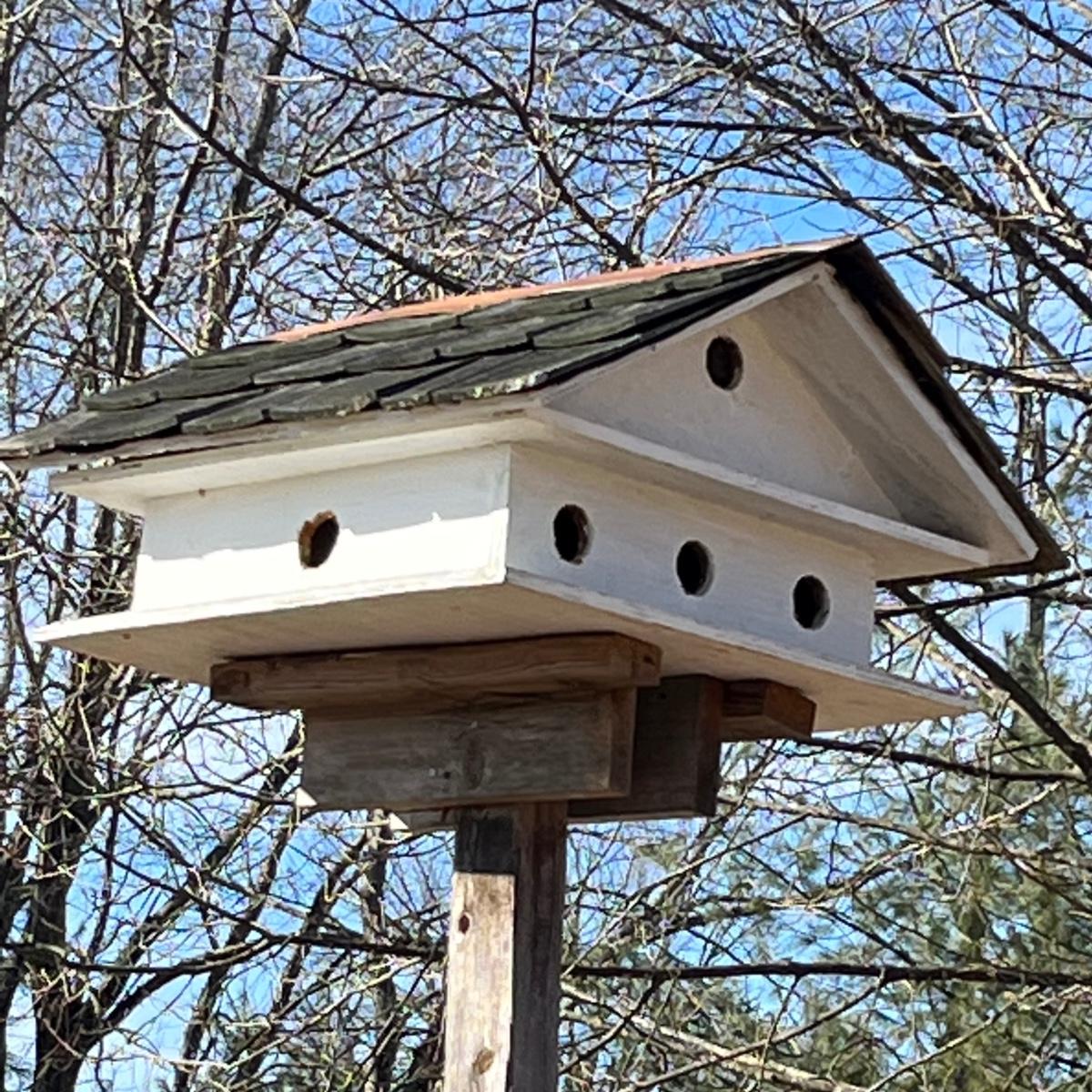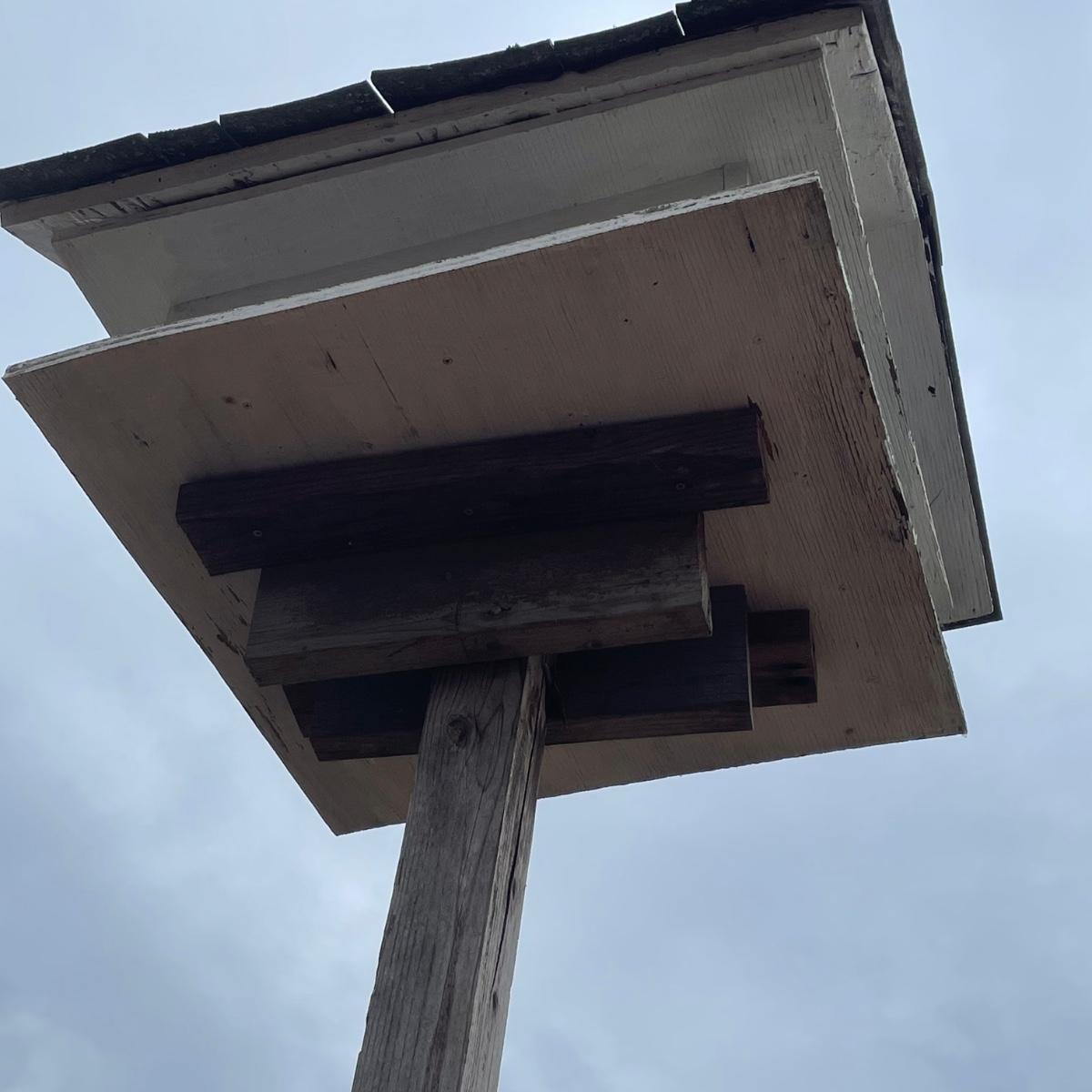 This large birdhouse appears to be approximately 24” square. It is white painted wood with a wood shingle roof and is mounted on an 118” pole that is currently held in place with two additional pieces of wood with a large bolt through the middle. Winning bidder is responsible for dismantling. Note this a two able-bodied person job for taking down and getting it to your vehicle.