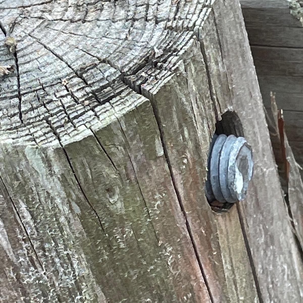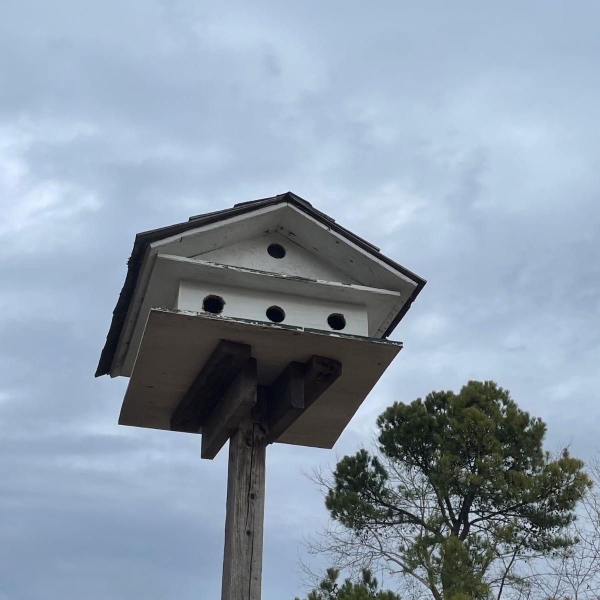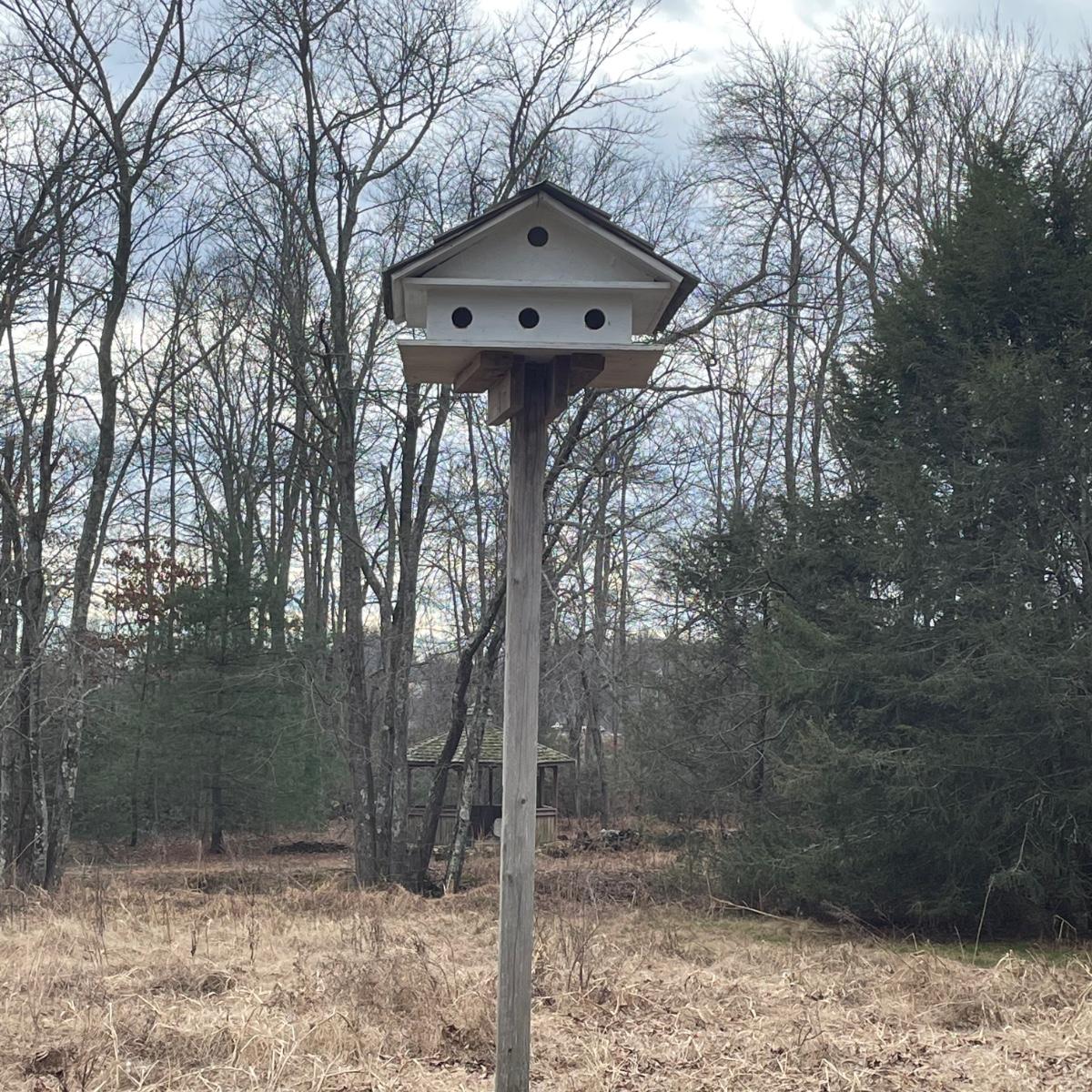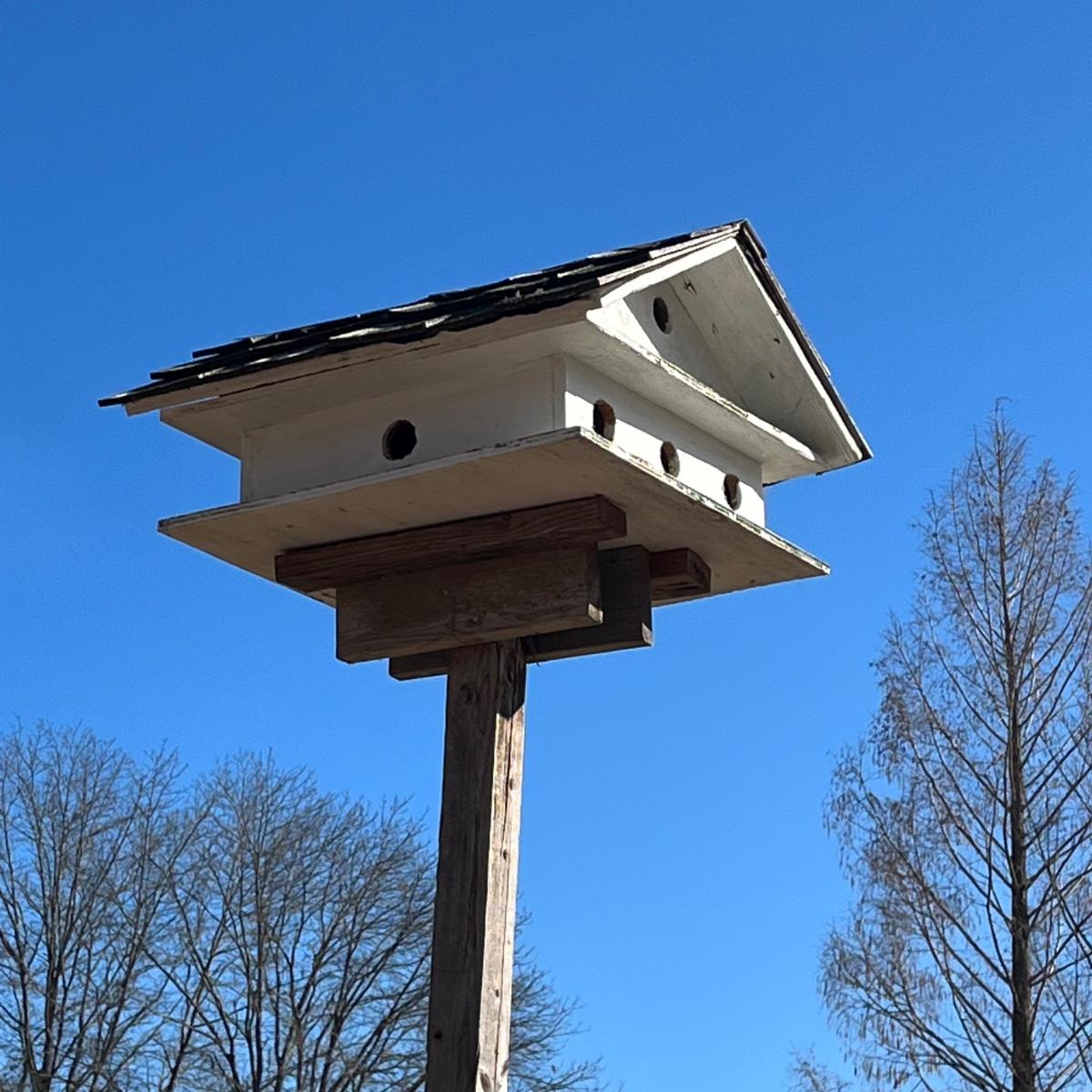 This large birdhouse appears to be approximately 24” square. It is white painted wood with a wood shingle roof and is mounted on an 118” pole that is currently held in place with two additional pieces of wood with a large bolt through the middle. Winning bidder is responsible for dismantling. Note this a two able-bodied person job for taking down and getting it to your vehicle.