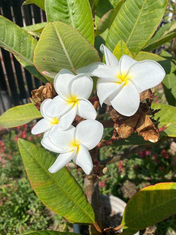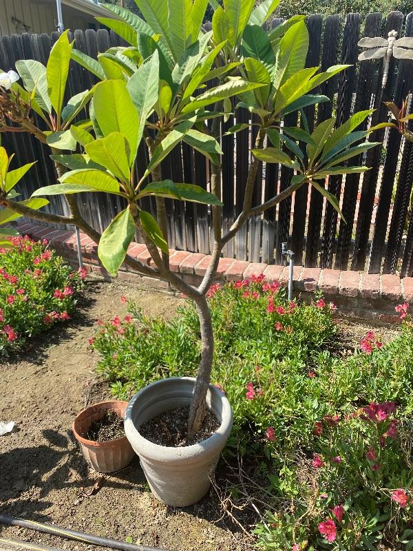 Large potted Plumeria. Almost 5’ in the pot. White with yellow flowers.