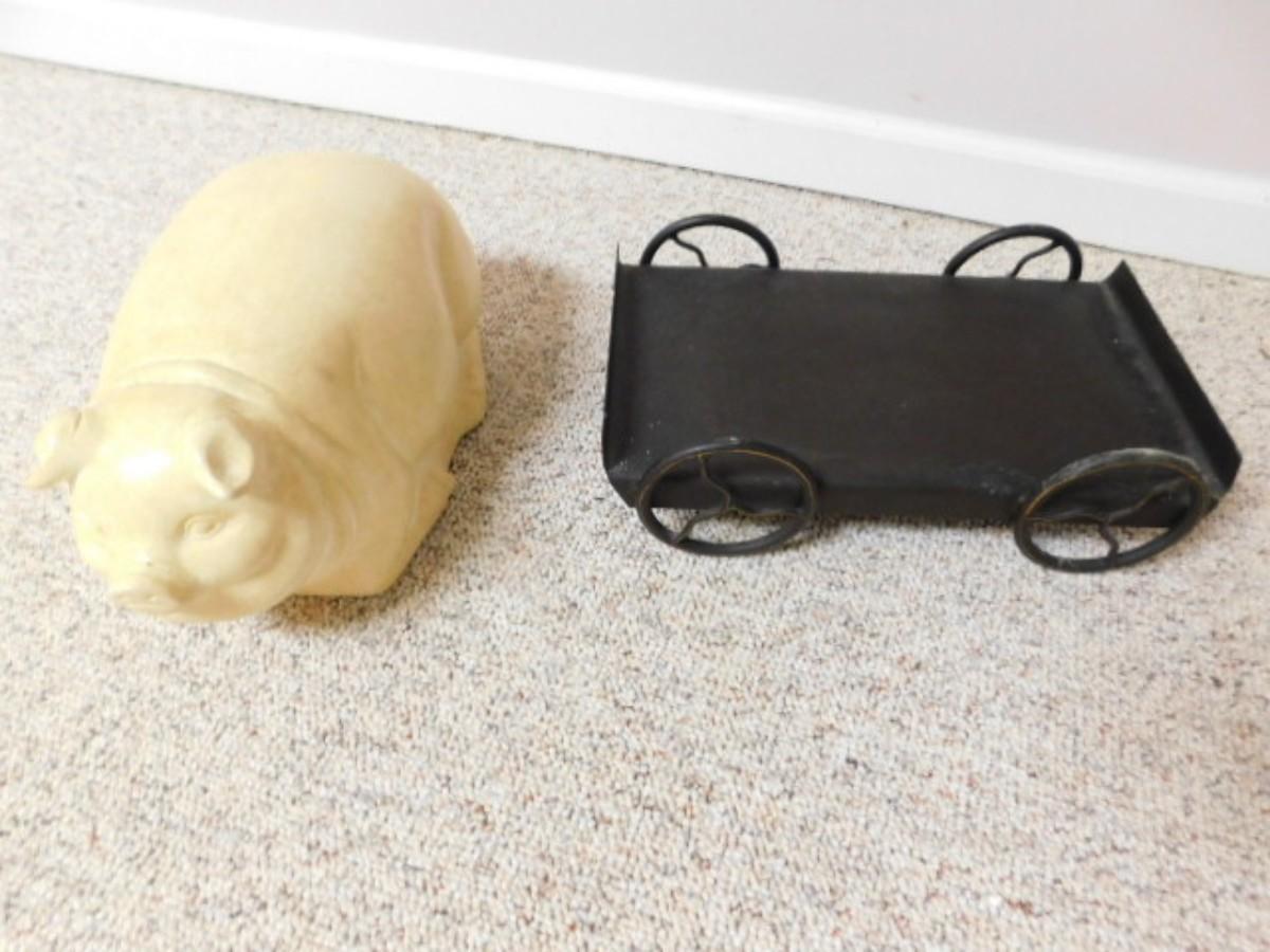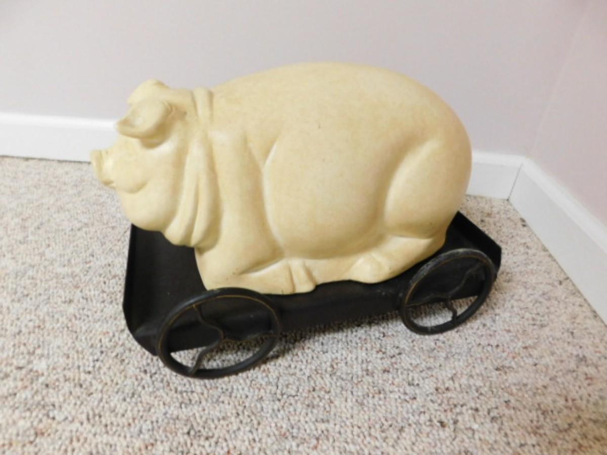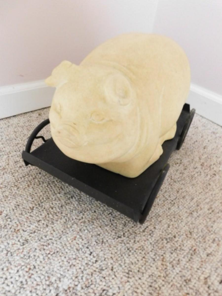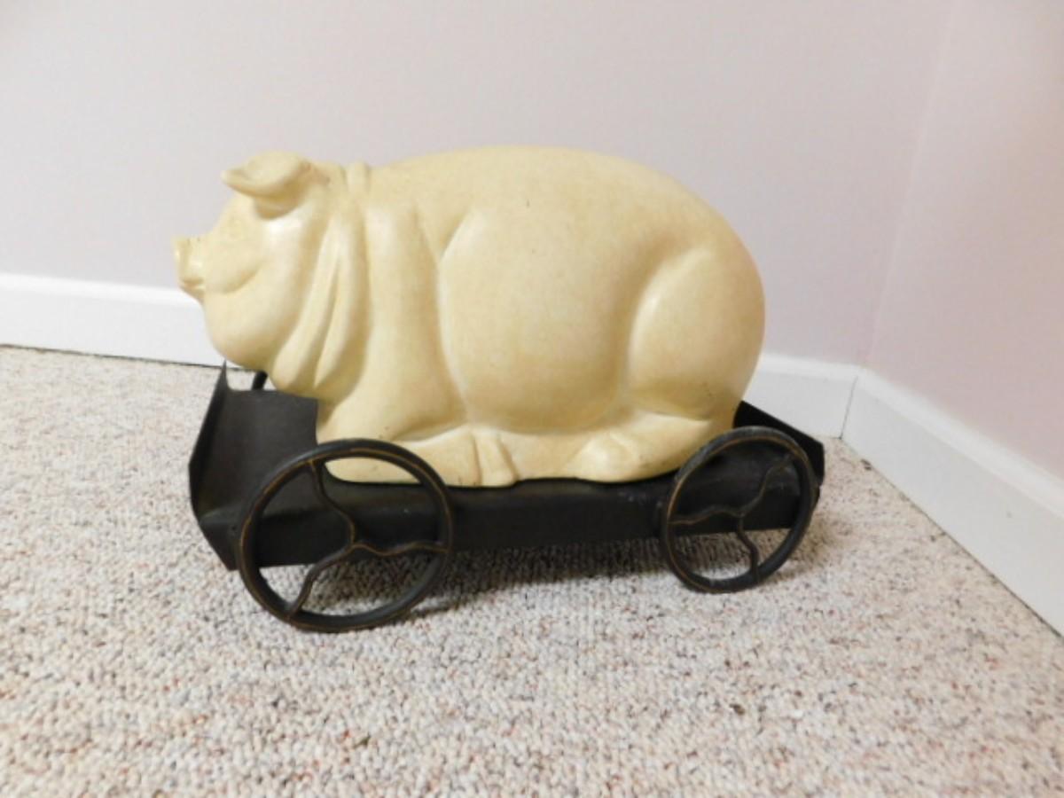Large Pottery Ceramic Hog on Metal Stationary Cart 16"