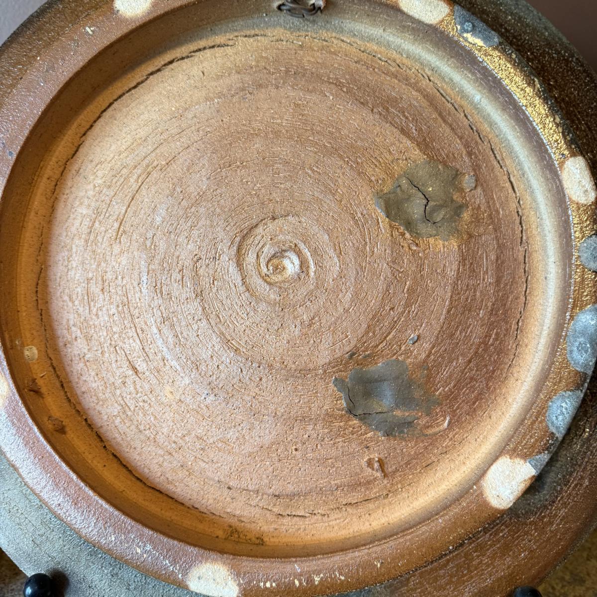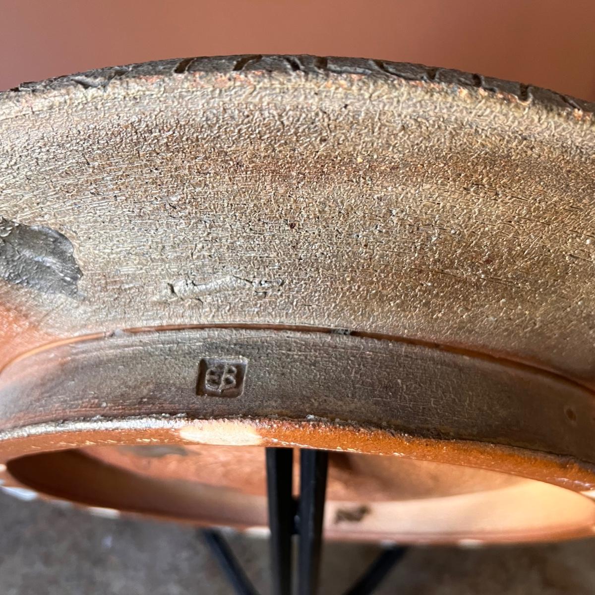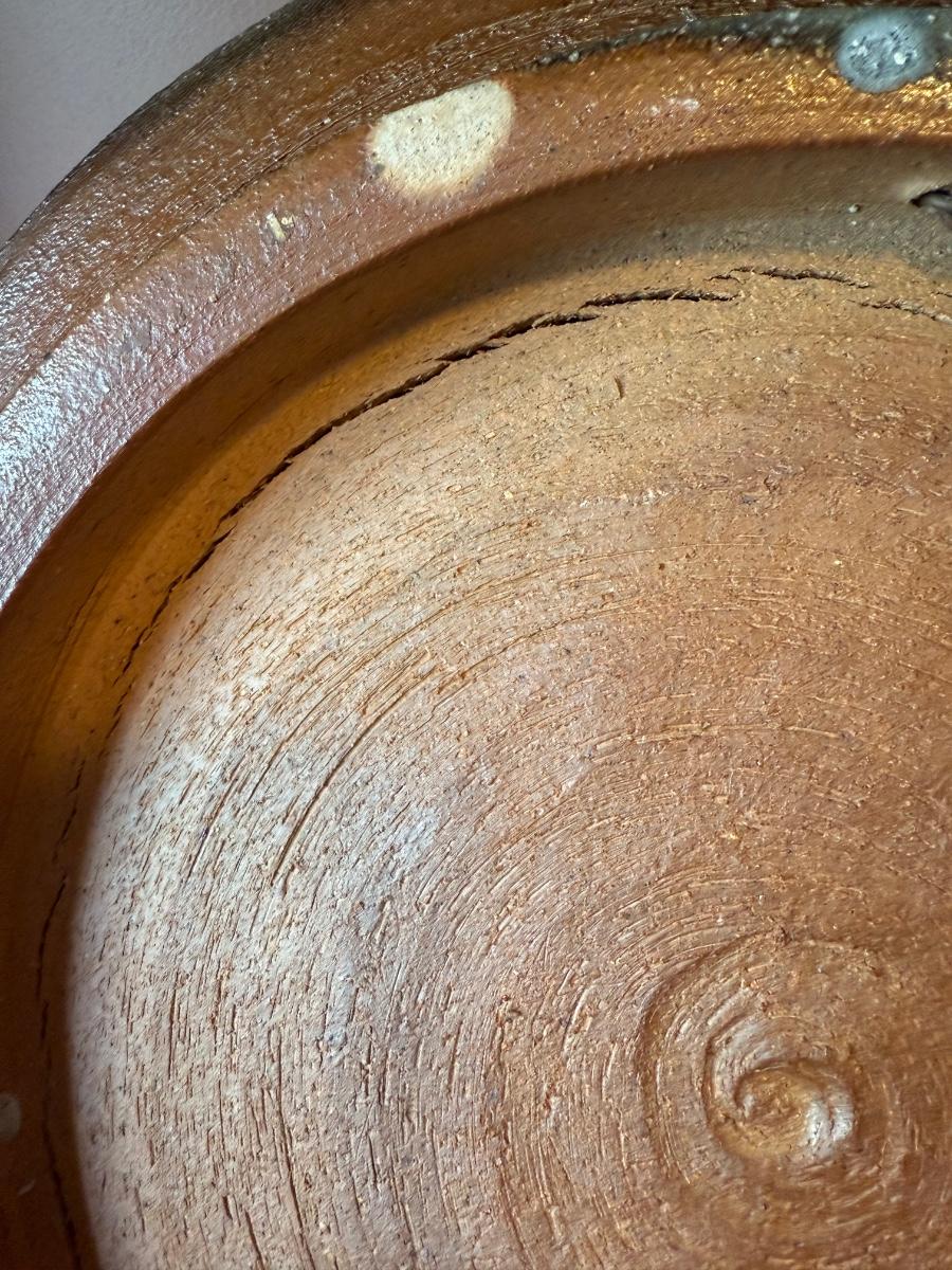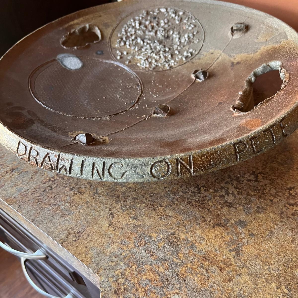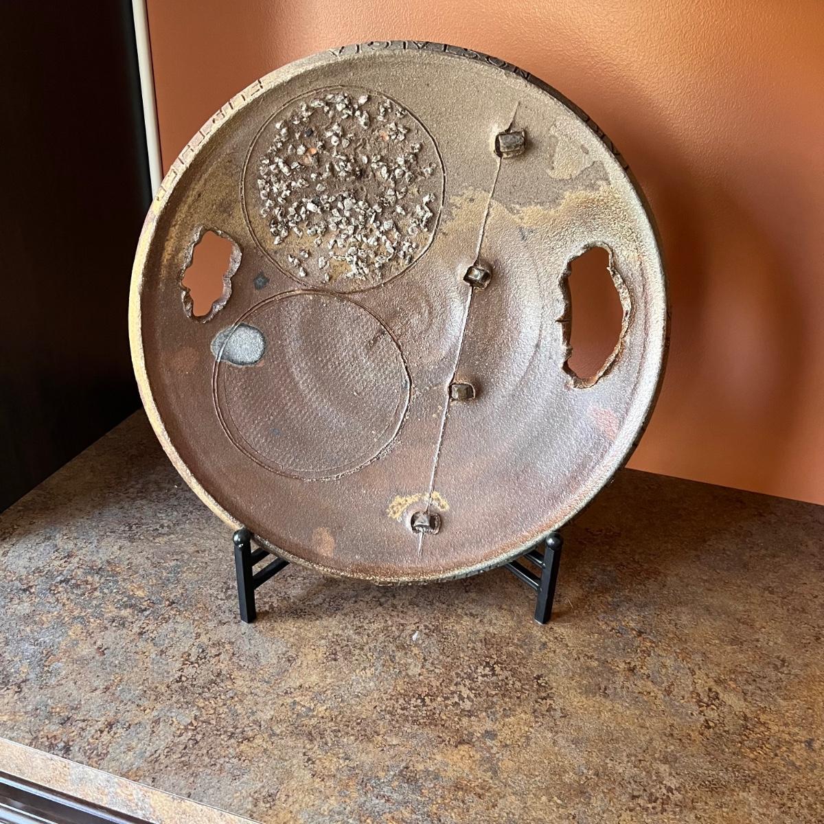 This stunning large plate could certainly be considered a sculpture and has an industrial brutalist effect with its ripped clay holes and added texture. The owner of this estate states this is by David Van Wynsberghe, but no paperwork included and the stamped initials do appear to read EB. Hand carved words along the rim read TAKE NOSTALGIA FURTHER and DRAWING ON PETE and #6.