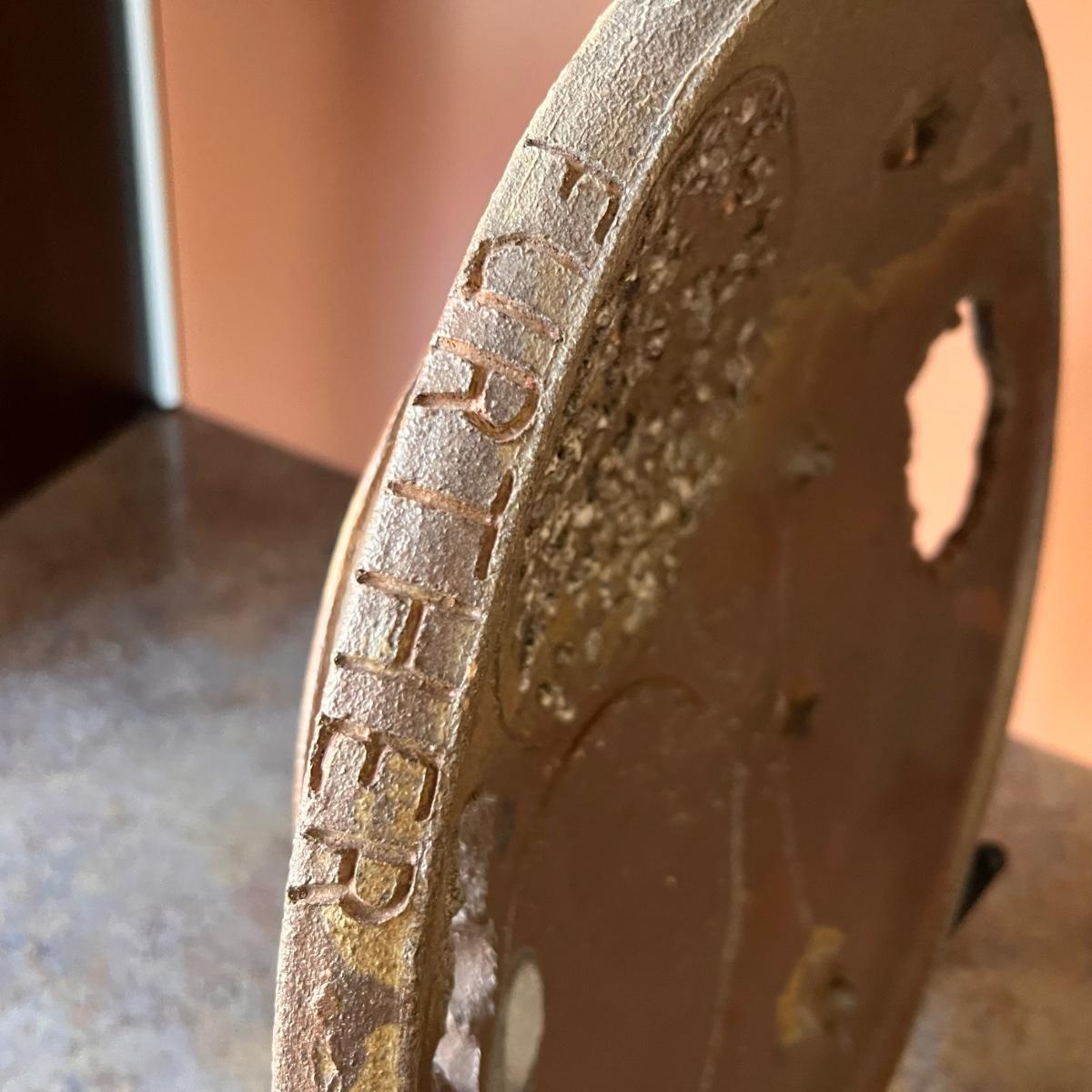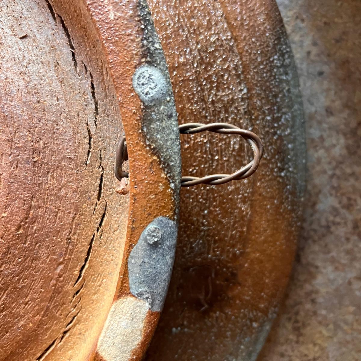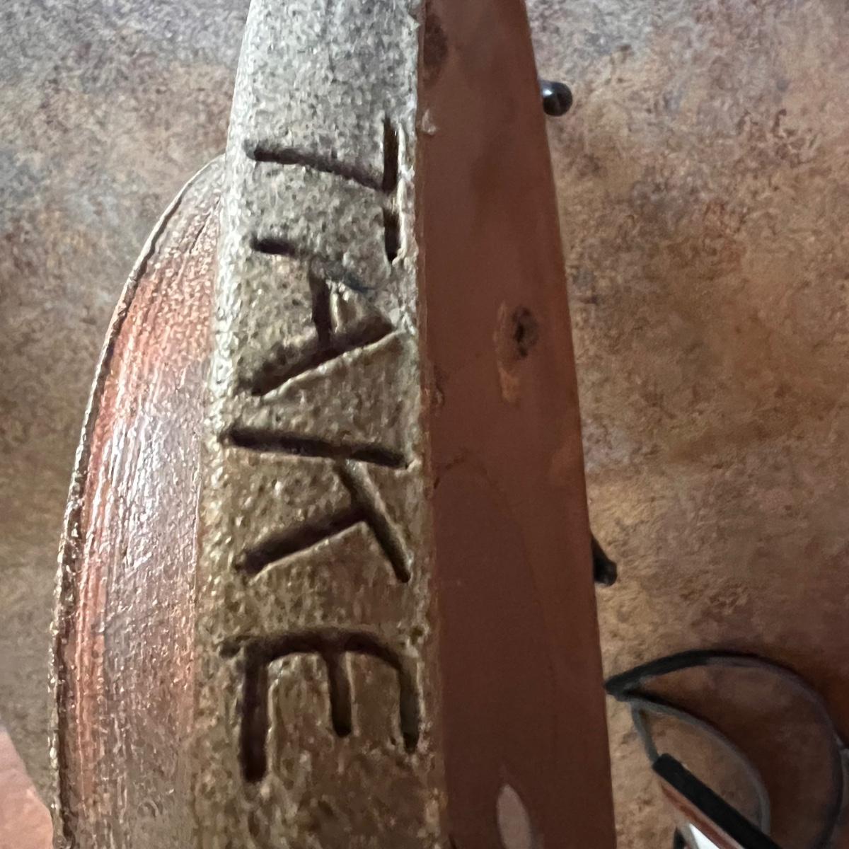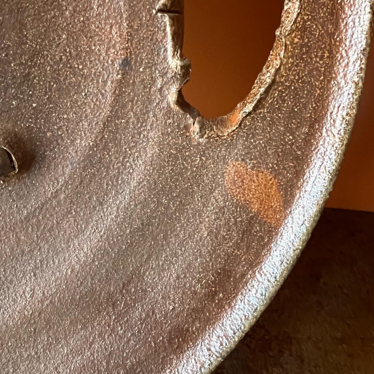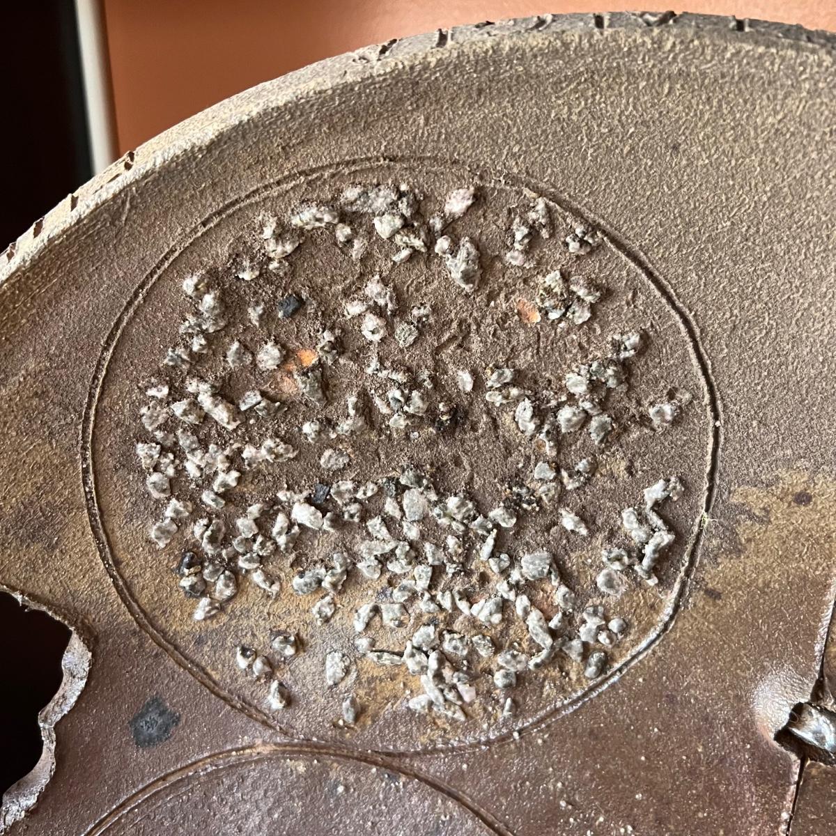 This stunning large plate could certainly be considered a sculpture and has an industrial brutalist effect with its ripped clay holes and added texture. The owner of this estate states this is by David Van Wynsberghe, but no paperwork included and the stamped initials do appear to read EB. Hand carved words along the rim read TAKE NOSTALGIA FURTHER and DRAWING ON PETE and #6.