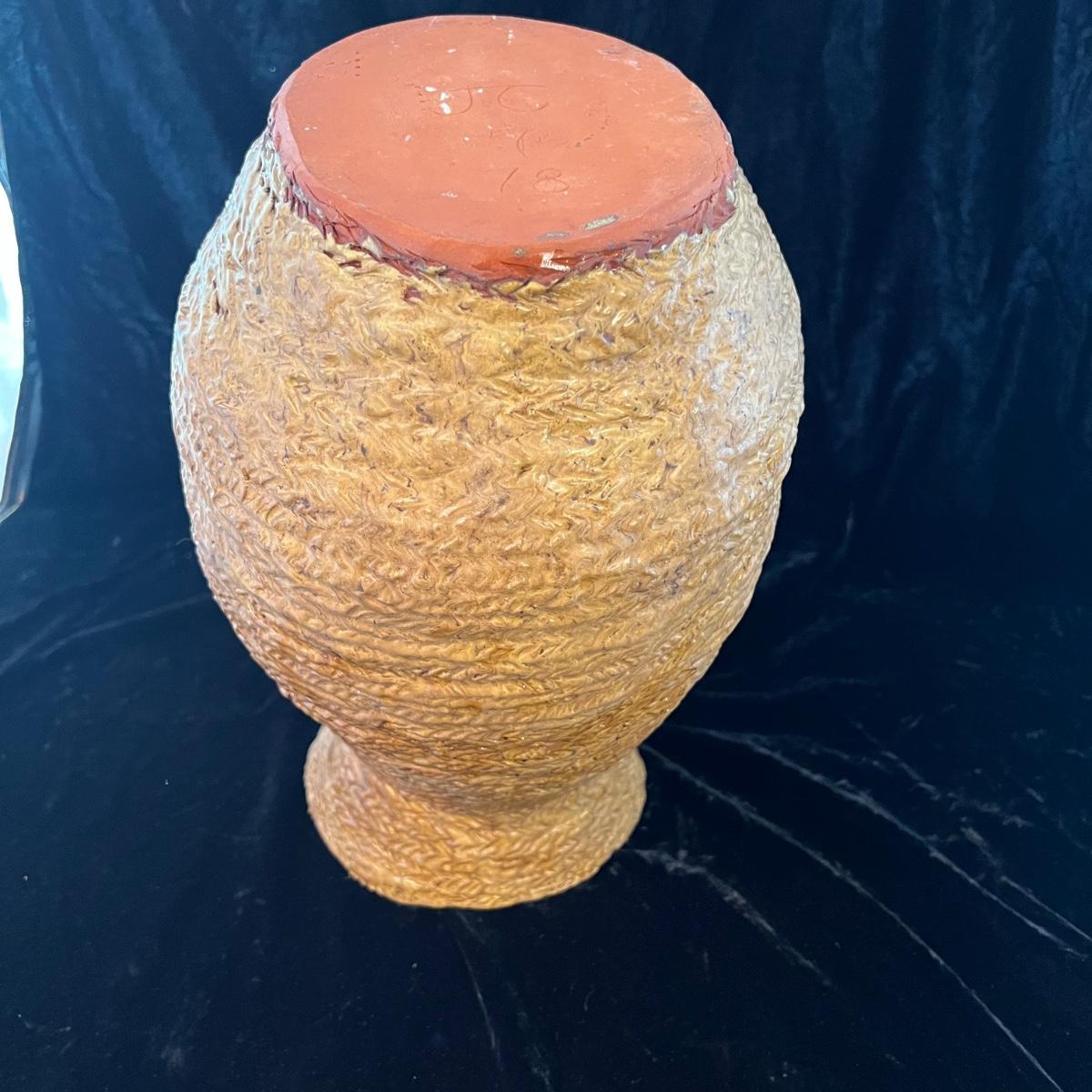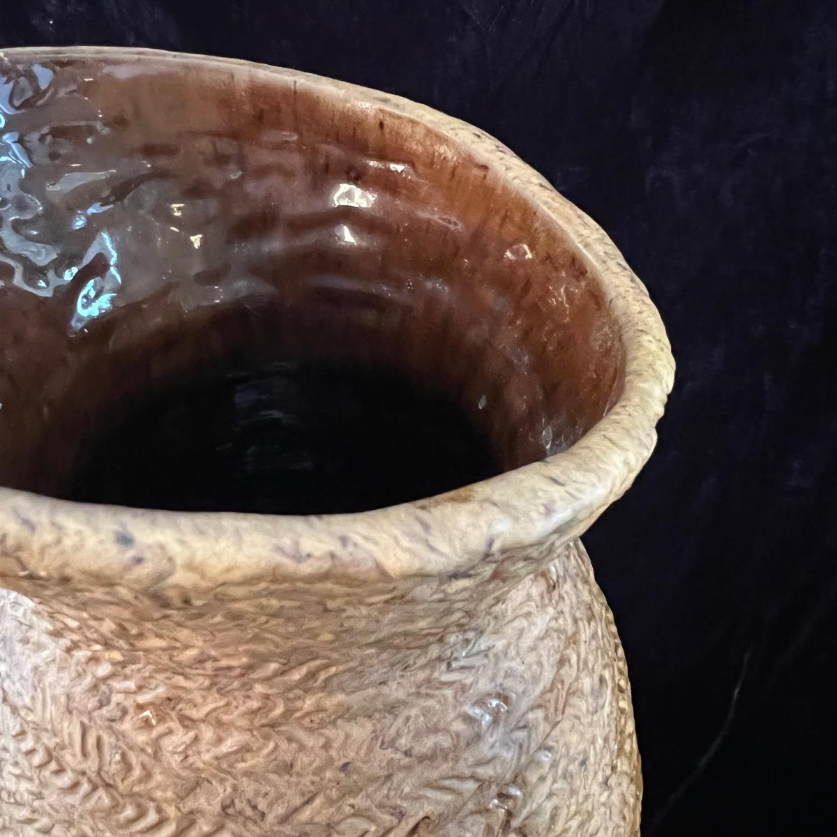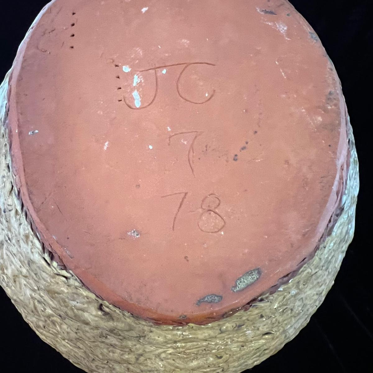 Large urn Suitable for either floor or tabletop. Initials at the bottom read JC 1978. Glaze on the inside is a warm brown, note detail in pictures. The urn itself is 17” tall and roughly 11” wide at its widest point. The inside neck of the piece is 4.5”W. Shipping available. Shipping art can be costly. We suggest calling our local UPS with dimensions and getting an estimate before bidding: (828) 252-6930.