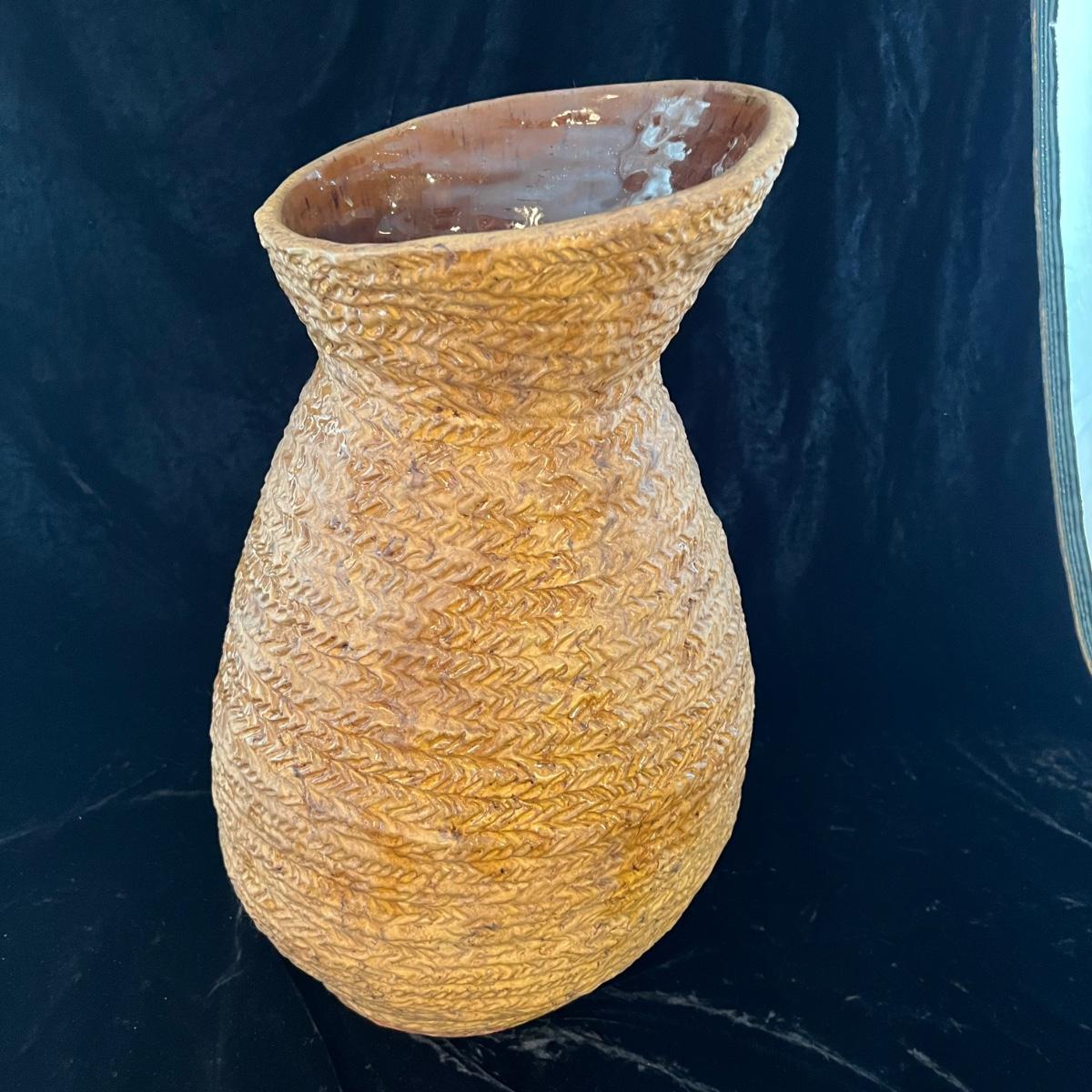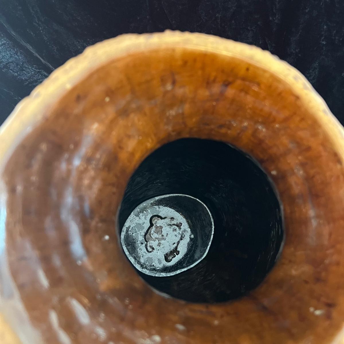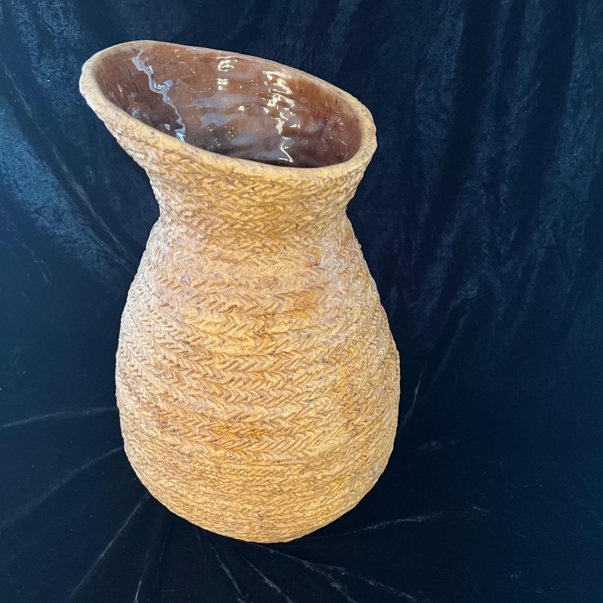 Large urn Suitable for either floor or tabletop. Initials at the bottom read JC 1978. Glaze on the inside is a warm brown, note detail in pictures. The urn itself is 17” tall and roughly 11” wide at its widest point. The inside neck of the piece is 4.5”W. Shipping available. Shipping art can be costly. We suggest calling our local UPS with dimensions and getting an estimate before bidding: (828) 252-6930.