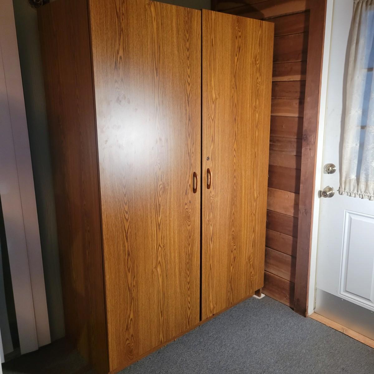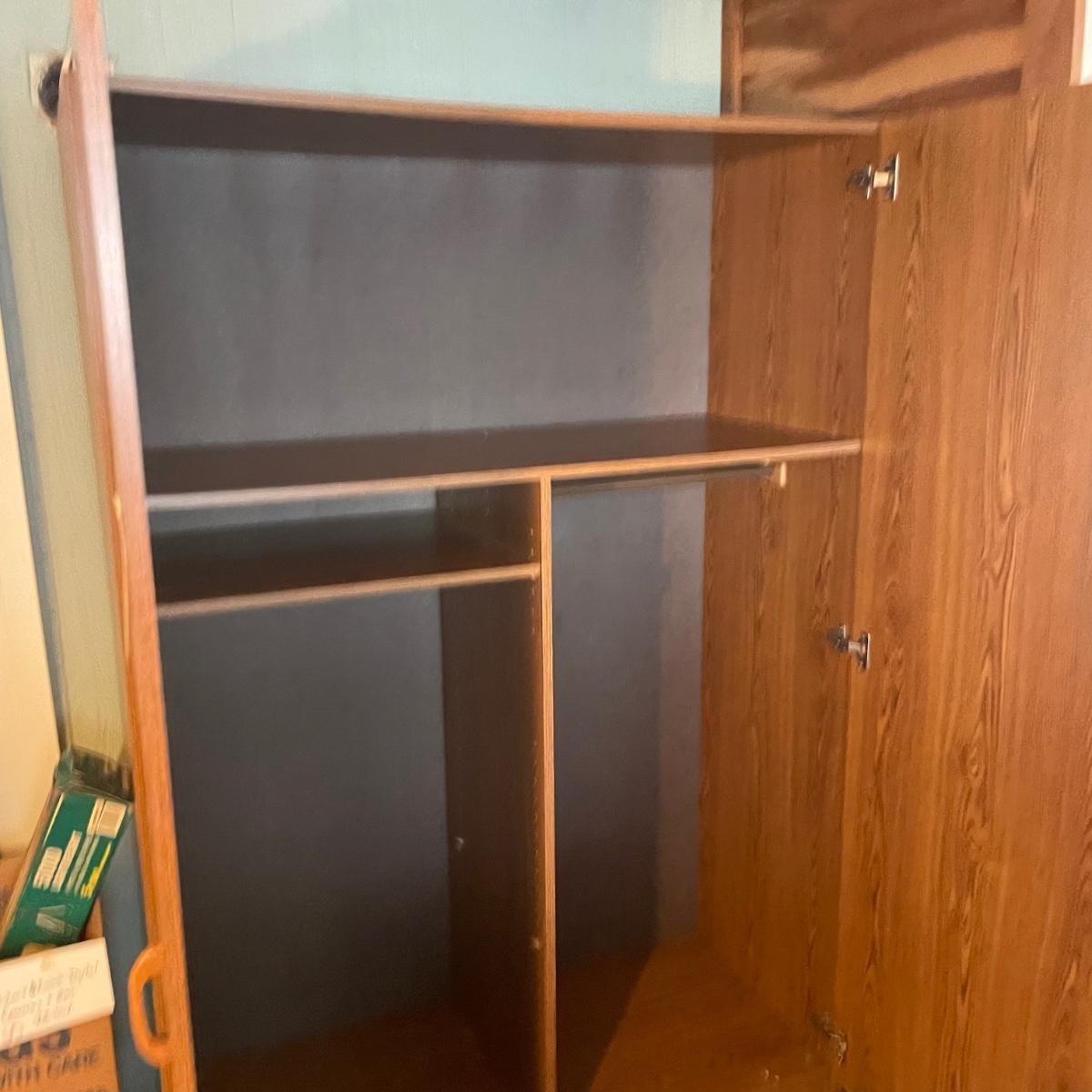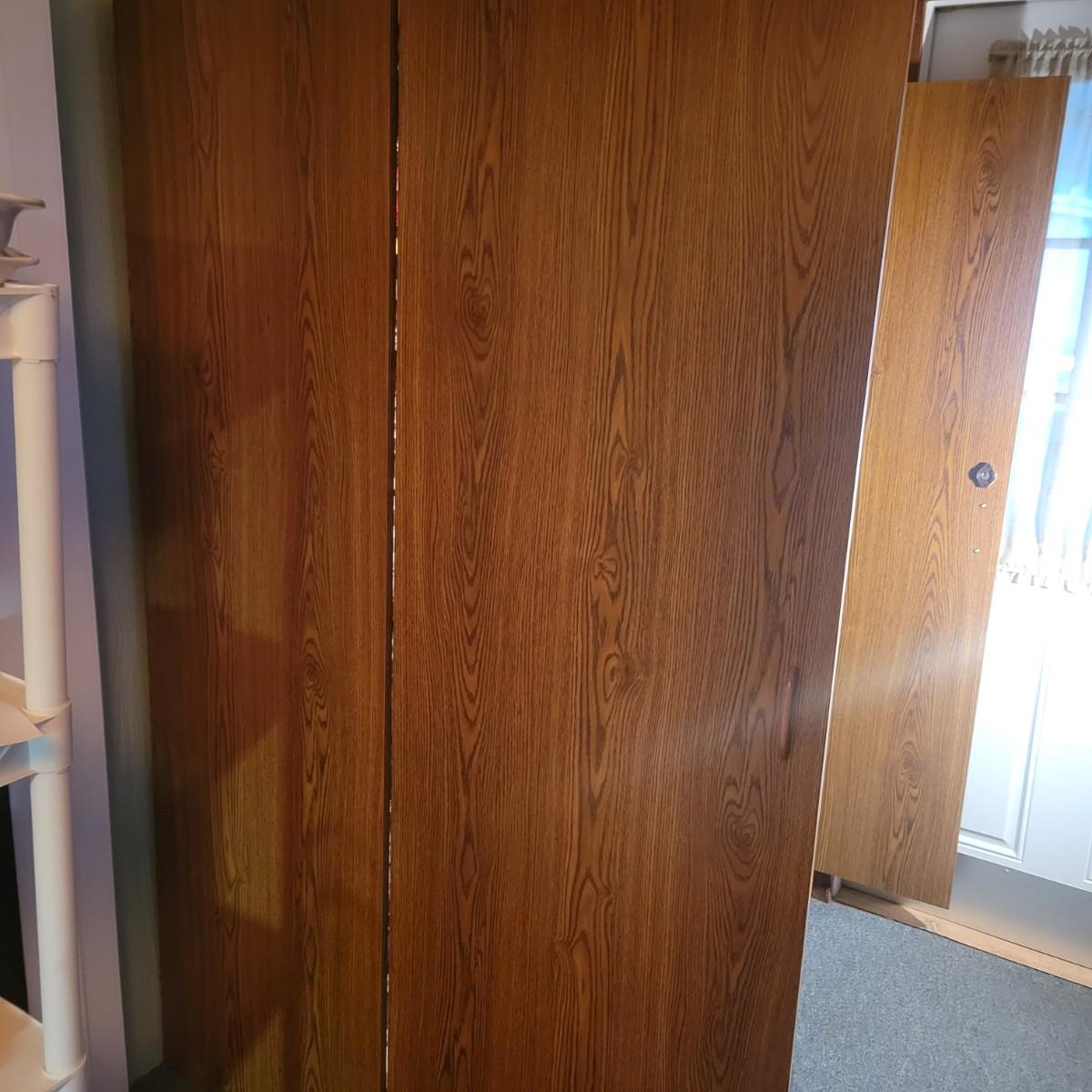 A pressed wood armoire in good condition with no notable damage. Armoire features multiple shelves, a clothes hanging rod on one side. There is no key for the lock. Additional items not included in this lot, but are available in another lot. Armoire measures approximately 48" x 21" x 72" Local pickup only