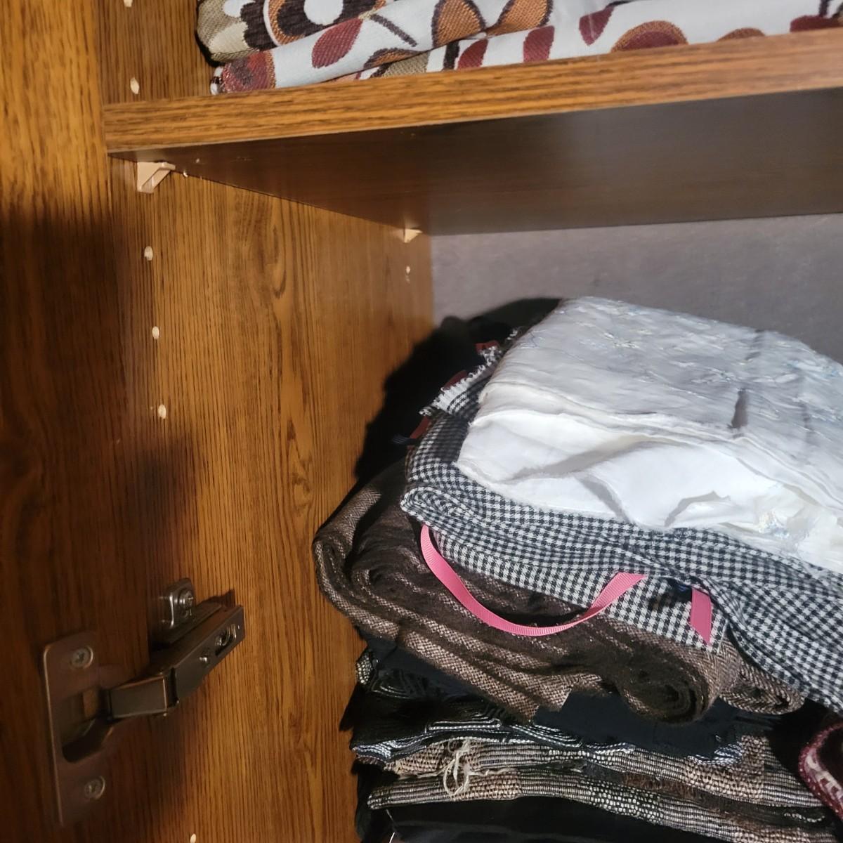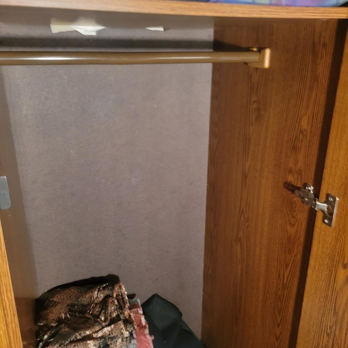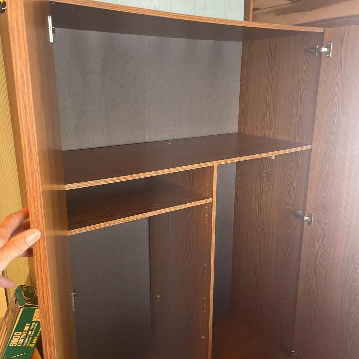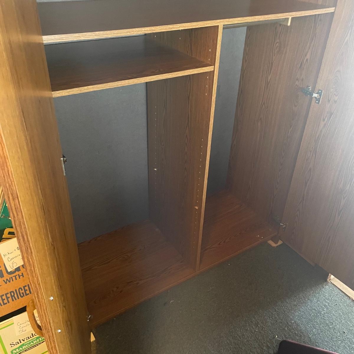 A pressed wood armoire in good condition with no notable damage. Armoire features multiple shelves, a clothes hanging rod on one side. There is no key for the lock. Additional items not included in this lot, but are available in another lot. Armoire measures approximately 48" x 21" x 72" Local pickup only