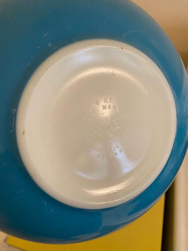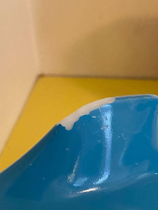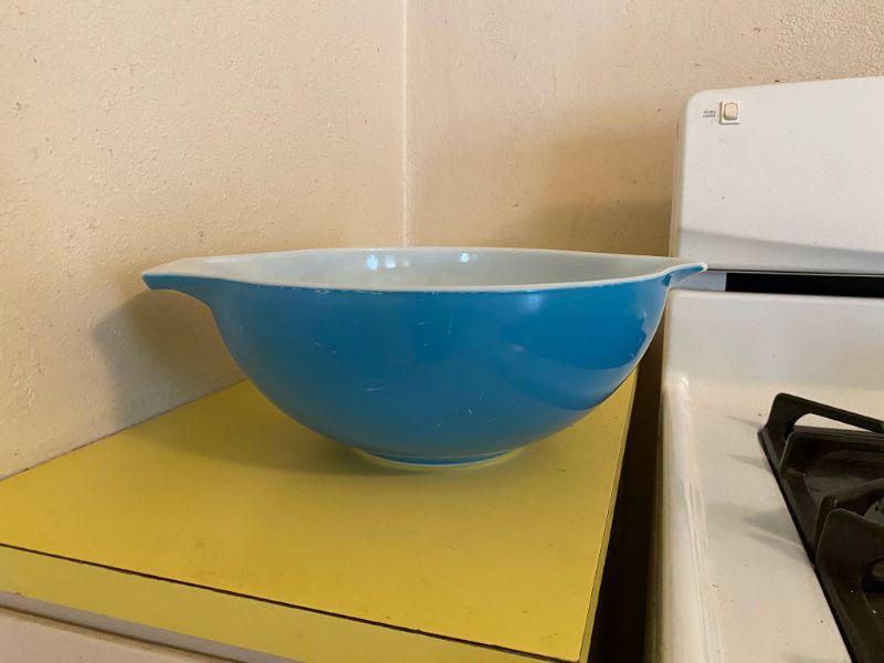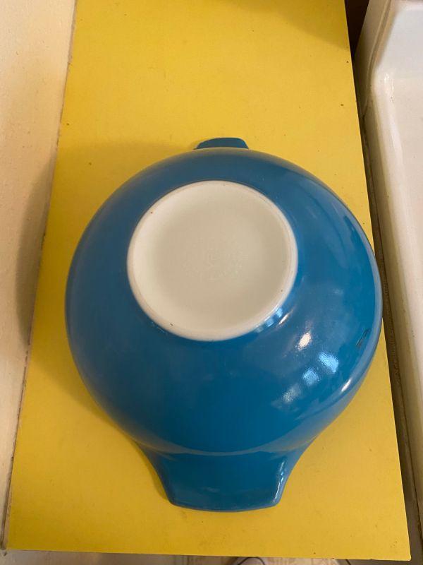 Large primary blue Pyrex mixing bowl. Largest bowl. There is a decent chip in one of the handles. Color looks good, still useable.