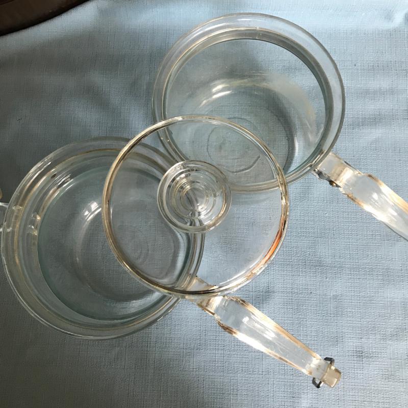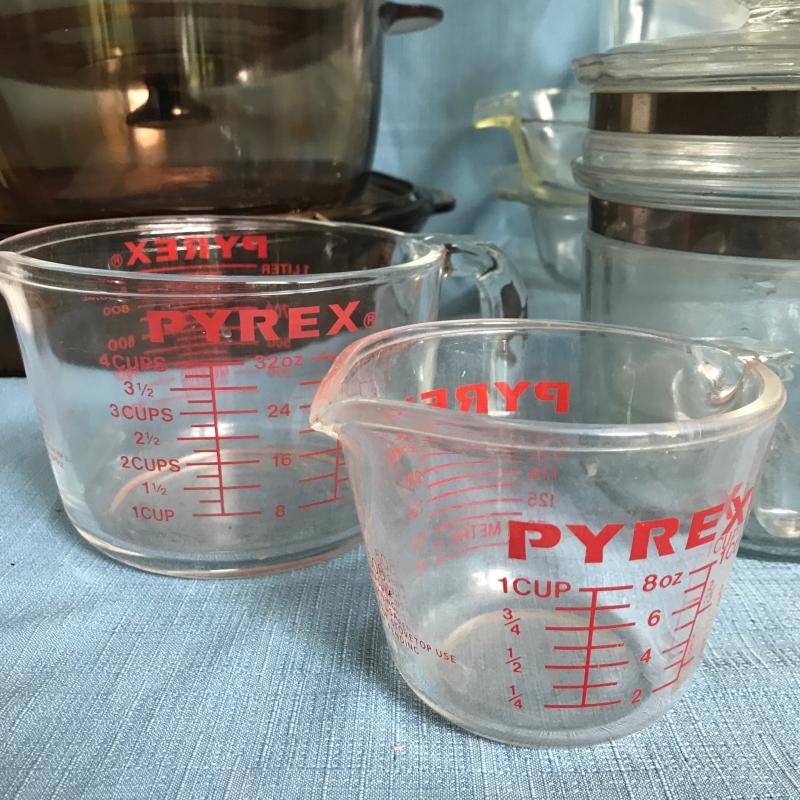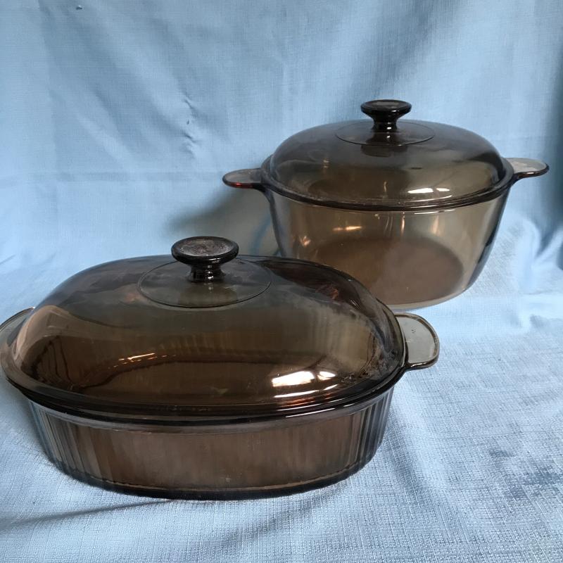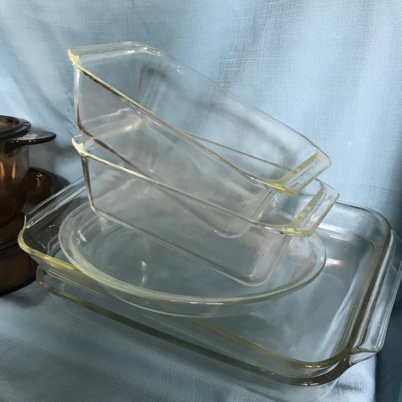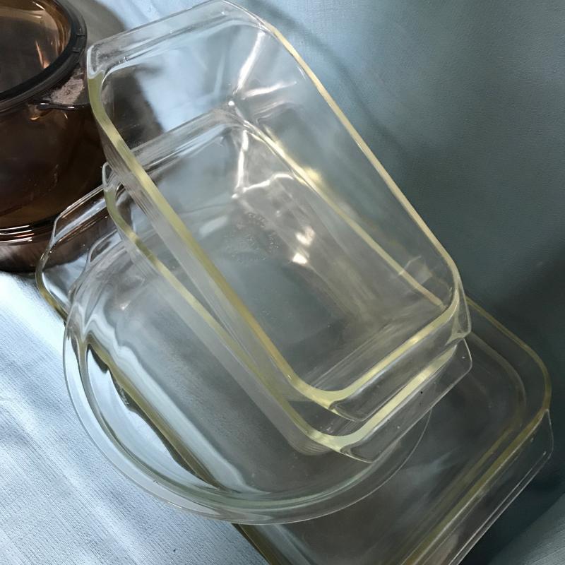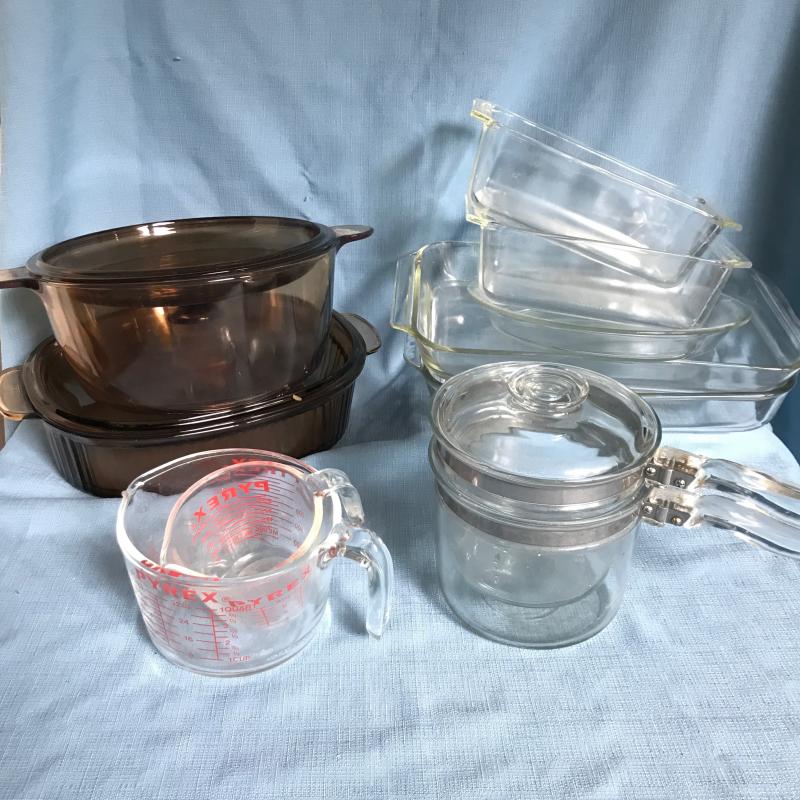 Pyrex lot includes two bread pans, two measuring glasses, a double boiler, 2 casserole dishes, and a pie pan. Also includes 2 brown Vision baking dishes with lids, No shipping available. Local pickup only in Hendersonville, NC.