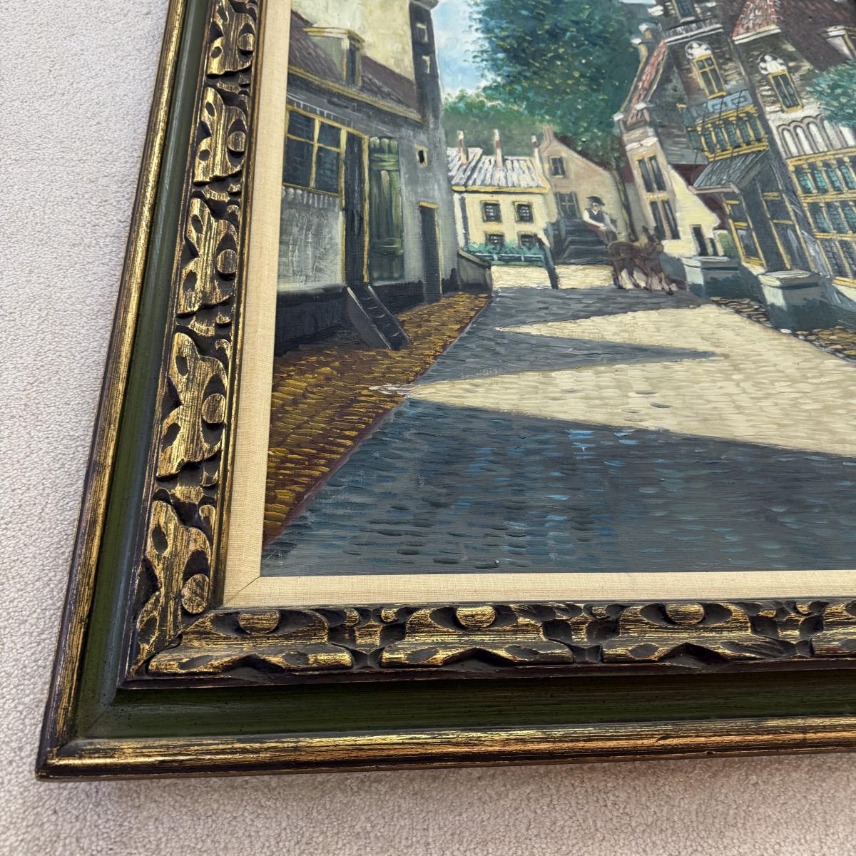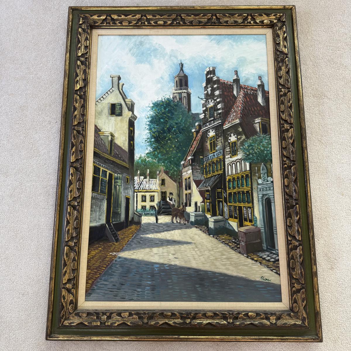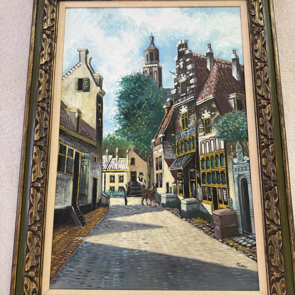This lot contains a stunning large original painting of a quaint village by artist Shoe. After some research we assume this could be a rendition of a famous image “Dutch Town Horse and Wagon” by Steenhouwer. This peaceful painting sits behind a green and gold wooden frame, there is no glass. It measures 32” x 44” and sits 2.5” from the wall. This piece has hardware to be hung. Shipping available. Shipping can be costly. We suggest contacting our preferred local shipping provider, Postage Express, with dimensions and getting an estimate before bidding: (828) 255-9250 or shipping@postageexpressnc.com.