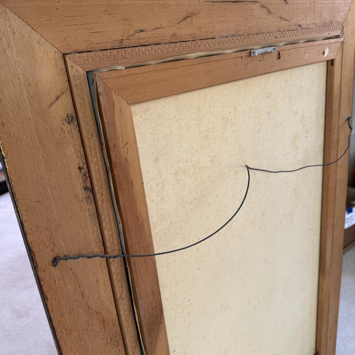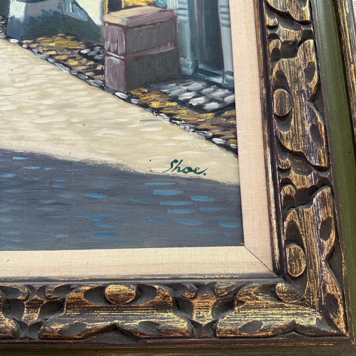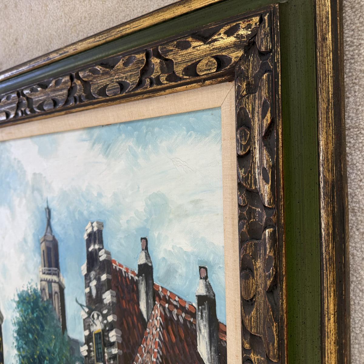 This lot contains a stunning large original painting of a quaint village by artist Shoe. After some research we assume this could be a rendition of a famous image “Dutch Town Horse and Wagon” by Steenhouwer. This peaceful painting sits behind a green and gold wooden frame, there is no glass. It measures 32” x 44” and sits 2.5” from the wall. This piece has hardware to be hung. Shipping available. Shipping can be costly. We suggest contacting our preferred local shipping provider, Postage Express, with dimensions and getting an estimate before bidding: (828) 255-9250 or shipping@postageexpressnc.com.