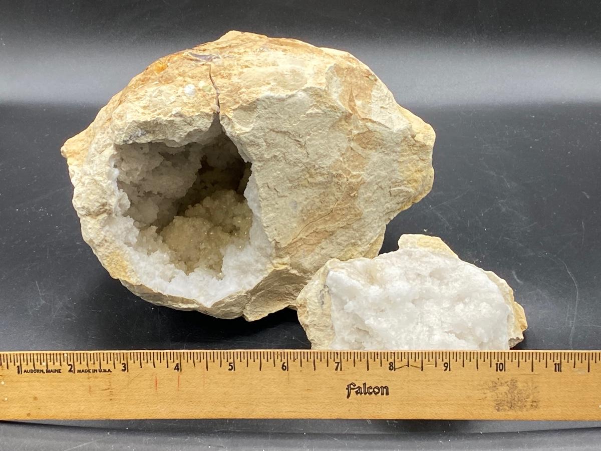 Large Quartz Crystal Filled Hollow Geode Rock. Has been broken open and has cracking from it. May break into pieces if dropped or set down to hard by looking at the fractures on the outside. Beautiful sparkle inside. About 7" rock.