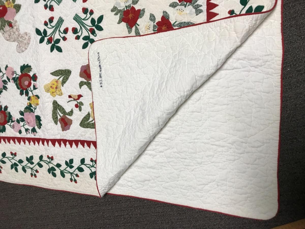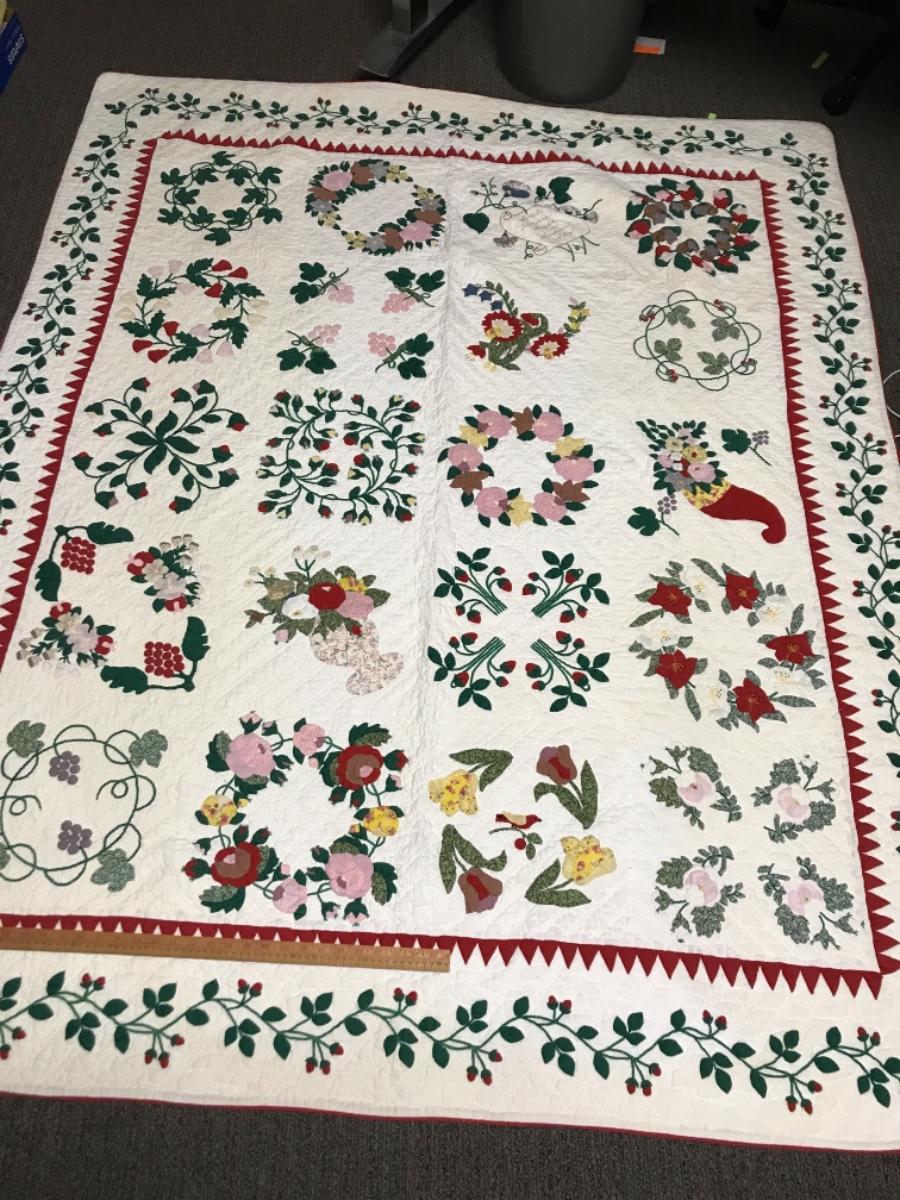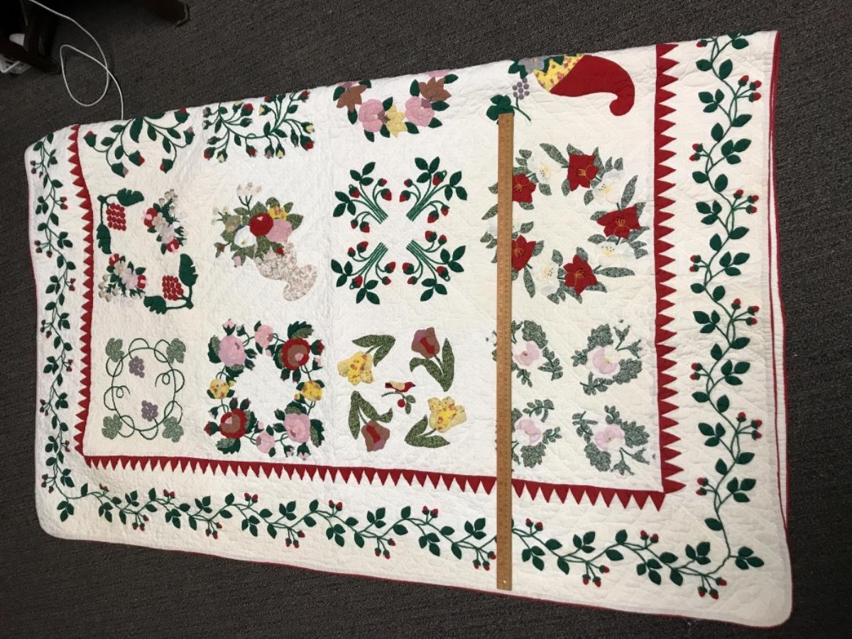 Large quilt, red, white, green, pattern of flowers & strawberries