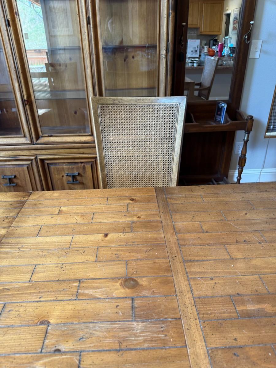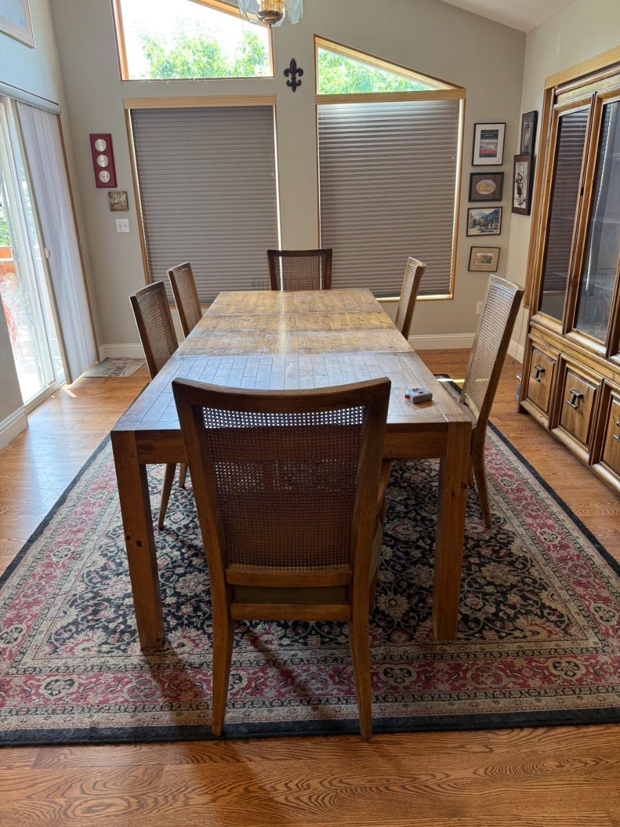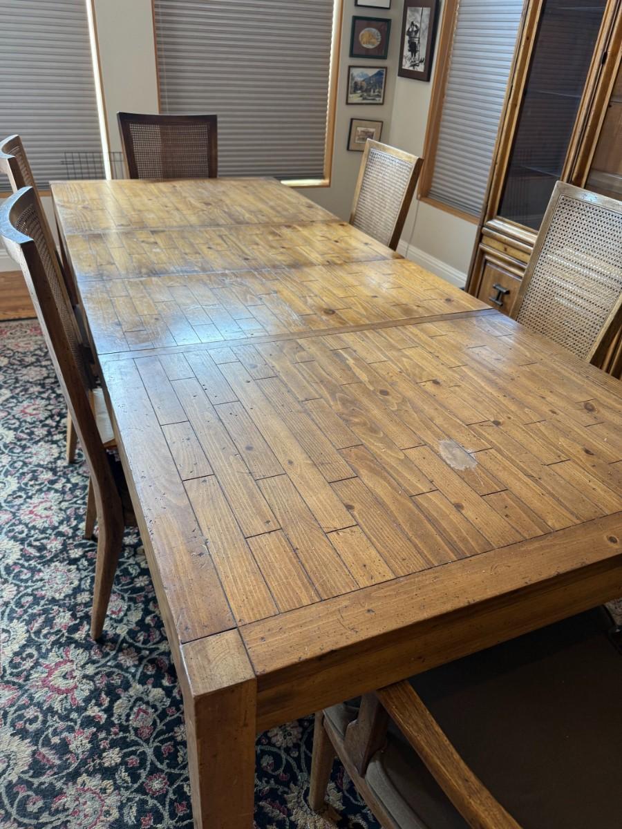 Rustic wood dining table with plank inlay top and matching chairs (6 total). Leaf included for extended seating.