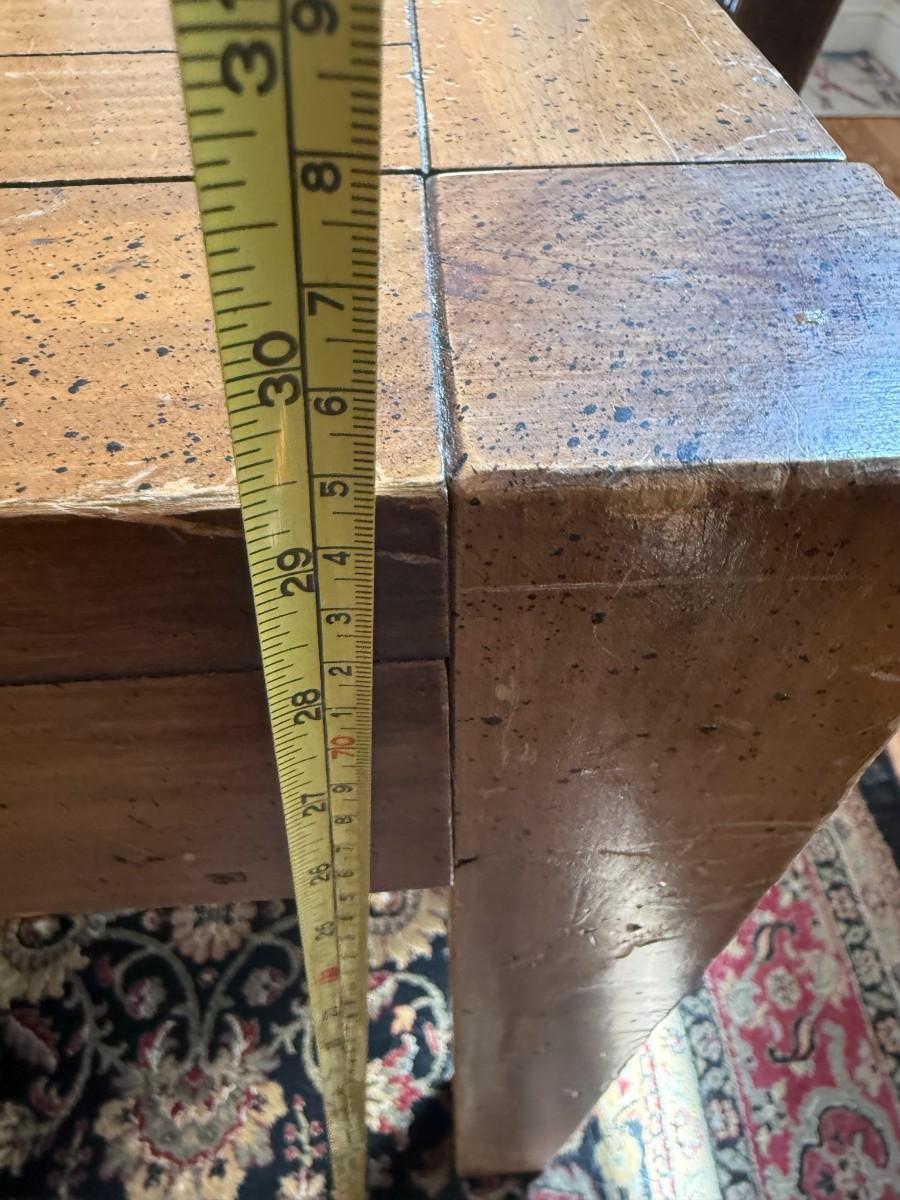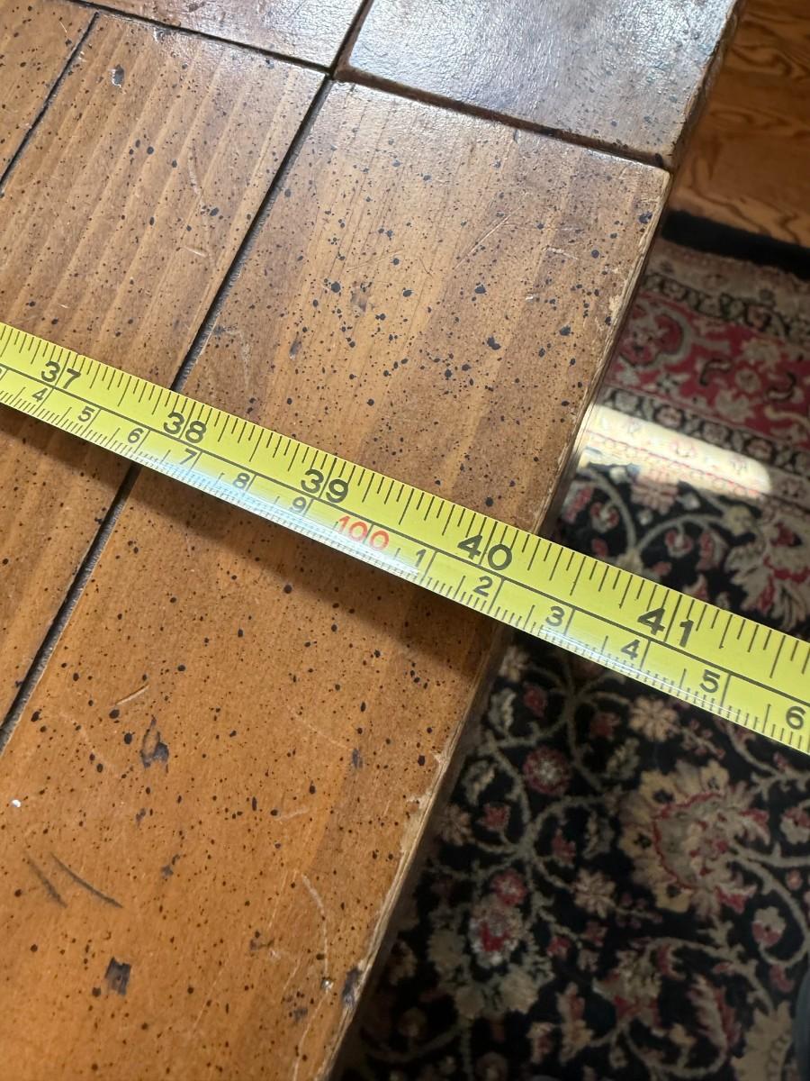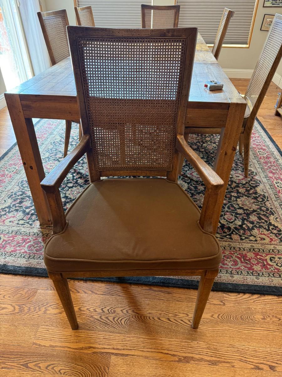Rustic wood dining table with plank inlay top and matching chairs (6 total). Leaf included for extended seating.