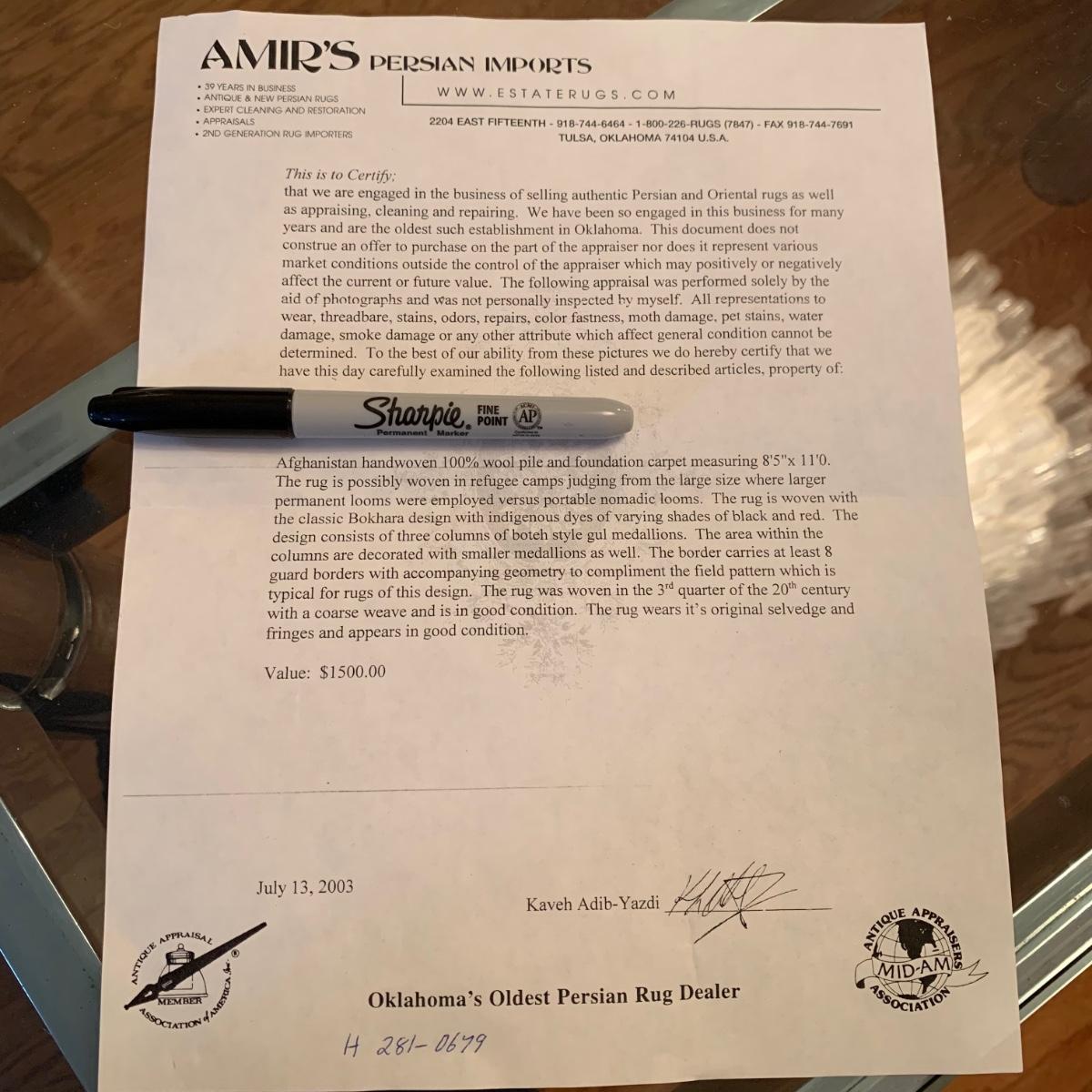 Beautiful 8.5’ x 11’ 100% wool handwoven area rug from Afghanistan. Rug pad included. Information from a past appraisal included as well.