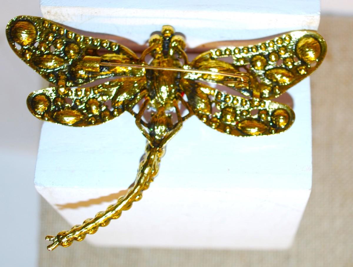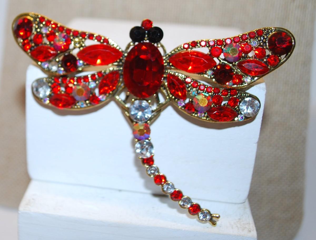 Large Red Dragonfly BROOCH (3½" x 2½") with an Oval Red Center Stone on a Gold Tone Setting