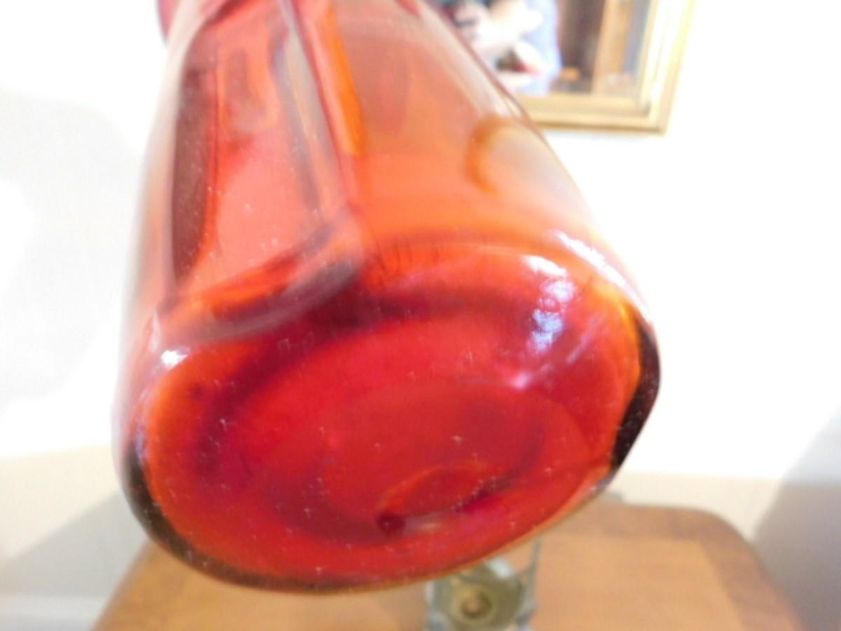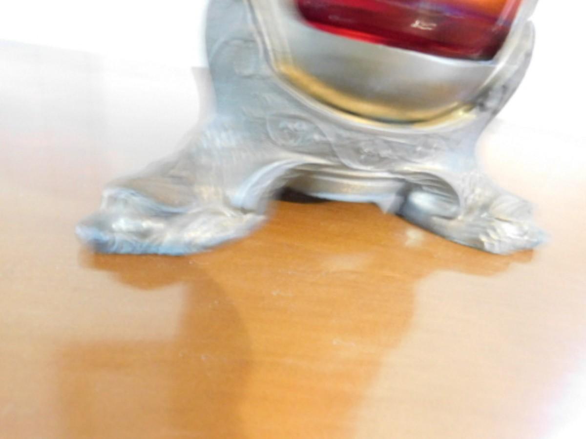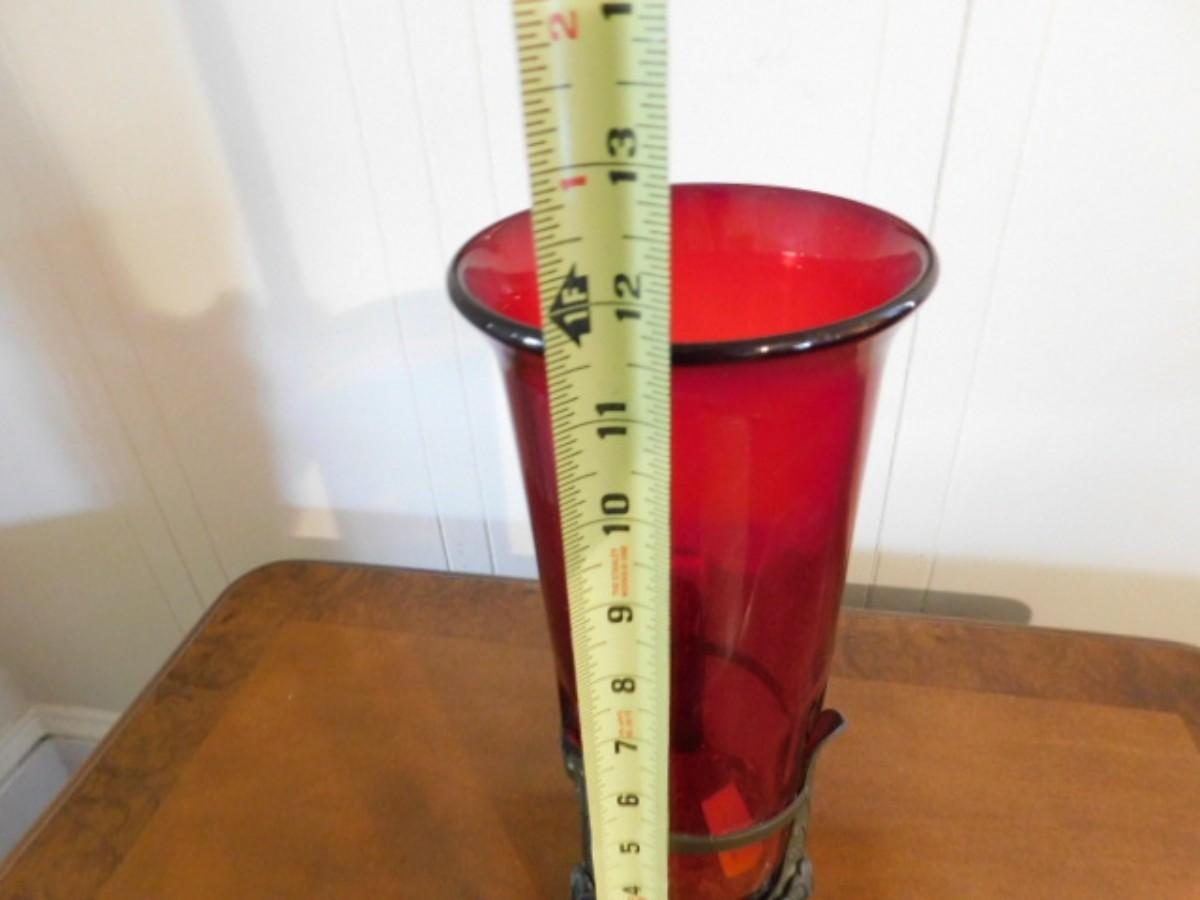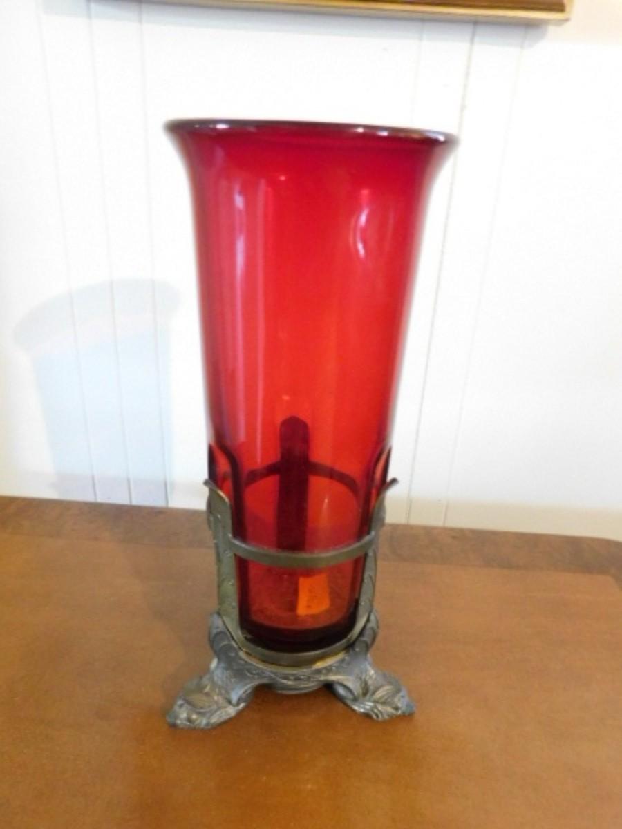 Large Red Glass Candle Holder with Cast Metal Cradle