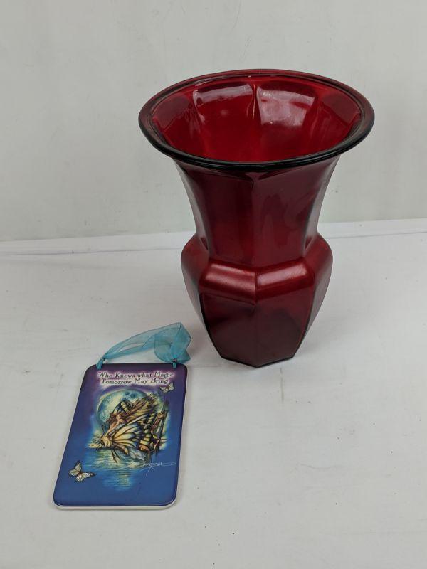 Large Red Glass Vase & Fairy Sign (Who Knows What Magic Tomorrow Brings)