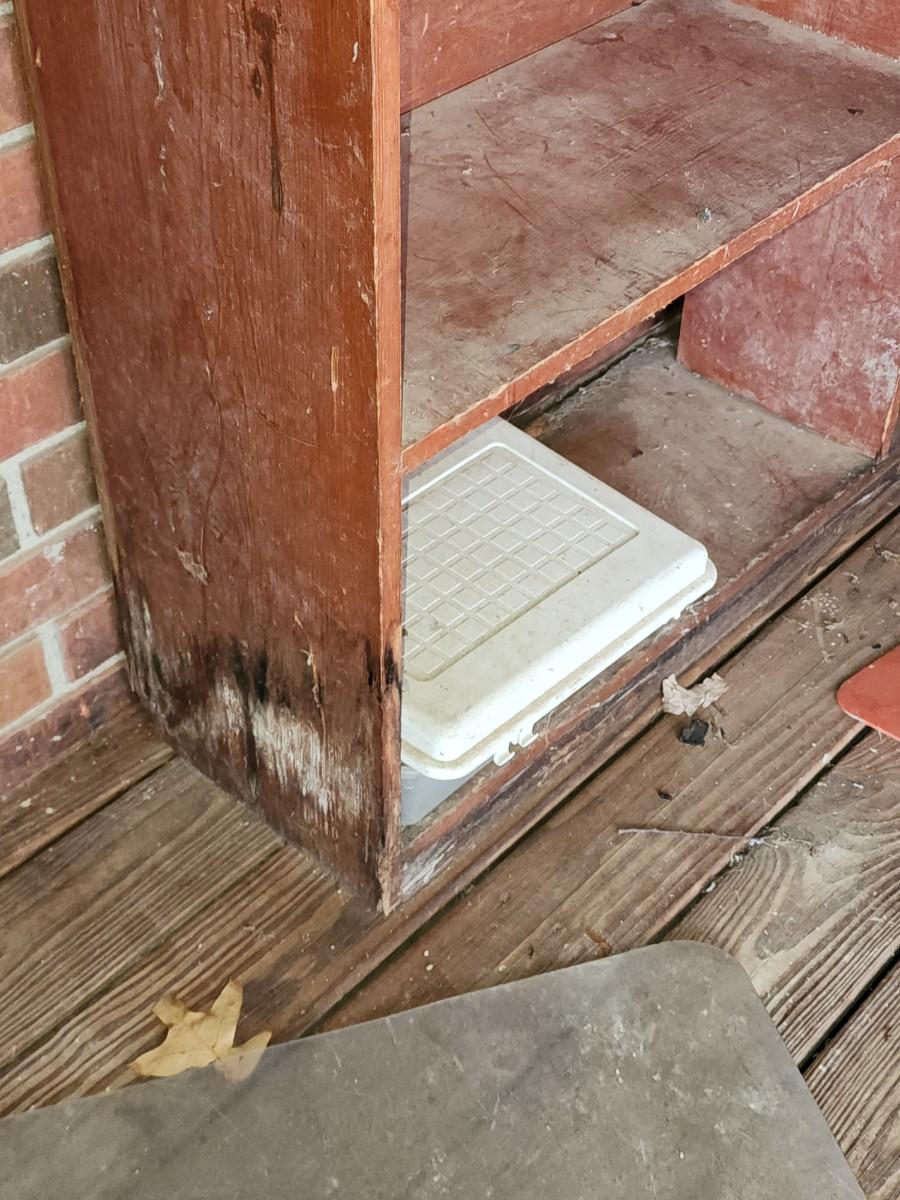 Has been on a deck. Bottom shelf looks worn. 78 inches tall