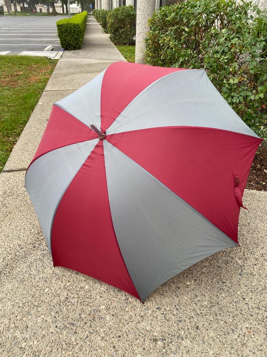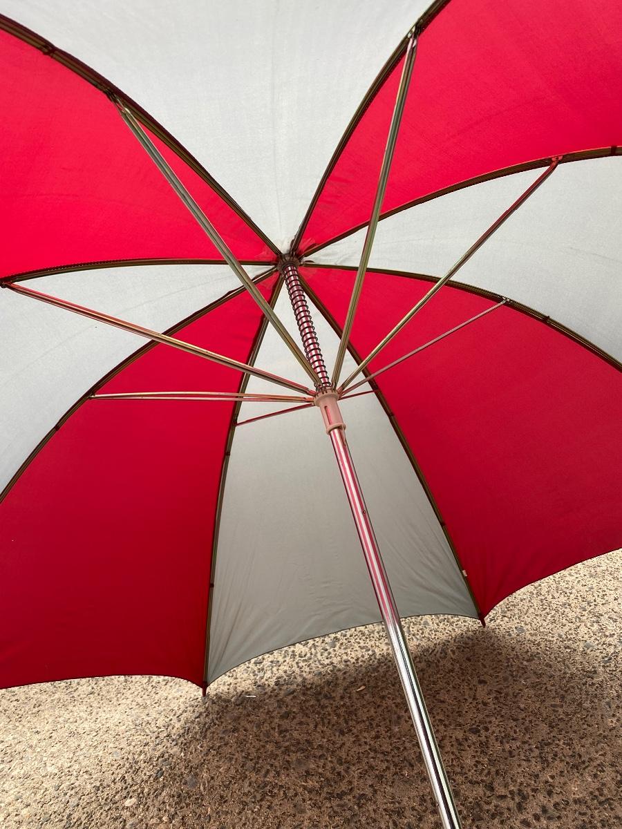 Large Red & Silver Colored Umbrella, there is no significant wear to the umbrella and is in good useable condition. Check pictures for more details.