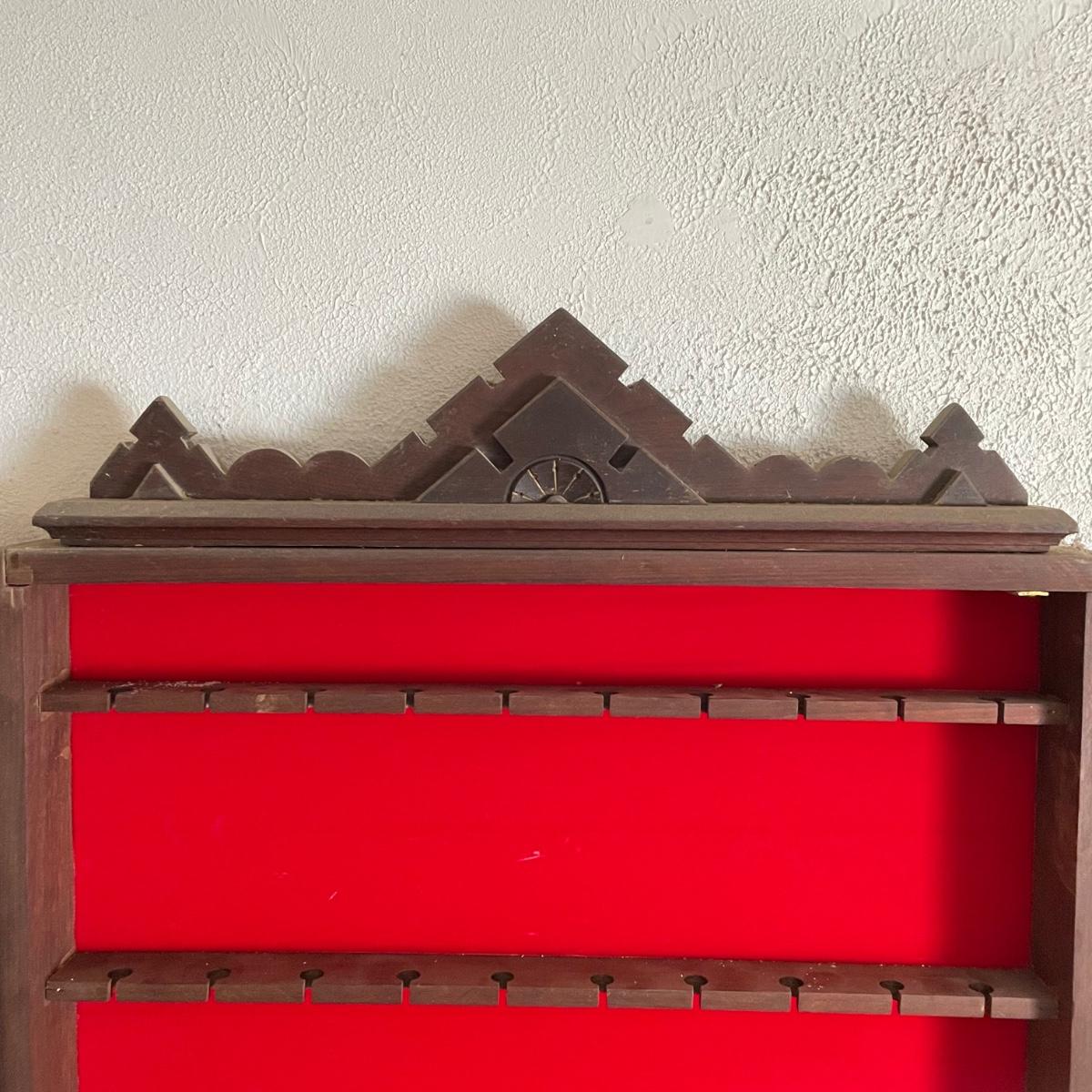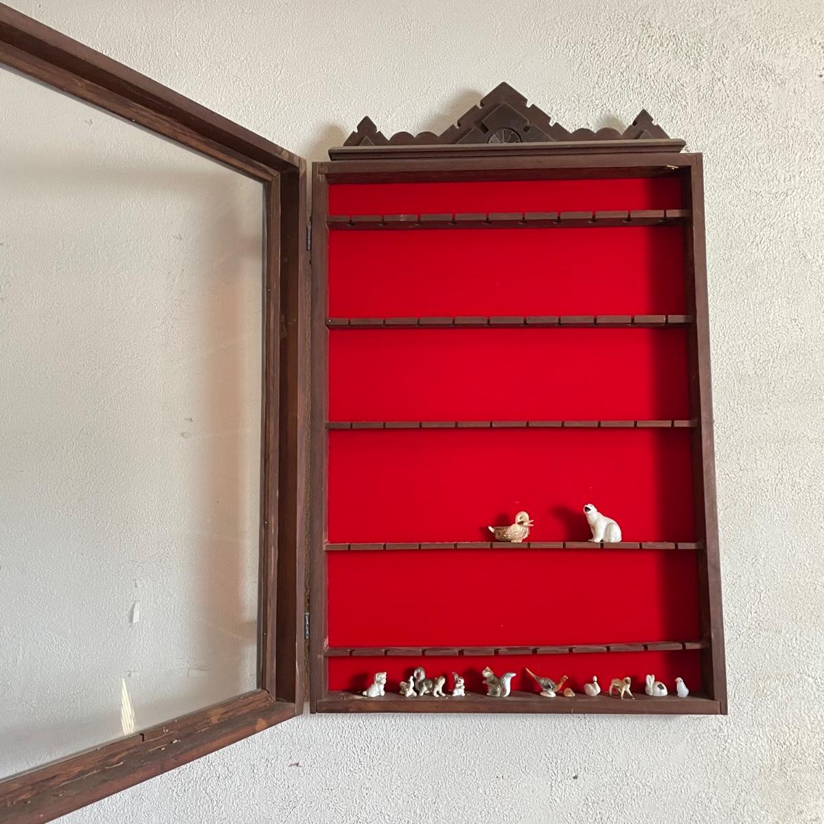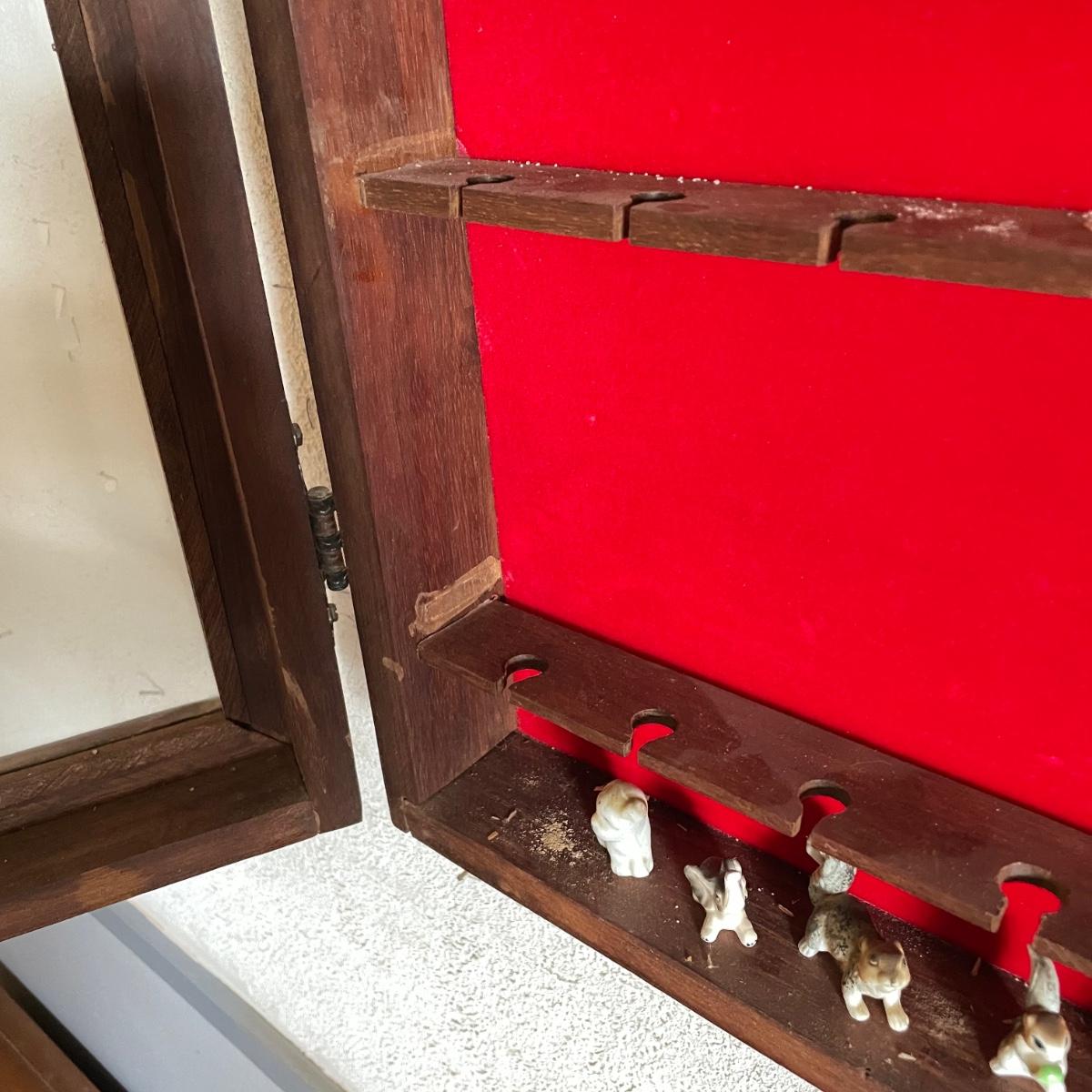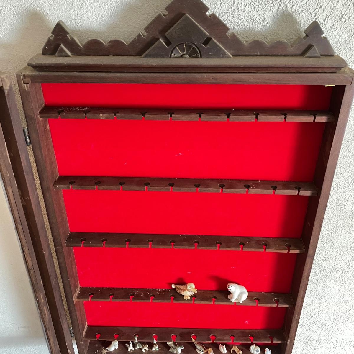Stunning vintage shadow box measures 22” x 4.5” x 36”. Piece has five shelves carved for items like collectible spoons. The bottom shelf needs a small repair, probably glued back in place would be easily accomplished. The top of the box has nicely geometric carved designs. The red cloth lined back panel is probably velvet and has just a couple blemishes. Box starts your curio collection with small ceramic and porcelain figurines, no known markings on figures. See images. Local pick up only.