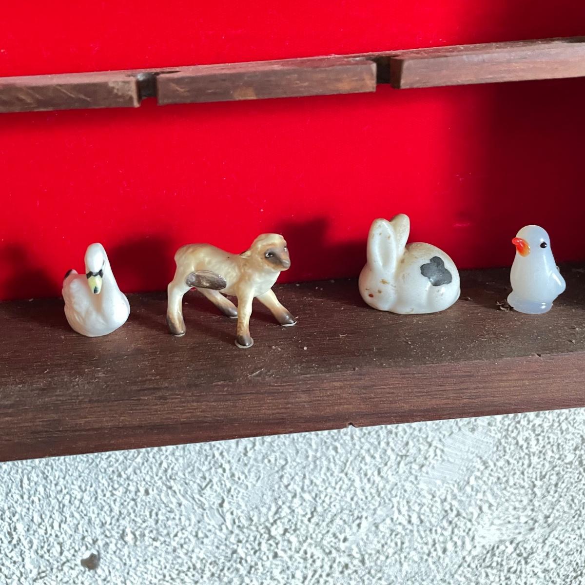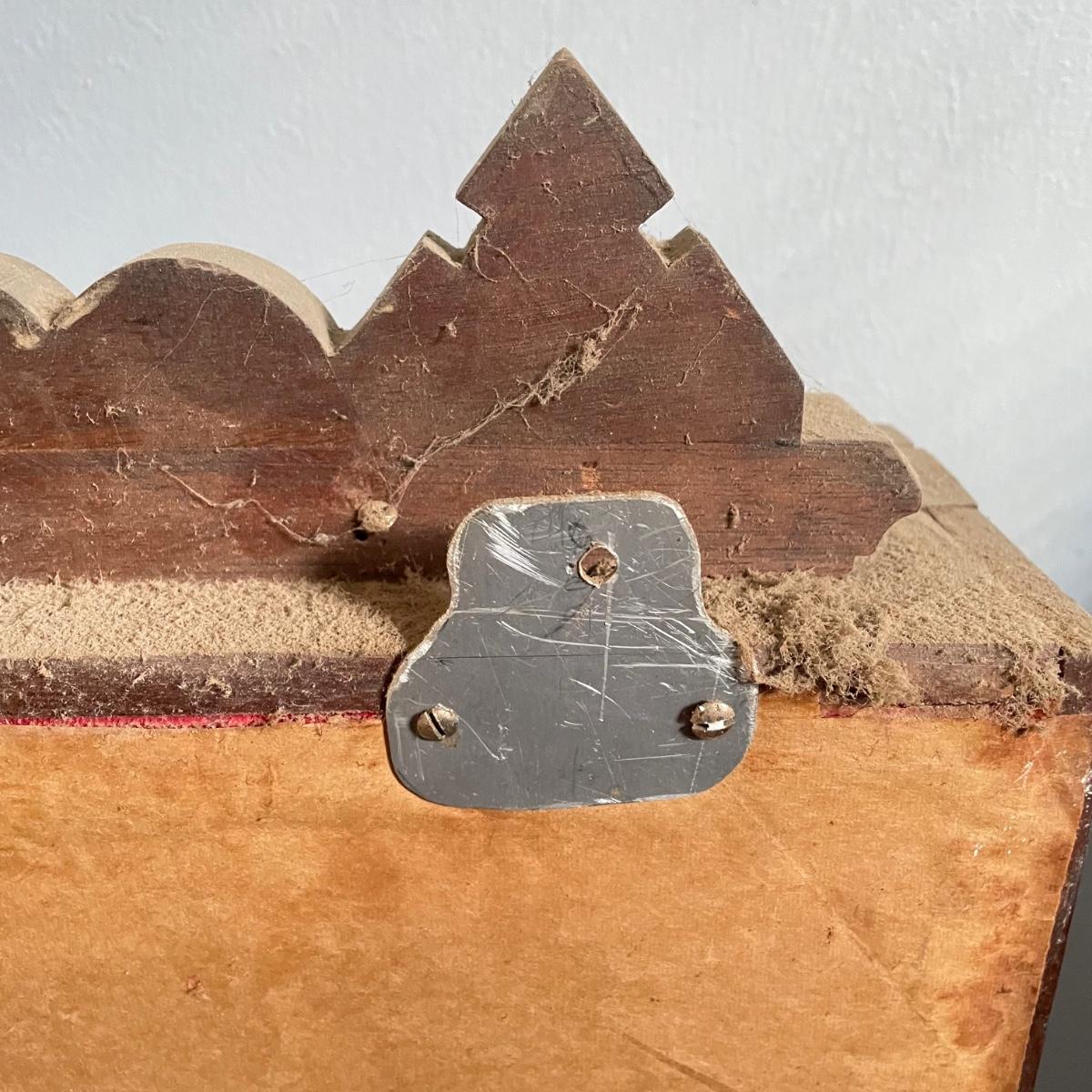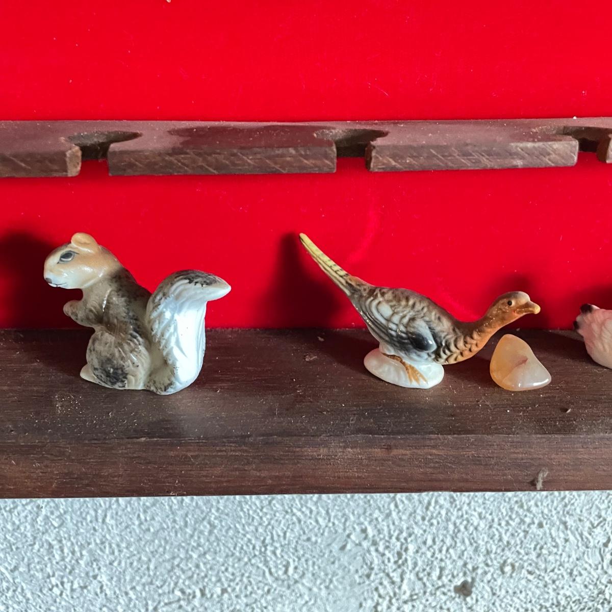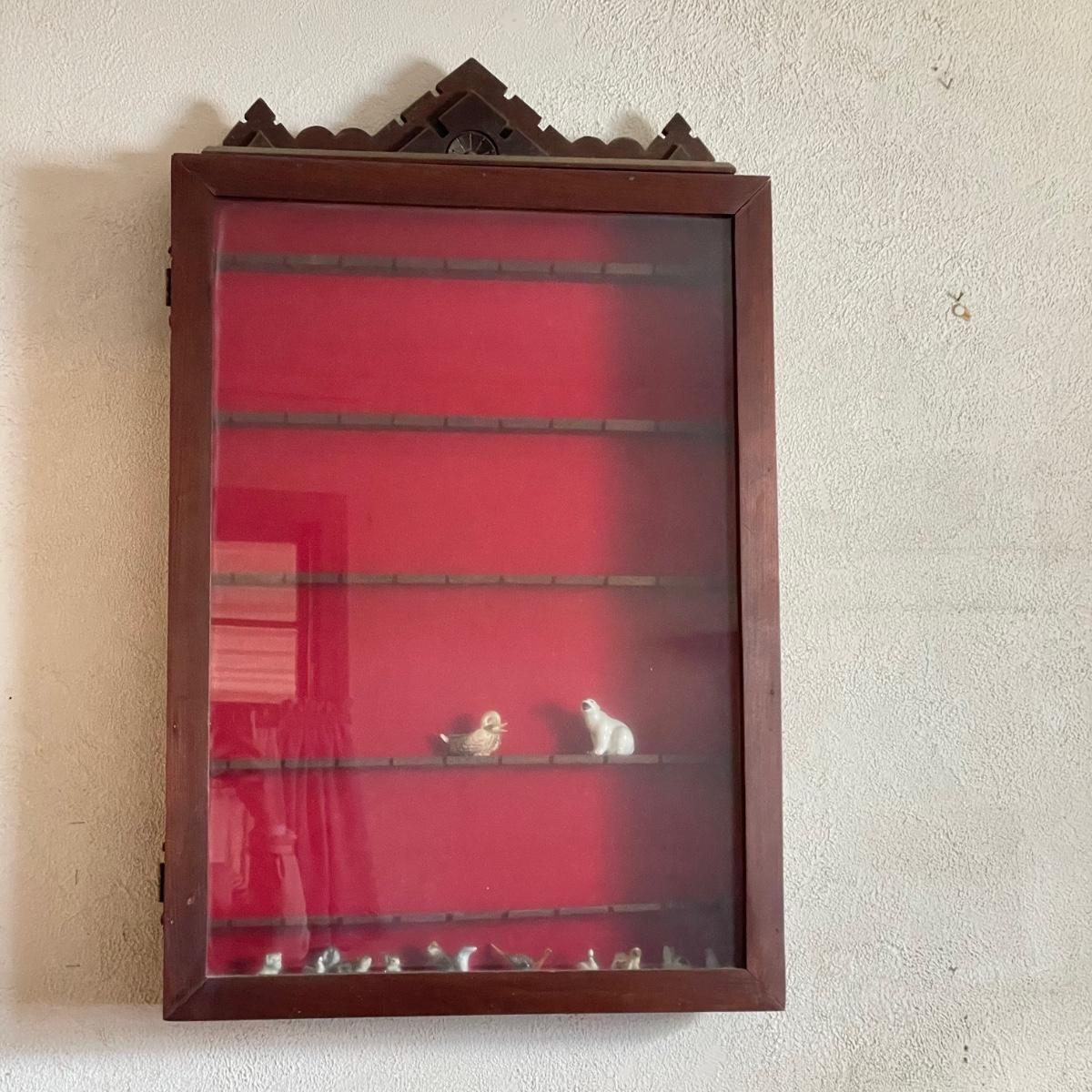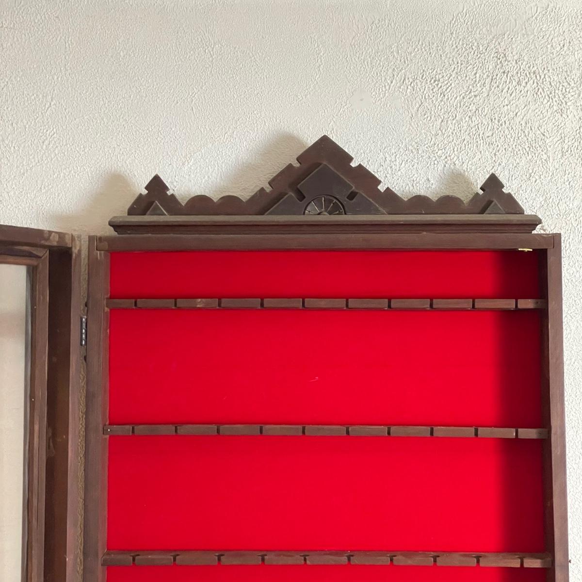 Stunning vintage shadow box measures 22” x 4.5” x 36”. Piece has five shelves carved for items like collectible spoons. The bottom shelf needs a small repair, probably glued back in place would be easily accomplished. The top of the box has nicely geometric carved designs. The red cloth lined back panel is probably velvet and has just a couple blemishes. Box starts your curio collection with small ceramic and porcelain figurines, no known markings on figures. See images. Local pick up only.