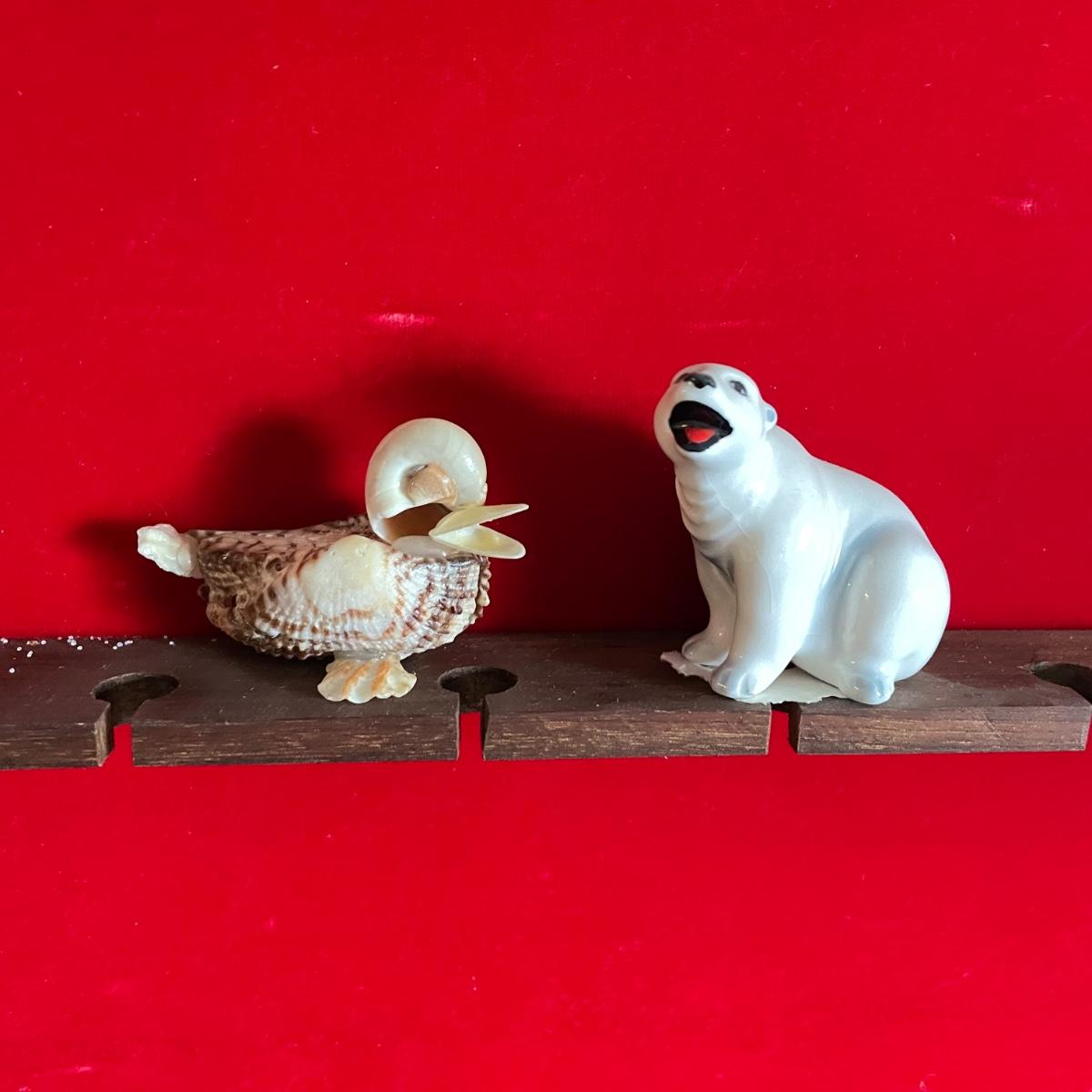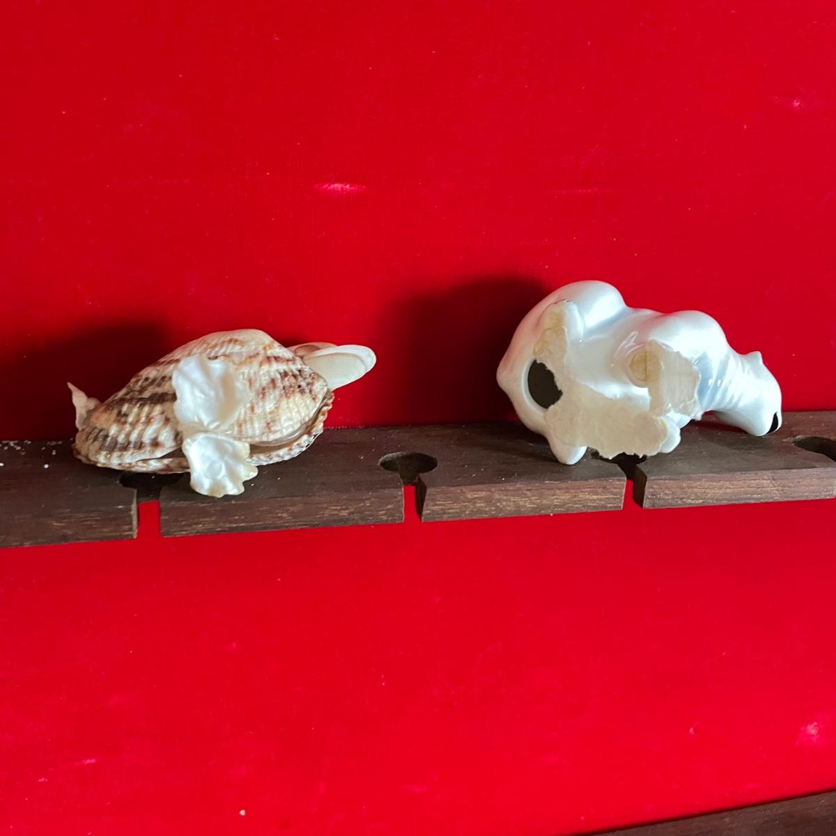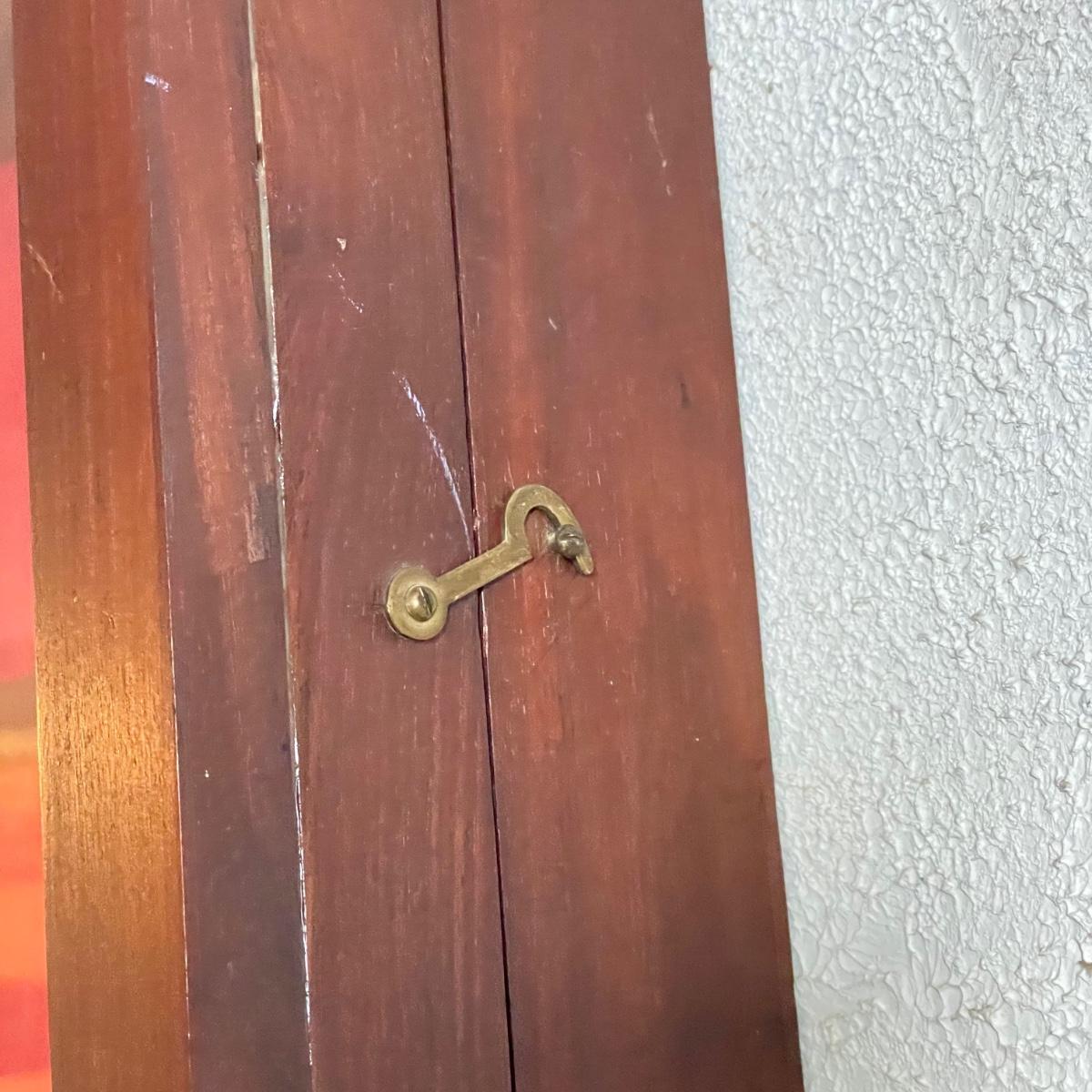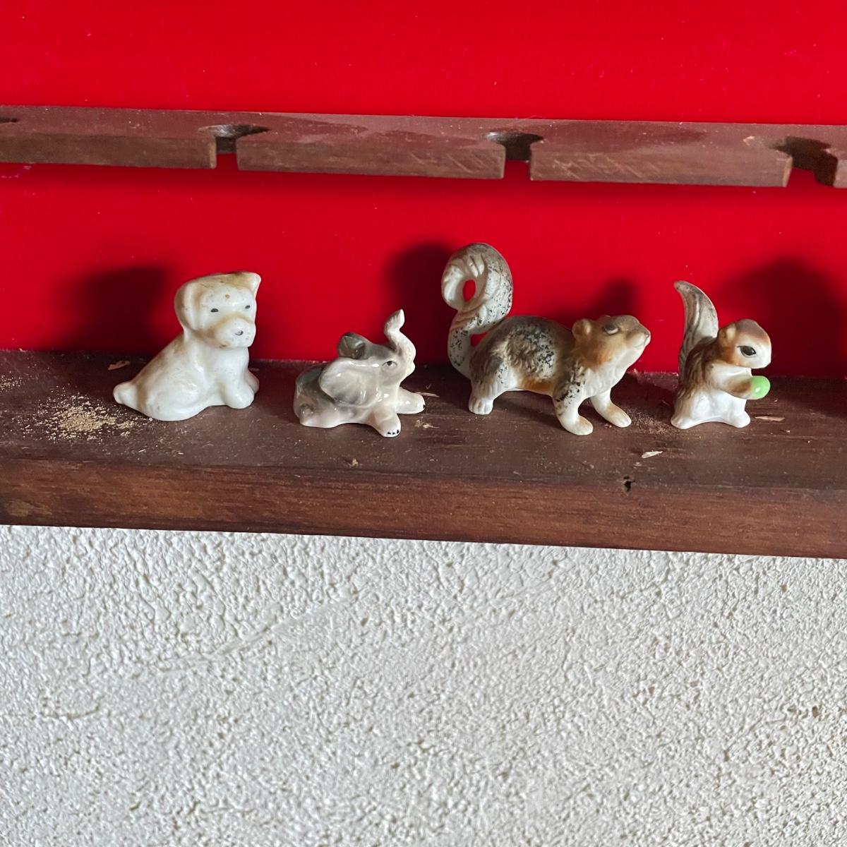 Stunning vintage shadow box measures 22” x 4.5” x 36”. Piece has five shelves carved for items like collectible spoons. The bottom shelf needs a small repair, probably glued back in place would be easily accomplished. The top of the box has nicely geometric carved designs. The red cloth lined back panel is probably velvet and has just a couple blemishes. Box starts your curio collection with small ceramic and porcelain figurines, no known markings on figures. See images. Local pick up only.