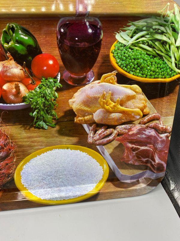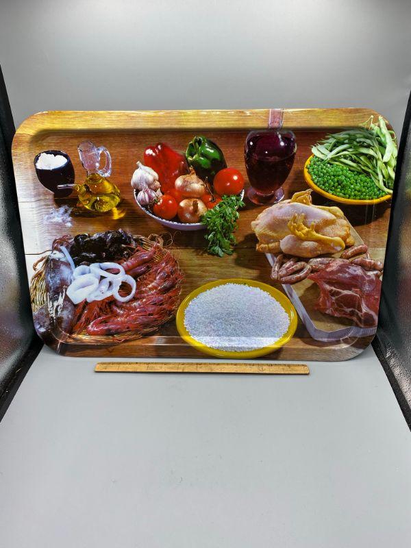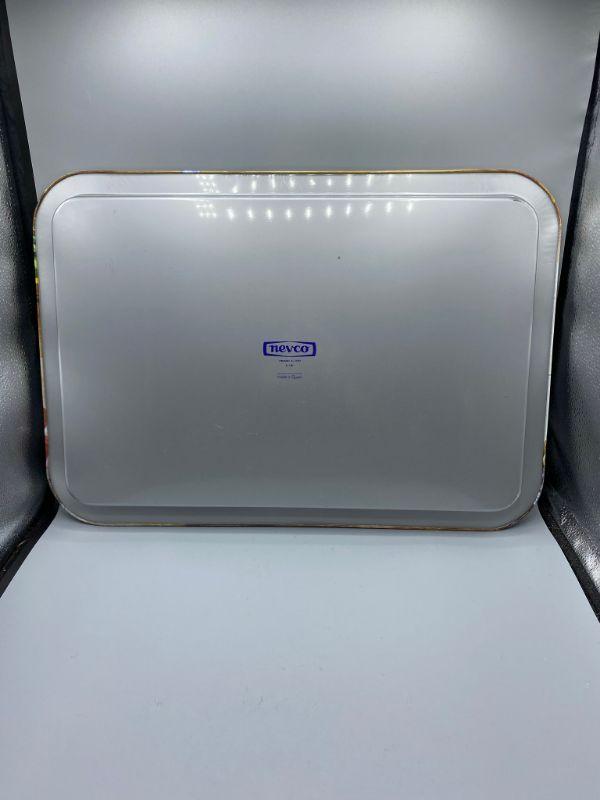 Interesting large metal serving tray. Retro style food theme. Good size, Probably close to 20". Excellent condition. Made by Nevco.