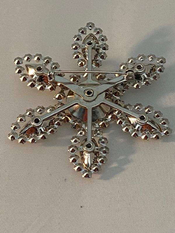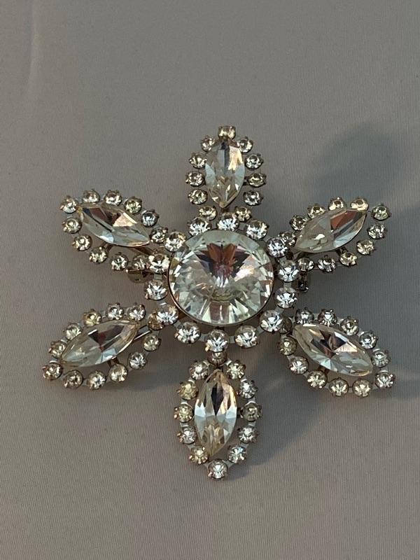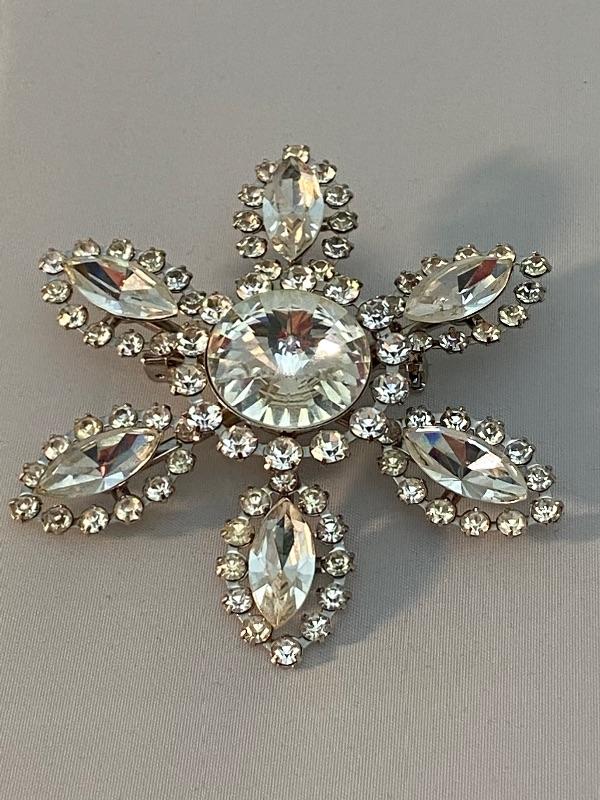 Large Rhinestone Flower Brooch. Crystal clear stones in a silvertone setting. About 2.5".