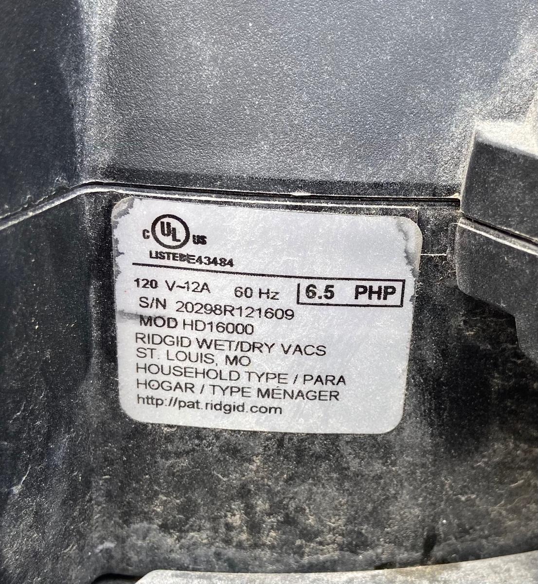 LARGE RIDGID SHOP VAC W/ATTACHMENTS MODEL HD16000