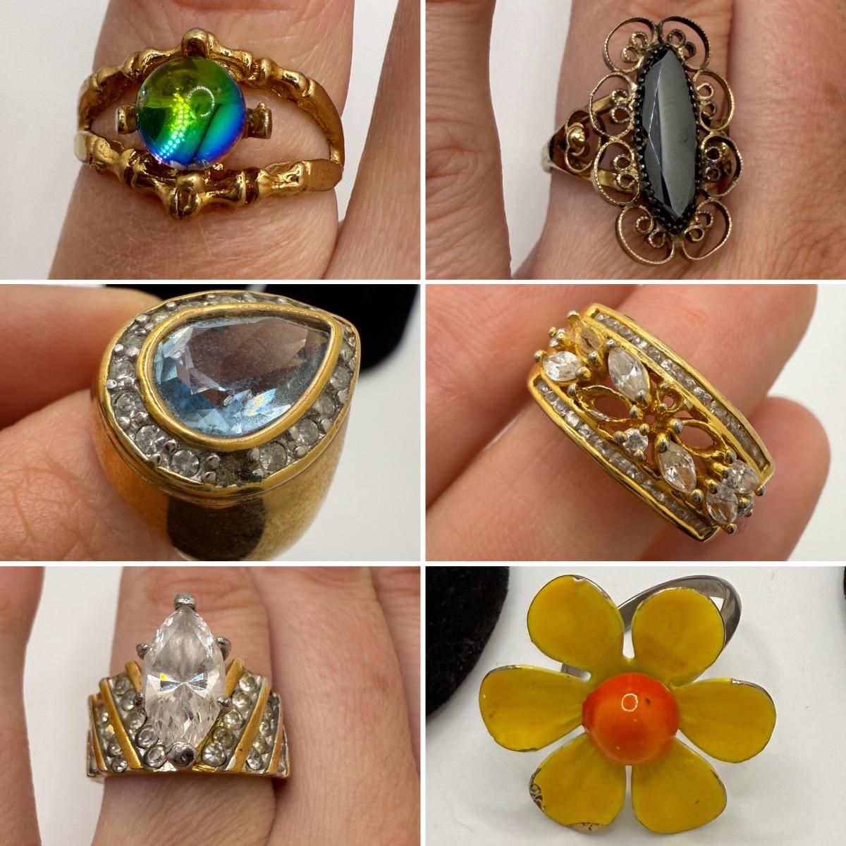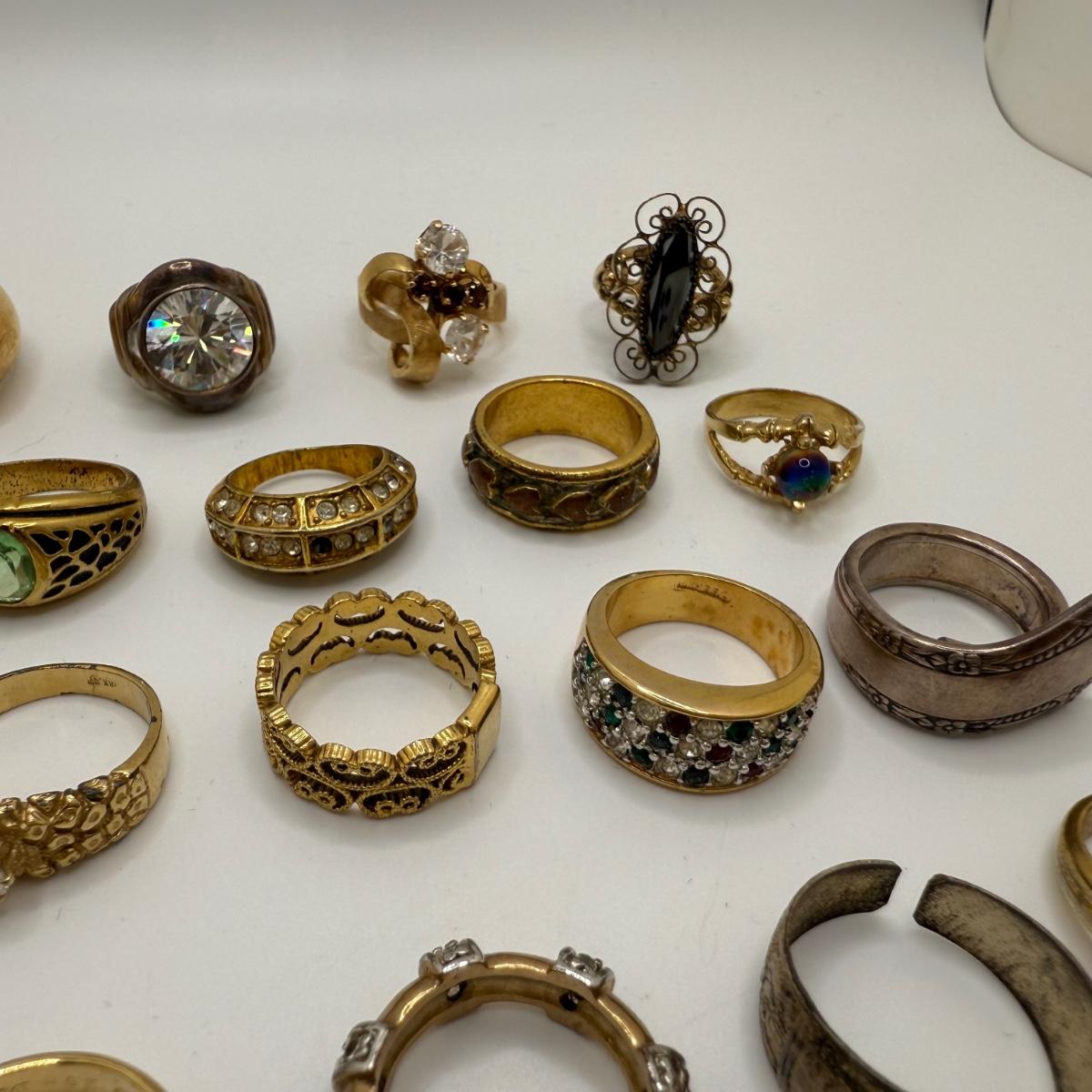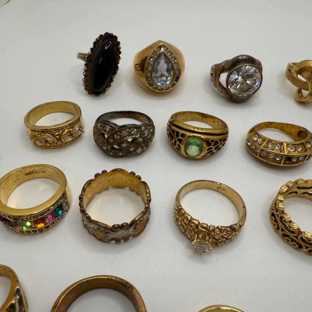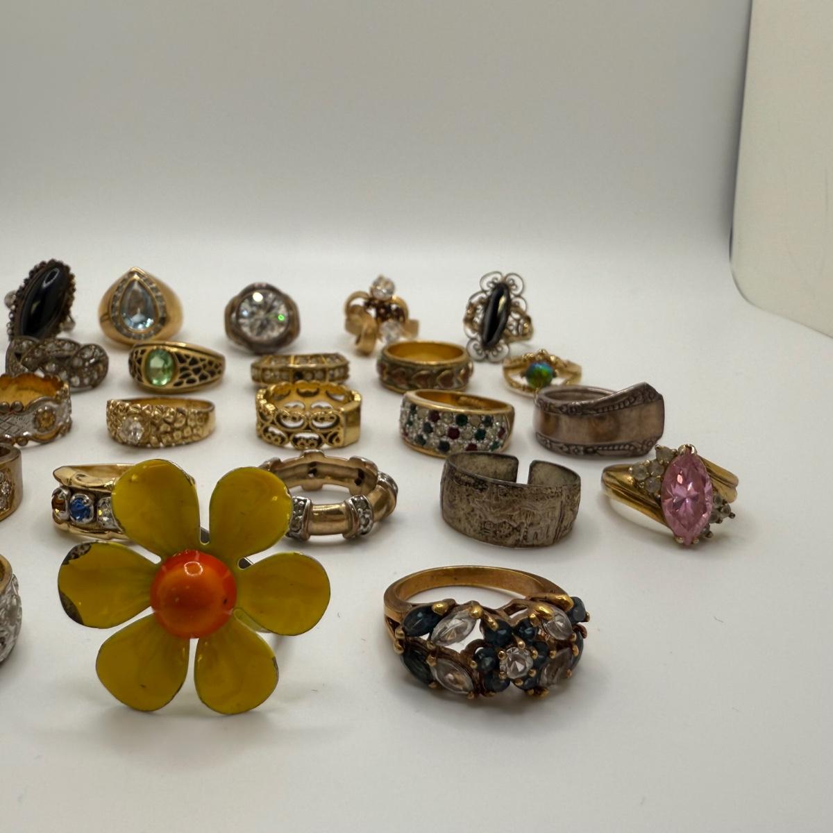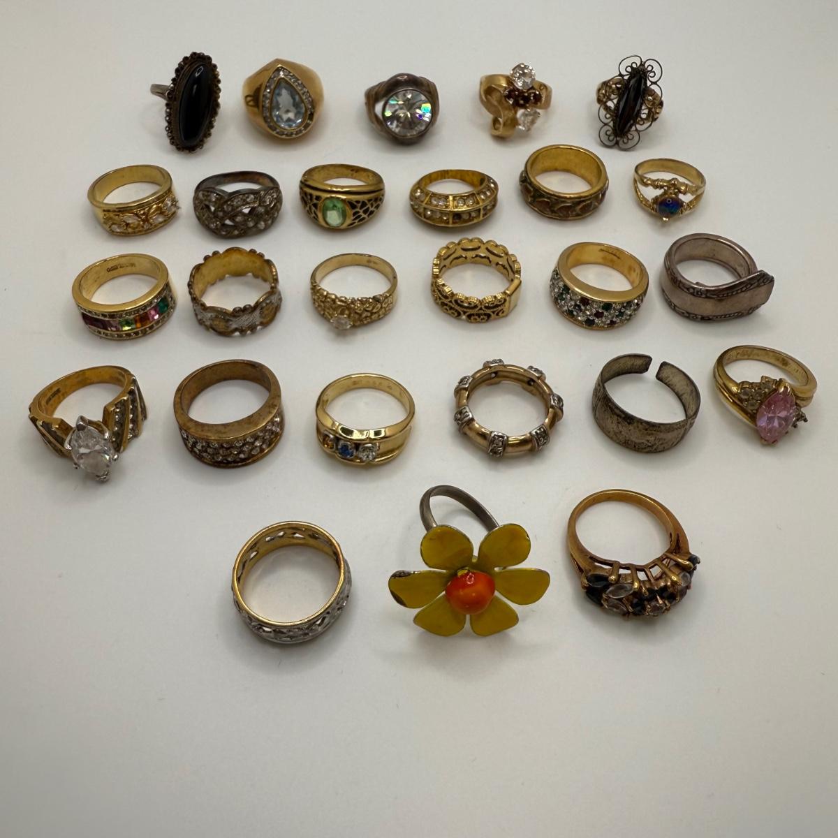 Large ring collection with 25+ rings. The two rings with the long black stones, as well as the ring with the large sparkly round gemstone and the one with a knot design, are marked as 925/Sterling (all shown together in the last photo). Many others have marks. Some overall wear and condition issues. Please see photos for inventory and details. If no picture is shown inside the band, no marking was found. Most rings are around size 6/7/8.